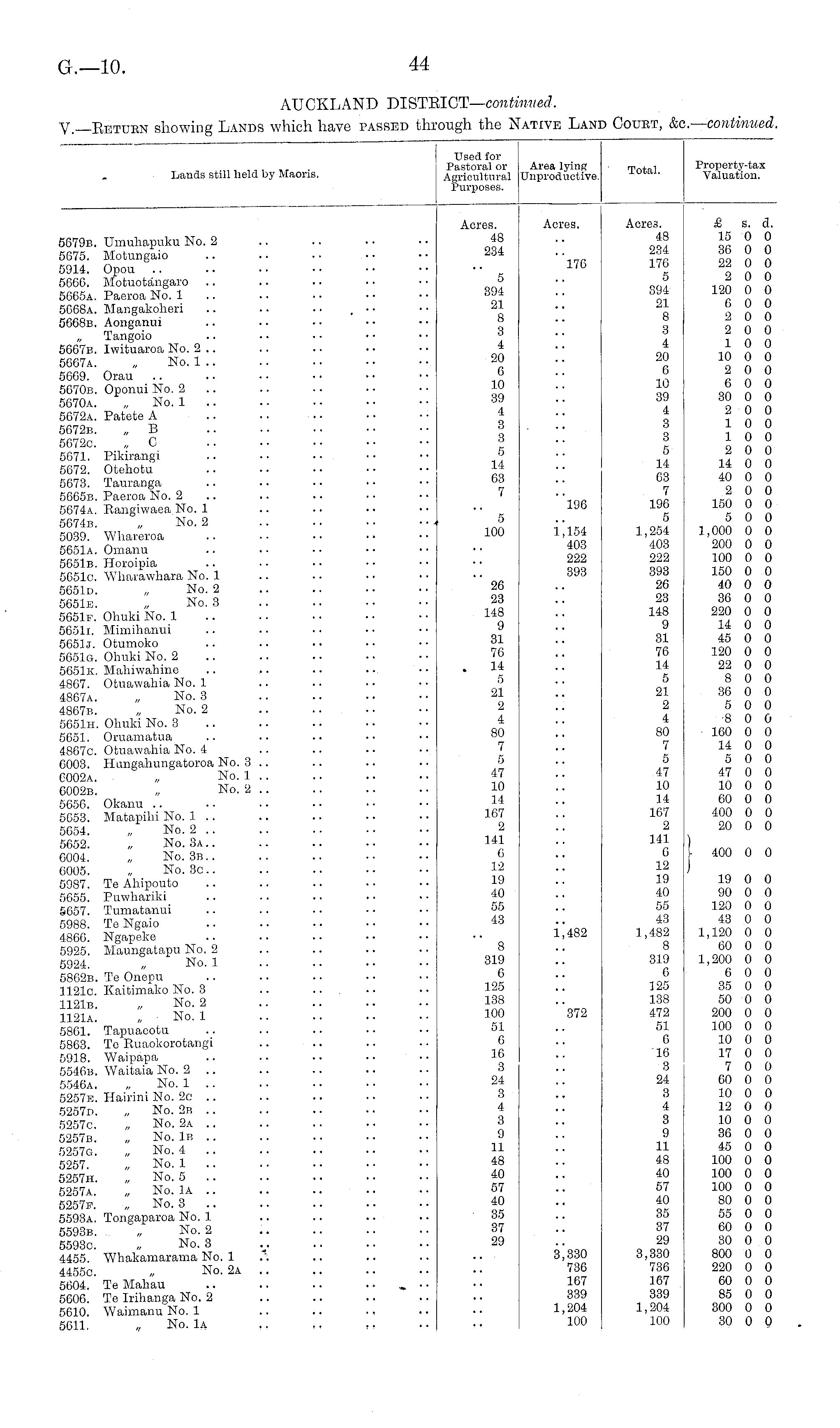 AUCKLAND DISTRICT-continued. V.—Return showing Lands which have passed through the Native Land Court, &c.— continued.