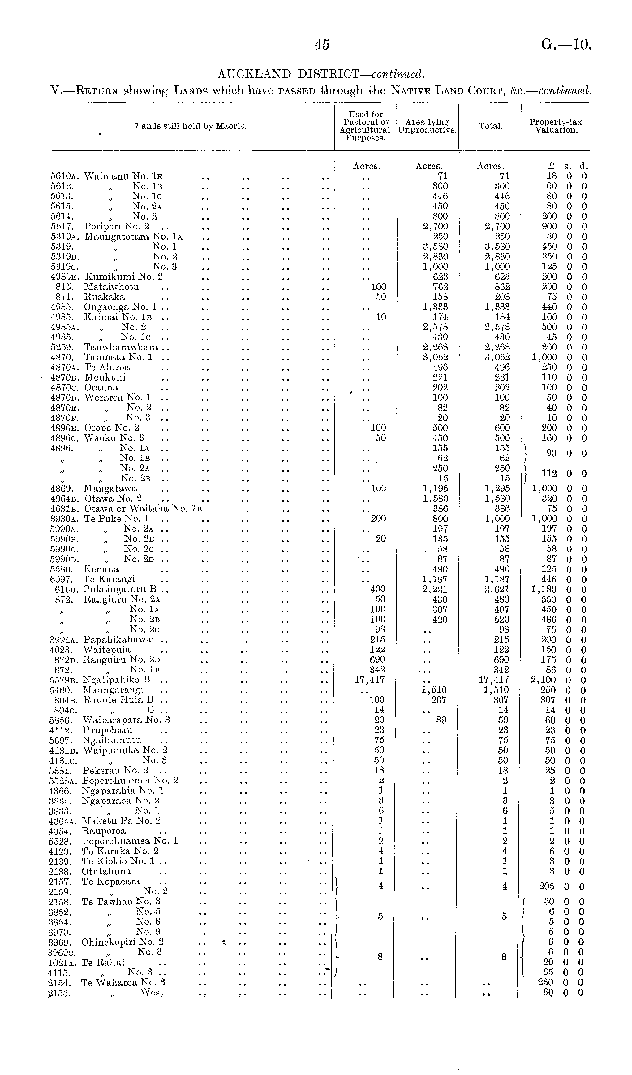 AUCKLAND DISTRICT-continued. V.—Return showing Lands which have passed through the Native Land Court, &c.— continued.