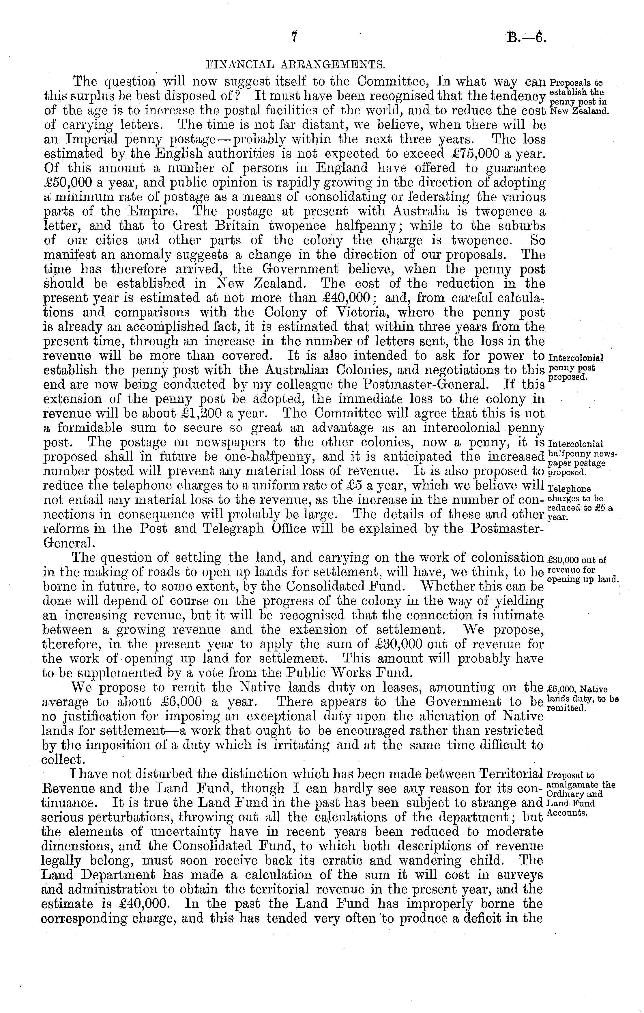 FINANCIAL AEEANGEMBNTS. The question will now suggest itself to the Committee, In what way can this surplus be best disposed of ? It must have been recognised that the tendency of the age is to increase the postal facilities of the world, and to reduce the cost of carrying letters. The time is not far distant, we believe, when there will be an Imperial penny postage—probably within the next three years. The loss estimated by the English authorities is not expected to exceed £75,000 a year. Of this amount a number of persons in England have offered to guarantee ,£50,000 a year, and public opinion is rapidly growing in the direction of adopting a minimum rate of postage as a means of consolidating or federating the various parts of the Empire. The postage at present with Australia is twopence a letter, and that to Great Britain twopence halfpenny; while to the suburbs of our cities and other parts of the colony the charge is twopence. So manifest an anomaly suggests a change in the direction of our proposals. The time has therefore arrived, the Government believe, when the penny post should be established in New Zealand. The cost of the reduction in the present year is estimated at not more than £40,000; and, from careful calculations and comparisons with the Colony of Victoria, where the penny post is already an accomplished fact, it is estimated that within three years from the present time, through an increase in the number of letters sent, the loss in the revenue will be more than covered. It is also intended to ask for power to: establish the penny post with the Australian Colonies, and negotiations to this '■ end are now being conducted by my colleague the Postmaster-General. If this ] extension of the penny post be adopted, the immediate loss to the colony in revenue will be about £1,200 a year. The Committee will agree that this is not a formidable sum to secure so great an advantage as an intercolonial penny post. The postage on newspapers to the other colonies, now a penny, it is: proposed shall in future be one-halfpenny, and it is anticipated the increased 1 number posted will prevent any material loss of revenue. It is also proposed to ] reduce the telephone charges to a uniform rate of £5 a year, which we believe will r not entail any material loss to the revenue, as the increase in the number of con- ( nections in consequence will probably be large. The details of these and other, reforms in the Post and Telegraph Office will be explained by the PostmasterGeneral. The question of settling the land, and carrying on the work of colonisation j in the making of roads to open up lands for settlement, will have, we think, to be ' borne in future, to some extent, by the Consolidated Fund. Whether this can be c done will depend of course on the progress of the colony in the way of yielding an increasing revenue, but it will be recognised that the connection is intimate between a growing revenue and the extension of settlement. We propose, therefore, in the present year to apply the sum of £30,000 out of revenue for the work of opening up land for settlement. This amount will probably have to be supplemented by a vote from the Public Works Fund. We propose to remit the Native lands duty on leases, amounting on the j average to about £6,000 a year. There appears to the Government to be \ no justification for imposing an exceptional duty upon the alienation of Native lands for settlement—a work that ought to be encouraged rather than restricted by the imposition of a duty which is irritating and at the same time difficult to collect. I have not disturbed the distinction which has been made between Territorial ] Revenue and the Land Fund, though I can hardly see any reason for its con- \ tinuance. It is true the Land Fund in the past has been subject to strange and i serious perturbations, throwing out all the calculations of the department; but l the elements of uncertainty have in recent years been reduced to moderate dimensions, and the Consolidated Fund, to which both descriptions of revenue legally belong, must soon receive back its erratic and wandering child. The Land Department has made a calculation of the sum it will cost in surveys and administration to obtain the territorial revenue in the present year, and the estimate is £40,000. In the past the Land Fund has improperly borne the corresponding charge, and this has tended very often to produce a deficit in the