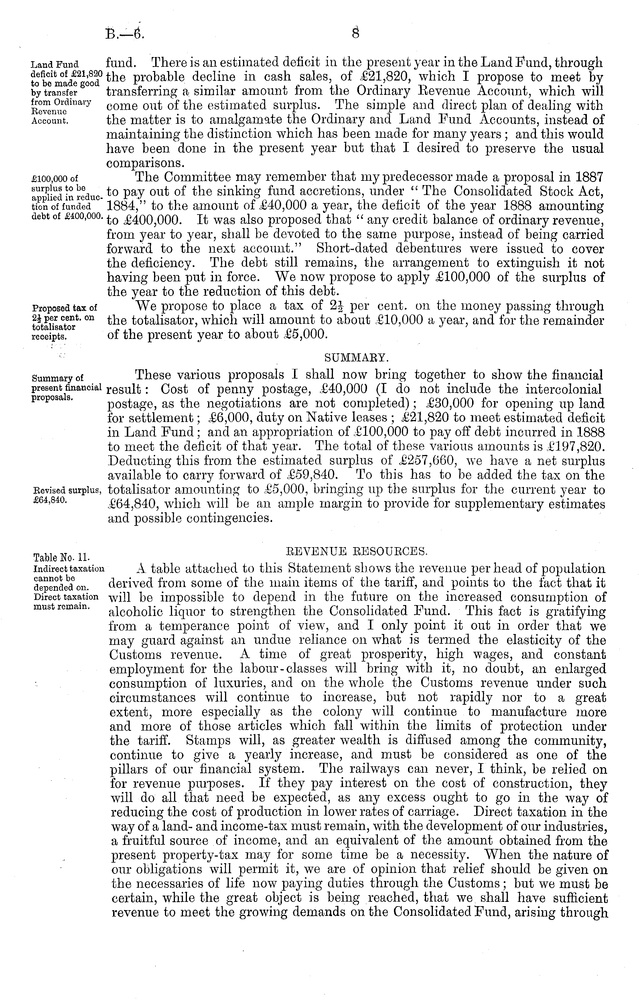 fund. There is an estimated deficit in the present year in the Land Fund, through the probable decline in cash sales, of .£21,820, which I propose to meet by transferring a similar amount from the Ordinary Eevenue Account, which will come out of the estimated surplus. The simple and direct plan of dealing with the matter is to amalgamate the Ordinary and Land Fund Accounts, instead of maintaining the distinction which has been made for many years ; and this would have been done in the present year but that I desired to preserve the usual comparisons. The Committee may remember that my predecessor made a proposal in 1887 to pay out of the sinking fund accretions, under " The Consolidated Stock Act, 1884," to the amount of ,£40,000 a year, the deficit of the year 1888 amounting to ,£400,000. It was also proposed that " any credit balance of ordinary revenue, from year to year, shall be devoted to the same purpose, instead of being carried forward to the next account." Short-dated debentures were issued to cover the deficiency. The debt still remains, the arrangement to extinguish it not having been put in force. We now propose to apply £100,000 of the surplus of the year to the reduction of this debt. We propose to place a tax of 2J per cent, on the money passing through the totalisator, which will amount to about £10,000 a year, and for the remainder of the present year to about £5,000. SUMMAEY. These various proposals I shall now bring together to show the financial result: Cost of penny postage, .£40,000 (I do not include the intercolonial postage, as the negotiations are not completed); .£30,000 for opening up land for settlement; £6,000, duty on Native leases ; £21,820 to meet estimated deficit in Land Fund ; and an appropriation of £100,000 to pay off debt incurred in 1888 to meet the deficit of that year. The total of these various amounts is £197,820. Deducting this from the estimated surplus of £257,660, we have a net surplus available to carry forward of £59,840. To this has to be added the tax on the totalisator amounting to £5,000, bringing up the surplus for the current year to £64,840, which will be an ample margin to provide for supplementary estimates and possible contingencies. EEVENDB EBSOUECES. i A table attached to this Statement shows the revenue per head of population derived from some of the main items of the tariff, and points to the fact that it will be impossible to depend in the future on the increased consumption of alcoholic liquor to strengthen the Consolidated Fund. This fact is gratifying from a temperance point of view, and I only point it out in order that we may guard against an undue reliance on what is termed the elasticity of the Customs revenue. A time of great prosperity, high wages, and constant employment for the labour-classes will bring with it, no doubt, an enlarged consumption of luxuries, and on the whole the Customs revenue under such circumstances will continue to increase, but not rapidly nor to a great extent, more especially as the colony will continue to manufacture more and more of those articles which fall within the limits of protection under the tariff. Stamps will, as greater wealth is diffused among the community, continue to give a yearly increase, and must be considered as one of the pillars of our financial system. The railways can never, I think, be relied on for revenue purposes. If they pay interest on the cost of construction, they will do all that need be expected, as any excess ought to go in the way of reducing the cost of production in lower rates of carriage. Direct taxation in the way of a land- and income-tax must remain, with the development of our industries, a fruitful source of income, and an equivalent of the amount obtained from the present property-tax may for some time be a necessity. When the nature of our obligations will permit it, we are of opinion that relief should be given on the necessaries of life now paying duties through the Customs; but we must be certain, while the great object is being reached, that we shall have sufficient revenue to meet the growing demands on the Consolidated Fund, arising through