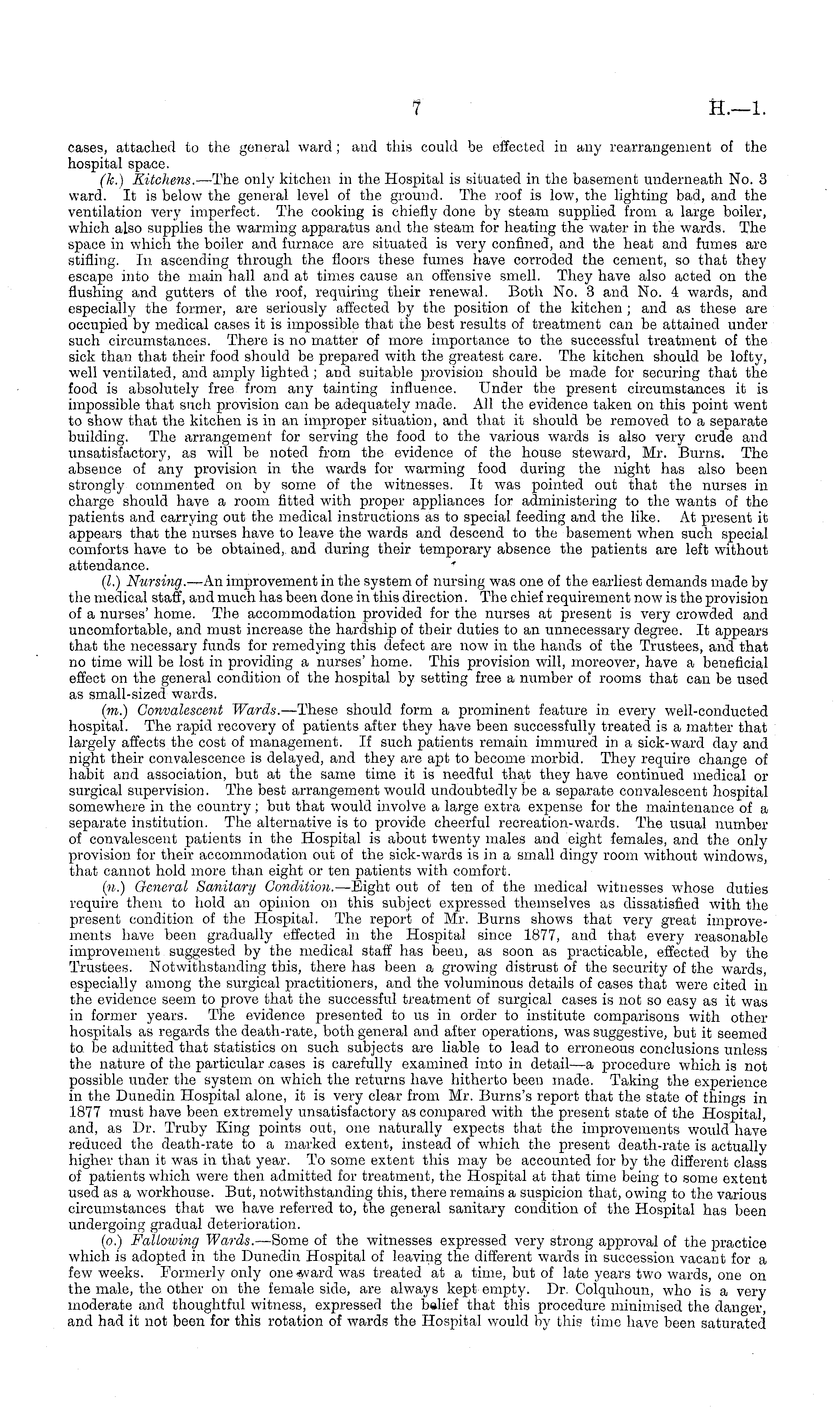cases, attacked to the general ward; and this could be effected in any rearrangement of the hospital space. (k.) Kitchens. —The only kitchen in the Hospital is situated in the basement underneath No. 3 ward. It is below the general level of the ground. The roof is low, the lighting bad, and the ventilation very imperfect. The cooking is chiefly done by steam supplied from a large boiler, which also supplies the warming apparatus and the steam for heating the water in the wards. The space in which the boiler and furnace are situated is very confined, and the heat and fumes are stifling. In ascending through the floors these fumes have corroded the cement, so that they escape into the main hall and at times cause an offensive smell. They have also acted on the flushing and gutters of the roof, requiring their renewal. Both No. 3 and No. 4 wards, and especially the former, are seriously affected by the position of the kitchen ; and as these are occupied by medical cases it is impossible that the best results of treatment can be attained under such circumstances. There is no matter of more importance to the successful treatment of the sick than that their food should be prepared with the greatest care. The kitchen should be lofty, well ventilated, and amply lighted ; and suitable provision should be made for securing that the food is absolutely free from any tainting influence. Under the present circumstances it is impossible that such provision can be adequately made. All the evidence taken on this point went to show that the kitchen is in an improper situation, and that it should be removed to a separate building. The arrangement for serving the food to the various wards is also very crude and unsatisfactory, as will be noted from the evidence of the house steward, Mr. Burns. The absence of any provision in the wards for warming food during the night has also been strongly commented on by some of the witnesses. It was pointed out that the nurses in charge should have a room fitted with proper appliances for administering to the wants of the patients and carrying out the medical instructions as to special feeding and the like. At present it appears that the nurses have to leave the wards and descend to the basement when such special comforts have to be obtained, and during their temporary absence the patients are left without attendance. (I.) Nursing. —An improvement in the system of nursing was one of the earliest demands made by the medical staff, and much has been done in this direction. The chief requirement now is the provision of a nurses' home. The accommodation provided for the nurses at present is very crowded and uncomfortable, and must increase the hardship of their duties to an unnecessary degree. It appears that the necessary funds for remedying this defect are now in the hands of the Trustees, and that no time will be lost in providing a nurses' home. This provision will, moreover, have a beneficial effect on the general condition of the hospital by setting free a number of rooms that can be used as small-sized wards. (to.) Convalescent Wards. —These should form a prominent feature in every well-conducted hospital. The rapid recovery of patients after they have been successfully treated is a matter that largely affects the cost of management. If such patients remain immured in a sick-ward day and night their convalescence is delayed, and they are apt to become morbid. They require change of habit and association, but at the same time it is needful that they have continued medical or surgical supervision. The best arrangement would undoubtedly be a separate convalescent hospital somewhere in the country; but that would involve a large extra expense for the maintenance of a separate institution. The alternative is to provide cheerful recreation-wards. The usual number of convalescent patients in the Hospital is about twenty males and eight females, and the only provision for their accommodation out of the sick-wards is in a small dingy room without windows, that cannot hold more than eight or ten patients with comfort. (n.) General Sanitary Condition. —Bight out of ten of the medical witnesses whose duties require them to hold an opinion on this subject expressed themselves as dissatisfied with the present condition of the Hospital. The report of Mr. Burns shows that very great improvements have been gradually effected in the Hospital since 1877, and that every reasonable improvement suggested by the medical staff has been, as soon as practicable, effected by the Trustees. Notwithstanding this, there has been a growing distrust of the security of the wards, especially among the surgical practitioners, and the voluminous details of cases that were cited in the evidence seem to prove that the successful treatment of surgical cases is not so easy as it was in former years. The evidence presented to us in order to institute comparisons with other hospitals as regards the death-rate, both general and after operations, was suggestive, but it seemed to be admitted that statistics on such subjects are liable to lead to erroneous conclusions unless the nature of the particular .cases is carefully examined into in detail—a procedure which is not possible under the system on which the returns have hitherto been made. Taking the experience in the Dunedin Hospital alone, it is very clear from Mr. Burns's report that the state of things in 1877 must have been extremely unsatisfactory as compared with the present state of the Hospital, and, as Dr. Truby King points out, one naturally expects that the improvements would have reduced the death-rate to a marked extent, instead of which the present death-rate is actually higher than it was in that year. To some extent this may be accounted for by the different class of patients which were then admitted for treatment, the Hospital at that time being to some extent used as a workhouse. But, notwithstanding this, there remains a suspicion t