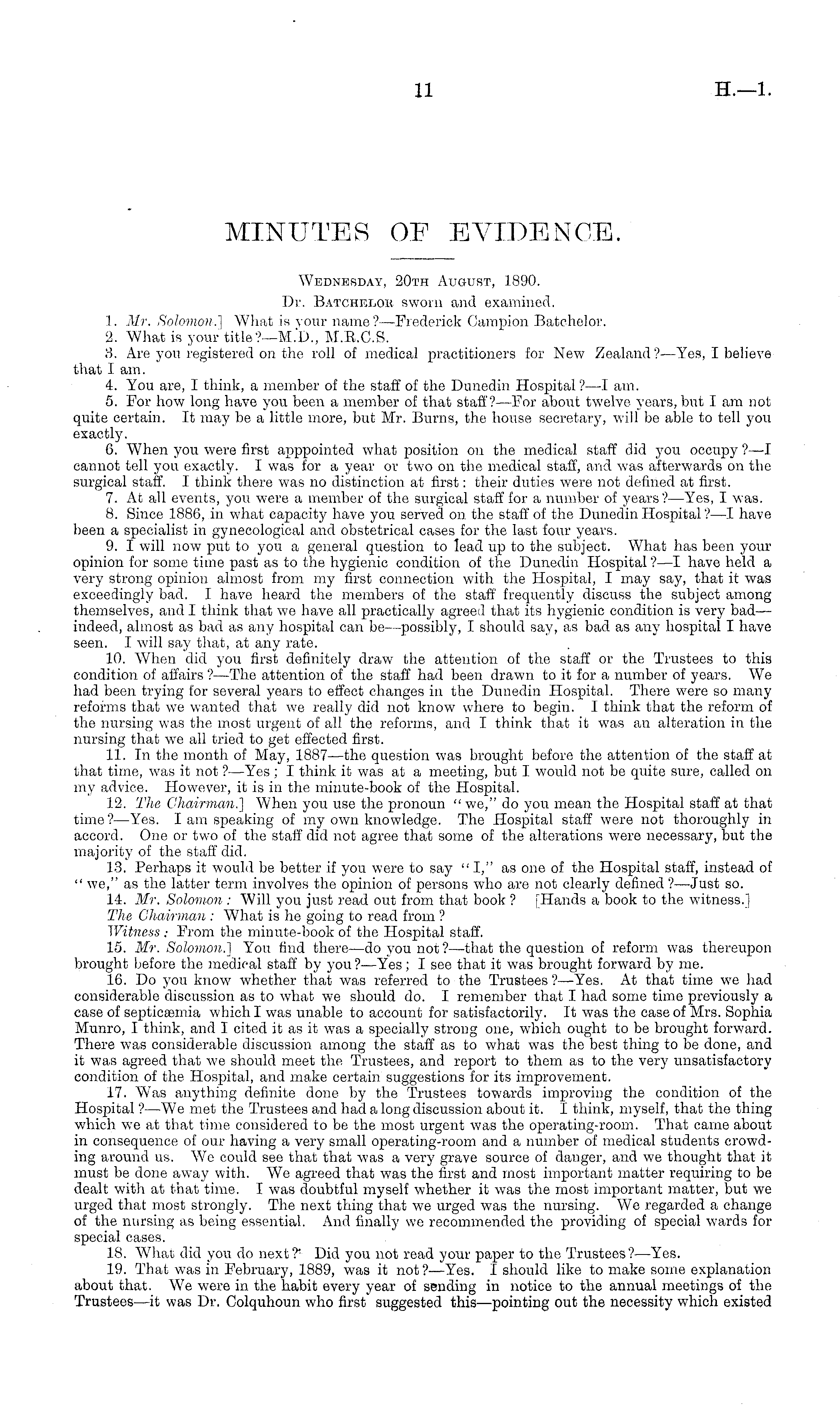 Wednesday, 20th August, 1890. Dr. Batohbloe sworn and examined. 1. Mr. Solomon.] What is your name?— Frederick Campion Batcholor. 2. What is your title?—M.D., M.E.C.S. 3. Are you registered on the roll of medical practitioners for New Zealand?— Yes, I believe that I am. 4. You are, I think, a member of the staff of the Dunedin Hospital ? —I am. 5. For how long have you been a member of that staff?— For about twelve years, but lam not quite certain. It may be a little more, but Mr. Burns, the house secretary, will be able to tell you exactly. G. When you were first apppointed what position on the medical staff did you occupy ?—I cannot tell you exactly. I was for a year or two on the medical staff, and was afterwards on the surgical staff. I think there was no distinction at first: their duties were not defined at first. 7. At all events, you were a member of the surgical staff for a number of years?— Yes, I was. 8. Since 1886, in what capacity have you served on the staff of the Dunedin Hospital ?—I have been a specialist in gynecological and obstetrical cases for the last four years. 9. I will now put to you a general question to lead up to the subject. What has been your opinion for some time past as to the hygienic condition of the Dunedin Hospital ?—I have held a very strong opinion almost from my first connection with the Hospital, I may say, that it was exceedingly bad. I have heard the members of the staff frequently discuss the subject among themselves, and I think that we have all practically agreed that its hygienic condition is very bad— indeed, almost as bad as any hospital can be —possibly, I should say, as bad as any hospital I have seen. I will say that, at any rate. 10. When did you first definitely draw the attention of the staff or the Trustees to this condition of affairs ? —The attention of the staff had been drawn to it for a number of years. We had been trying for several years to effect changes in the Dunedin Hospital. There were so many reforms that we wanted that we really did not know where to begin. I think that the reform of the nursing was the most urgent of all the reforms, and I think that it was an alteration in the nursing that we all tried to get effected first. 11. In the month of May, 1887 —the question was brought before the attention of the staff at that time, was it not ?—Yes ; I think it was at a meeting, but I would not be quite sure, called on my advice. However, it is in the minute-book of the Hospital. 12. The Chairman.] When you use the pronoun " we," do you mean the Hospital staff at that time?— Yes. lam speaking of my own knowledge. The Hospital staff were not thoroughly in accord. One or two of the staff did not agree that some of the alterations were necessary, but the majority of the staff did. 18. Perhaps it would be better if you were to say " I," as one of the Hospital staff, instead of " we," as the latter term involves the opinion of persons who are not clearly defined ?—Just so. 14. Mr. Solomon : Will you just read out from that book ? [Hands a book to the witness.] The Chairman : What is he going to read from ? Witness : From the minute-book of the Hospital staff. 15. Mr. Solomon.] You find there—do you not?—that the question of reform was thereupon brought before the medical staff by you?— Yes; I see that it was brought forward by me. 16. Do you know whether that was referred to the Trustees ?—Yes. At that time we had considerable discussion as to what we should do. I remember that I had some time previously a ease of septicaemia which I was unable to account for satisfactorily. It was the case of Mrs. Sophia Munro, I think, and I cited it as it was a specially strong one, which ought to be brought forward. There was considerable discussion among the staff as to what was the best thing to be done, and it was agreed that we should meet the Trustees, and report to them as to the very unsatisfactory condition of the Hospital, and make certain suggestions for its improvement. 17. Was anything definite done by the Trustees towards improving the condition of the Hospital ?—We met the Trustees and had a long discussion about it. I think, myself, that the thing which we at that time considered to be the most urgent was the operating-room. That came about in consequence of our having a very small operating-room and a number of medical students crowding around us. We could see that that was a very grave source of danger, and we thought that it must be done away with. We agreed that was the first and most important matter requiring to be dealt with at that time. I was doubtful myself whether it was the most important matter, but we urged that most strongly. The next thing that we urged was the nursing. We regarded a change of the nursing as being essential. And finally we recommended the providing of special wards for special cases. 18. What did you do next? Did you not read your paper to the Trustees?— Yes. 19. That was in February, 1889, was it not?— Yes. I should like to make some explanation about that. We were in the habit every year of sending in notice to the annual meetings of the Trustees—it was Dr. Colquhoun who first suggested this—pointing out the necessity which existed