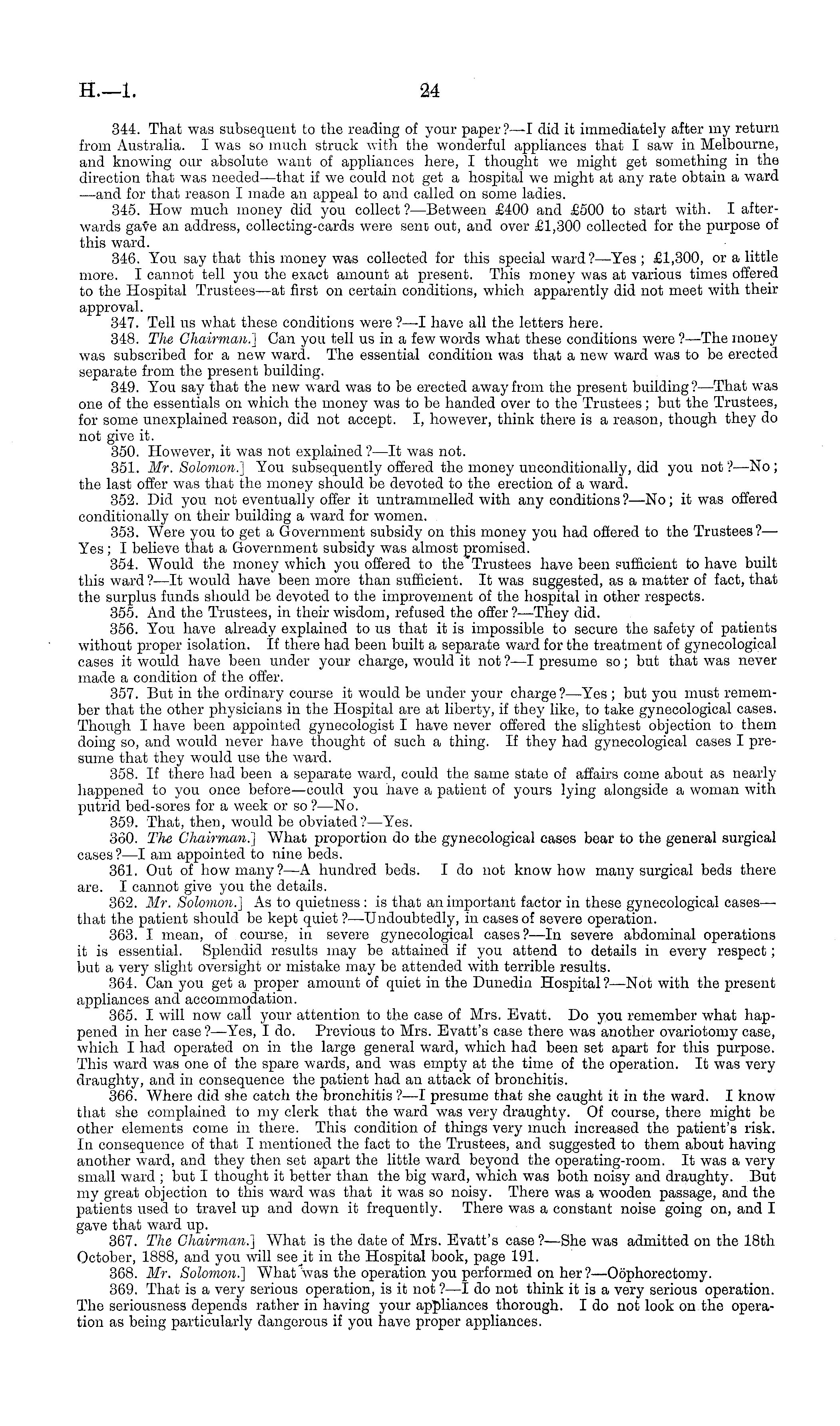 344. That was subsequent to the reading of your paper?—l did it immediately after my return from Australia. I was so much struck with the wonderful appliances that I saw in Melbourne, and knowing our absolute want of appliances here, I thought we might get something in the direction that was needed—that if we could not get a hospital we might at any rate obtain a ward —and for that reason I made an appeal to and called on some ladies. 345. How much money did you collect ?—Between £400 and £500 to start with. I afterwards gave an address, collecting-cards were sent, out, and over £1,300 collected for the purpose of this ward. 346. You say that this money was collected for this special ward?— Yes; £1,300, or a little more. I cannot tell you the exact amount at present. This money was at various times offered to the Hospital Trustees—at first on certain conditions, which apparently did not meet with their approval. 347. Tell us what these conditions were ?—-I have all the letters here. 348. The Chairman.'] Can you tell us in a few words what these conditions were ? —The money was subscribed for a new ward. The essential condition was that a new ward was to be erected separate from the present building. 349. You say that the new ward was to be erected away from the present building? —That was one of the essentials on which the money was to be handed over to the Trustees; but the Trustees, for some unexplained reason, did not accept. I, however, think there is a reason, though they do not give it. 350. However, it was not explained ? —lt was not. 351. Mr. Solomon^ You subsequently offered the money unconditionally, did you not ? —-No ; the last offer was that the money should be devoted to the erection of a ward. 352. Did you not eventually offer it untrammelled with any conditions?—No; it was offered conditionally on their building a ward for women. 353. Were you to get a Government subsidy on this money you had offered to the Trustees ?— Yes; I believe that a Government subsidy was almost promised. 354. Would the money which you offered to the Trustees have been sufficient to have built this ward? —It would have been more than sufficient. It was suggested, as a matter of fact, that the surplus funds should be devoted to the improvement of the hospital in other respects. 355. And the Trustees, in their wisdom, refused the offer?— They did. 356. You have already explained to us that it is impossible to secure the safety of patients without proper isolation. If there had been built a separate ward for the treatment of gynecological cases it would have been under your charge, would it not ?—I presume so; but that was never made a condition of the offer. 357. But in the ordinary course it would be under your charge?— Yes ; but you must remember that the other physicians in the Hospital are at liberty, if they like, to take gynecological cases. Though I have been appointed gynecologist I have never offered the slightest objection to them doing so, and would never have thought of such a thing. If they had gynecological cases I presume that they would use the ward. 358. If there had been a separate ward, could the same state of affairs come about as nearly happened to you once before—could you have a patient of yours lying alongside a woman with putrid bed-sores for a week or so ?—No. 359. That, then, would be obviated?— Yes. 360. The Chairman.'] What proportion do the gynecological cases bear to the general surgical cases? —I am appointed to nine beds. 361. Out of how many? —A hundred beds. Ido not know how many surgical beds there are. I cannot give you the details. 362. Mr. Solomon.] As to quietness :is that an important factor in these gynecological cases— that the patient should be kept quiet ? —Undoubtedly, in cases of severe operation. 363. I mean, of course, in severe gynecological cases? —In severe abdominal operations it is essential. Splendid results may be attained if you attend to details in every respect; but a very slight oversight or mistake may be attended with terrible results. 364. Can you get a proper amount of quiet in the Dunedin Hospital?— Not with the present appliances and accommodation. 365. I will now call your attention to the case of Mrs. Evatt. Do you remember what happened in her case ?—Yes, I do. Previous to Mrs. Bvatt's case there was another ovariotomy case, which I had operated on in the large general ward, which had been set apart for this purpose. This ward was one of the spare wards, and was empty at the time of the operation. It was very draughty, and in consequence the patient had an attack of bronchitis. 366. Where did she catch the bronchitis ?—I presume that she caught it in the ward. I know that she complained to my clerk that the ward was very draughty. Of course, there might be other elements come in there. This condition of things very much increased the patient's risk. In consequence of that I mentioned the fact to the Trustees, and suggested to them about having another ward, and they then set apart the little ward beyond the operating-room. It was a very small ward ; but I thought it better than the big ward, which was both noisy and draughty. But my great objection to this ward was that it was so noisy. There was a wooden passage, and the patients used to travel up and down it frequently. There was a constant noise going on, and I gave that ward up. 367. The Chairman.] What is the date of Mrs. Bvatt's case ?—She was admitted on the 18th October, 1888, and you will see it in the Hospital book, page 191. 368. Mr. Solomon.] What was the operation you performed on her ?—Oophorectomy. 369. That is a very serious operation, is it not ?—I do not think it is a very serious operation. The seriousness depends rather in having your appliances thorough. Ido not look on the operation as being particularly dangerous if you have proper appliances.