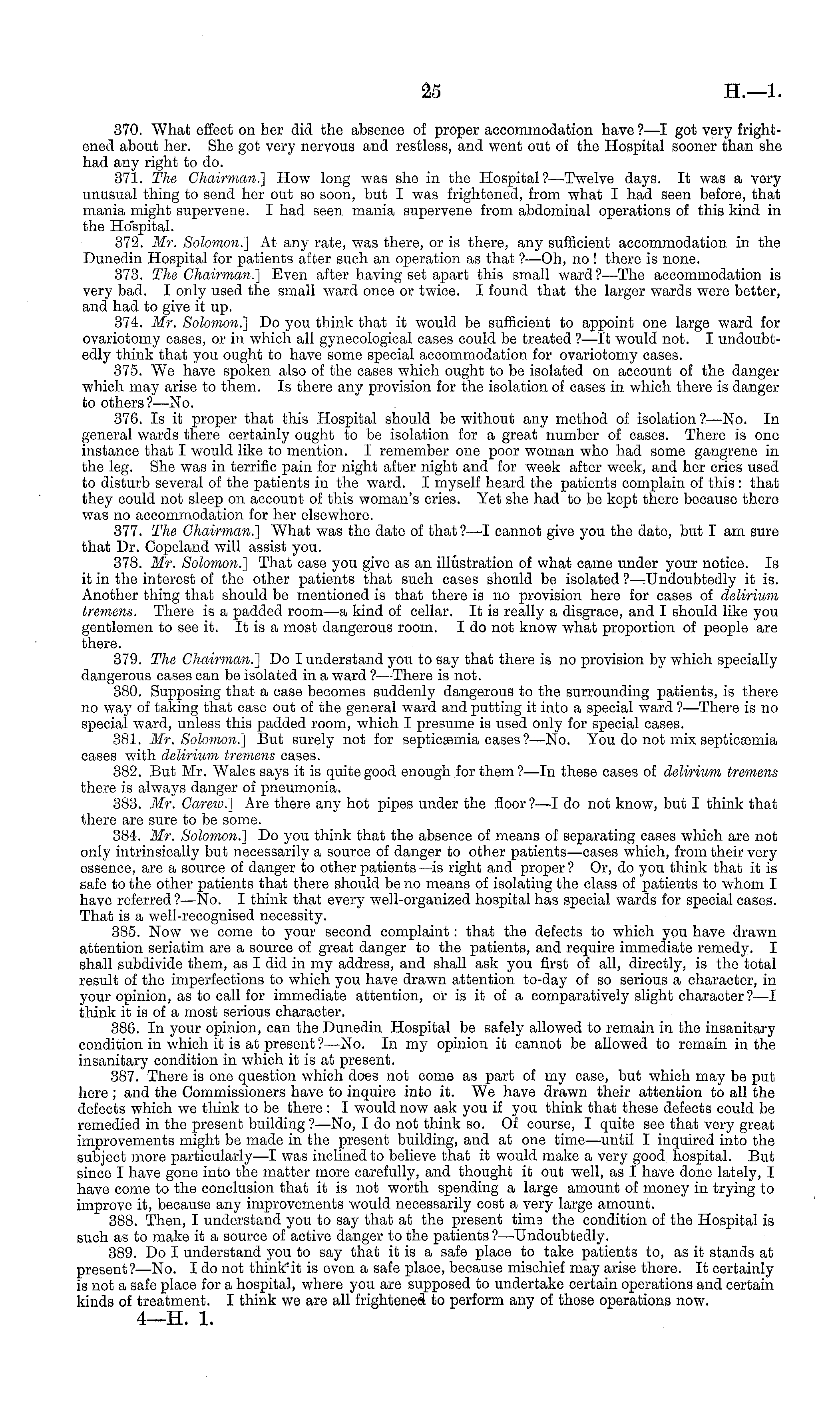 370. What effect on her did the absence of proper accommodation have ? —I got very frightened about her. She got very nervous and restless, and went out of the Hospital sooner than she had any right to do. 371. The Chairman.] How long was she in the Hospital?— Twelve days. It was a very unusual thing to send her out so soon, but I was frightened, from what I had seen before, that mania might supervene. I had seen mania supervene from abdominal operations of this kind in the Hospital. 372. Mr. Solomon.'] At any rate, was there, or is there, any sufficient accommodation in the Dunedin Hospital for patients after such an operation as that ? —Oh, no ! there is none. 373. The Chairman.] Even after having set apart this small ward?— The accommodation is very bad. I only used the small ward once or twice. I found that the larger wards were better, and had to give it up. 374. Mr. Solomon.] Do you think that it would be sufficient to appoint one large ward for ovariotomy cases, or in which all gynecological cases could be treated ?—lt would not. I undoubtedly think that you ought to have some special accommodation for ovariotomy cases. 375. We have spoken also of the cases which ought to be isolated on account of the danger which may arise to them. Is there any provision for the isolation of cases in which there is danger to others?— No. 376. Is it proper that this Hospital should be without any method of isolation ?—No. In general wards there certainly ought to be isolation for a great number of cases. There is one instance that I would like to mention. I remember one poor woman who had some gangrene in the leg. She was in terrific pain for night after night and for week after week, and her cries used to disturb several of the patients in the ward. I myself heard the patients complain of this : that they could not sleep on account of this woman's cries. Yet she had to be kept there because there was no accommodation for her elsewhere. 377. The Chairman.] What was the date of that?—l cannot give you the date, but lam sure that Dr. Copeland will assist you. 378. Mr. Solomon.] That case you give as an illustration of what came under your notice. Is it in the interest of the other patients that such cases should be isolated ?—Undoubtedly it is. Another thing that should be mentioned is that there is no provision here for cases of delirium tremens. There is a padded room—a kind of cellar. It is really a disgrace, and I should like you gentlemen to see it. It is a most dangerous room. Ido not know what proportion of people are there. 379. The Chairman.'] Do I understand you to say that there is no provision by which specially dangerous cases can be isolated in a ward ? —There is not. 380. Supposing that a case becomes suddenly dangerous to the surrounding patients, is there no way of taking that case out of the general ward and putting it into a special ward ?—There is no special ward, unless this padded room, which I presume is used only for special cases. 381. Mr. Solomon.] But surely not for septicaamia cases ? —No. You do not mix septicaemia cases with delirium tremens cases. 382. But Mr. Wales says it is quite good enough for them?—ln these cases of delirium tremens there is always danger of pneumonia. 383. Mr. Careiv.] Are there any hot pipes under the floor ? —I do not know, but I think that there are sure to be some. 384. Mr. Solomon.] Do you think that the absence of means of separating cases which are not only intrinsically but necessarily a source of danger to other patients—cases which, from their very essence, are a source of danger to other patients —is right and proper ? Or, do you think that it is safe to the other patients that there should be no means of isolating the class of patients to whom I have referred?— No. I think that every well-organized hospital has special wards for special cases. That is a well-recognised necessity. 385. Now we come to your second complaint: that the defects to which you have drawn attention seriatim are a source of great danger to the patients, and require immediate remedy. I shall subdivide them, as I did in my address, and shall ask you first of all, directly, is the total result of the imperfections to which you have drawn attention to-day of so serious a character, in your opinion, as to call for immediate attention, or is it of a comparatively slight character?—l think it is of a most serious character. 386. In your opinion, can the Dunedin Hospital be safely allowed to remain in the insanitary condition in which it is at present ?—No. In my opinion it cannot be allowed to remain in the insanitary condition in which it is at present. 387. There is one question which does not come as part of my case, but which may be put here ; and the Commissioners have to inquire into it. We have drawn their attention to all the defects which we think to be there : I would now ask you if you think that these defects could be remedied in the present building ?—No, Ido not think so. Of course, I quite see that very great improvements might be made in the present building, and at one time—until I inquired into the subject more particularly —I was inclined to believe that it would make a very good hospital. But since I have gone into the matter more carefully, and thought it out well, as I have done lately, I have come to the conclusion that it is not worth spending a large amount of money in trying to improve it, because any improvements would necessarily cost a very large amount. 388. Then, I understand you to say that at the present tima the condition of the Hospital is such as to make it a source of active danger to the patients?— Undoubtedly. 389. Do I understand you to say that it is a safe place to take patients to, as it stands at present? —No. Ido not think'it is even a safe place, because mischief may arise there. It certainly is not a safe place for a hospital, where you are supposed to undertake certain op