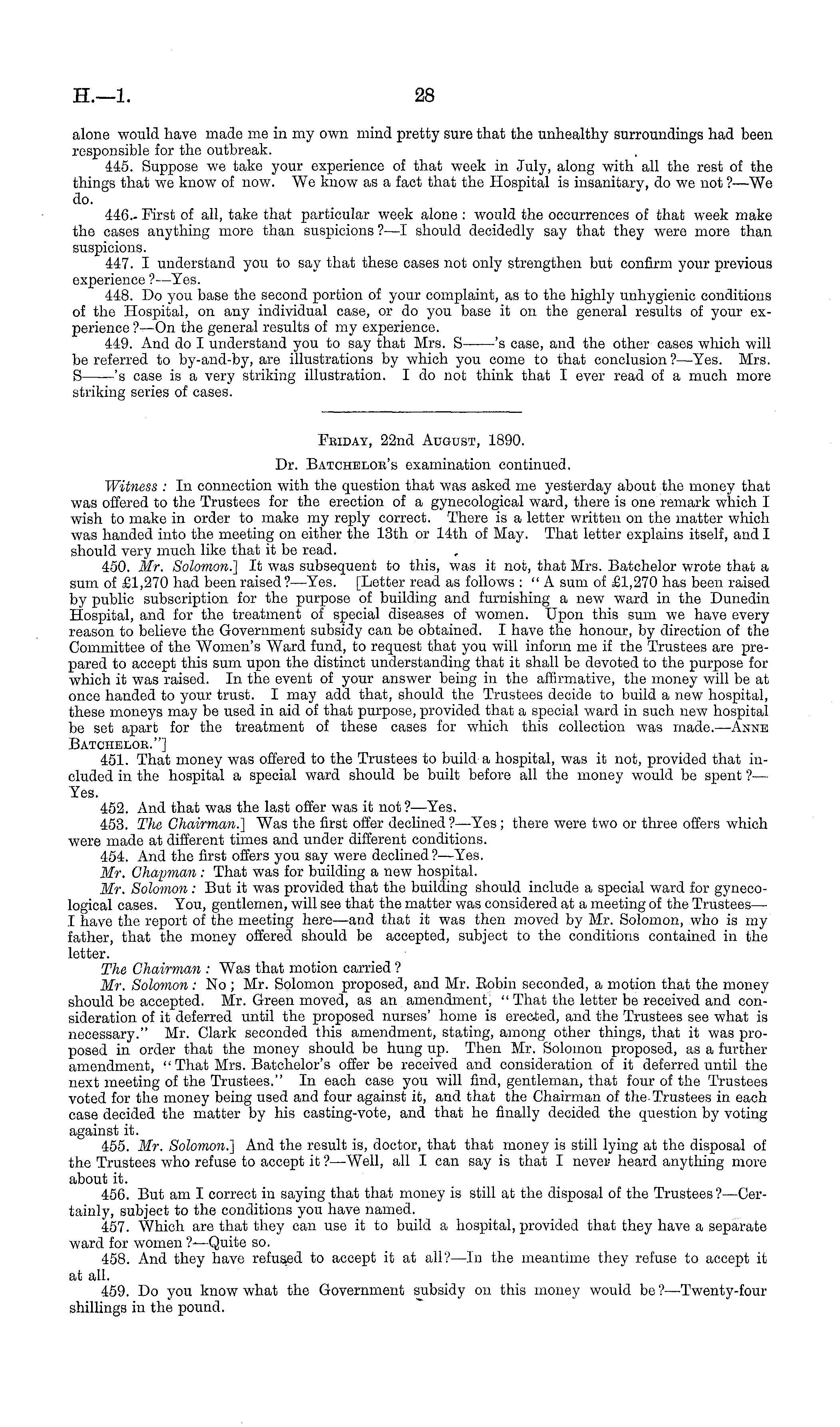 Feiday, 22nd August, 1890. Dr. Batohblob's examination continued. Witness : In connection with the question that was asked me yesterday about the money that was offered to the Trustees for the erection of a gynecological ward, there is one remark which I wish to make in order to make my reply correct. There is a letter written on the matter which was handed into the meeting on either the 13th or 14th of May. That letter explains itself, and I should very much like that it be read. 450. Mr. Solomon.] It was subsequent to this, was it not, that Mrs. Batchelor wrote that a sum of £1,270 had been raised ?—Yes. [Letter read as follows : " A sum of £1,270 has been raised by public subscription for the purpose of building and furnishing a new ward in the Dunedin Hospital, and for the treatment of special diseases of women. Upon this sum we have every reason to believe the Government subsidy can be obtained. I have the honour, by direction of the Committee of the Women's Ward fund, to request that you will inform me if the Trustees are prepared to accept this sum upon the distinct understanding that it shall be devoted to the purpose for which it was raised. In the event of your answer being in the affirmative, the money will be at once handed to your trust. I may add that, should the Trustees decide to build a new hospital, these moneys may be used in aid of that purpose, provided that a special ward in such new hospital be set apart for the treatment of these cases for which this collection was made. —Anne Batcheloe."] 451. That money was offered to the Trustees to build a hospital, was it not, provided that included in the hospital a special ward should be built before all the money would be spent ? — Yes. 452. And that was the last offer was it not ?—Yes. 453. The Chairman.] Was the first offer declined ?—Yes; there were two or three offers which were made at different times and under different conditions. 454. And the first offers you say were declined ? —Yes. Mr. Chapman : That was for building a new hospital. Mr. Solomon : But it was provided that the building should include a special ward for gynecological cases. You, gentlemen, will see that the matter was considered at a meeting of the Trustees— I have the report of the meeting here—and that it was then moved by Mr. Solomon, who is my father, that the money offered should be accepted, subject to the conditions contained in the letter. The Chairman : Was that motion carried ? Mr. Solomon: No ; Mr. Solomon proposed, and Mr. Eobin seconded, a motion that the money should be accepted. Mr. Green moved, as an amendment, " That the letter be received and consideration of it deferred until the proposed nurses' home is erected, and the Trustees see what is necessary." Mr. Clark seconded this amendment, stating, among other things, that it was proposed in order that the money should be hung up. Then Mr. Solomon proposed, as a further amendment, " That Mrs. Batchelor's offer be received and consideration of it deferred until the next meeting of the Trustees." In each case you will find, gentleman, that four of the Trustees voted for the money being used and four against it, and that the Chairman of the Trustees in each case decided the matter by his casting-vote, and that he finally decided the question by voting against it. 455. Mr. Solomon.] And the result is, doctor, that that money is still lying at the disposal of the Trustees who refuse to accept it ? —Well, all I can say is that I never- heard anything more about it. 456. But am I correct in saying that that money is still at the disposal of the Trustees?— Certainly, subject to the conditions you have named. 457. Which are that they can use it to build a hospital, provided that they have a separate ward for women?— Quite so. 458. And they have refused to accept it at all?—In the meantime they refuse to accept it at all. 459. Do you know what the Government subsidy on this money would be ?—Twenty-four shillings in the pound.