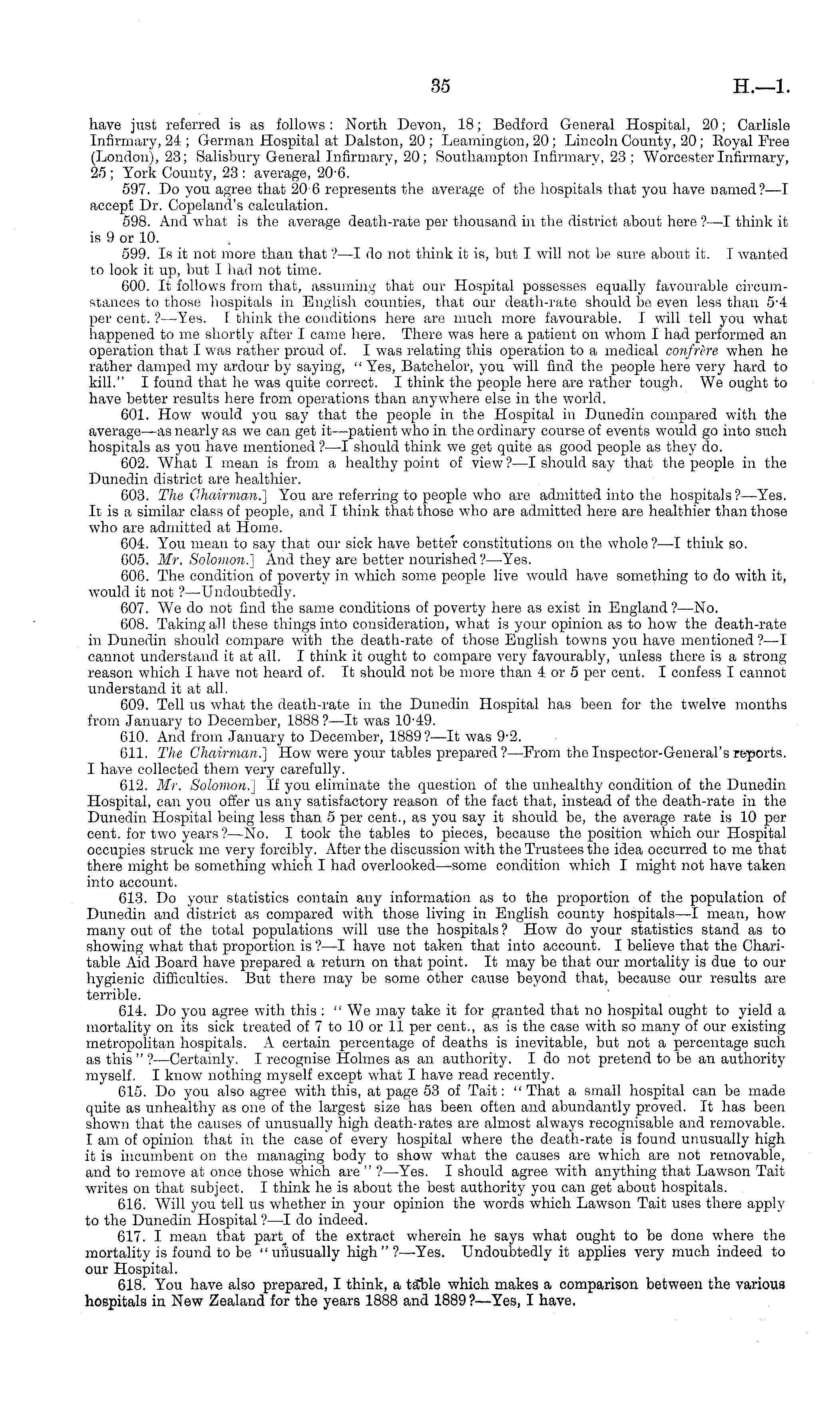 have just referred is as follows: North Devon, 18; Bedford General Hospital, 20; Carlisle Infirmary, 24 ; German Hospital at Dalston, 20 ; Leamington, 20; Lincoln County, 20; Royal Free (London), 23; Salisbury General Infirmary, 20; Southampton Infirmary, 23; Worcester Infirmary, 25 ; York County, 23 : average, 20-6. 597. Do you agree that 20 6 represents the average of the hospitals that you have named?—l accept Dr. Copeland's calculation. 598. And what is the average death-rate per thousand in the district about here ?—I think it is 9 or 10. 599. Is it not more than that ?—I do not think it is, but I will not bo sure about it. I wanted to look it up, but I had not time. 600. It follows from that, assuming that our Hospital possesses equally favourable circumstances to those hospitals in English counties, that our death-rate should be even less than 5-4 per cent. ?—Yes. I think the conditions here are much more favourable. I will tell you what happened to me shortly after I came here. There was here a patient on whom I had performed an operation that I was rather proud of. I was relating this operation to a medical confrere when he rather damped my ardour by saying, " Yes, Batchelor, you will find the people here very hard to kill." I found that he was quite correct. I think the people here are rather tough. We ought to have better results here from operations than anywhere else in the world. 601. How would you say that the people in the Hospital in Dunedin compared with the average—as nearly as we can get it—patient who in the ordinary course of events would go into such hospitals as you have mentioned ? —I should think we get quite as good people as they do. 602. What I mean is from a healthy point of view ? —I should say that the people in the Dunedin district are healthier. 603. The Chairman.] You are referring to people who are admitted into the hospitals ?—Yes. It is a similar class of people, and I think that those who are admitted here are healthier than those who are admitted at Home. 604. You mean to say that our sick have better constitutions on the whole ? —I think so. 605. Mr. Solomon.] And they are better nourished?— Yes. 606. The condition of poverty in which some people live would have something to do with it, would it not ? —-Undoubtedly. 607. We do not find the same conditions of poverty here as exist in England?— No. 608. Taking all these things into consideration, what is your opinion as to how the death-rate in Dunedin should compare with the death-rate of those English towns you have mentioned ? —I cannot understand it at all. I think it ought to compare very favourably, unless there is a strong reason which I have not heard of. It should not be more than 4or 5 per cent. I confess I cannot understand it at all. 609. Tell us what the death-rate in the Duuedin Hospital has been for the twelve months from January to December, 1888 ? —lt was 10-49. 610. And from January to December, 1889 ? —lt was 9-2. 611. The Chairman.] How were your tables prepared ?—From the Inspector-General's reports. I have collected them very carefully. 612. Mr. Solomon.] If you eliminate the question of the unhealthy condition of the Dunedin Hospital, can you offer us any satisfactory reason of the fact that, instead of the death-rate in the Dunedin Hospital being less than 5 per cent., as you say it should be, the average rate is 10 per cent, for two years?— No. I took the tables to pieces, because the position which our Hospital occupies struck me very forcibly. After the discussion with the Trustees the idea occurred to me that there might be something which I had overlooked—some condition which I might not have taken into account. 613. Do your statistics contain any information as to the proportion of the population of Dunedin and district as compared with those living in English county hospitals—l mean, how many out of the total populations will use the hospitals ? How do your statistics stand as to showing what that proportion is ? —I have not taken that into account. I believe that the Charitable Aid Board have prepared a return on that point. It may be that our mortality is due to our hygienic difficulties. But there may be some other cause beyond that, because our results are terrible. 614. Do you agree with this : " We may take it for granted that no hospital ought to yield a mortality on its sick treated of 7 to 10 or 11 per cent., as is the case with so many of our existing metropolitan hospitals. A certain percentage of deaths is inevitable, but not a percentage such as this " ?—Certainly. I recognise Holmes as an authority. I do not pretend to be an authority myself. I know nothing myself except what I have read recently. 615. Do you also agree with this, at page 53 of Tait: " That a small hospital can be made quite as unhealthy as one of the largest size has been often and abundantly proved. It has been shown that the causes of unusually high death-rates are almost always recognisable and removable. I am of opinion that in the case of every hospital where the death-rate is found unusually high it is incumbent on the managing body to show what the causes are which are not removable, and to remove at once those which are " ?—Yes. I should agree with anything that Lawson Tait writes on that subject. I think he is about the best authority you can get about hospitals. 616. Will you tell us whether in your opinion the words which Lawson Tait uses there apply to the Dunedin Hospital ?—I do indeed. 617. I mean that part_ of the extract wherein he says what ought to be done where the mortality is found to be "unusually high"? —-Yes. Undoubtedly it applies very much indeed to our Hospital. 618. You have also prepared, I think, a table which makes a comparison between the various hospitals in New Zealand for the years 1888 and 1889?— Yes, I have.
