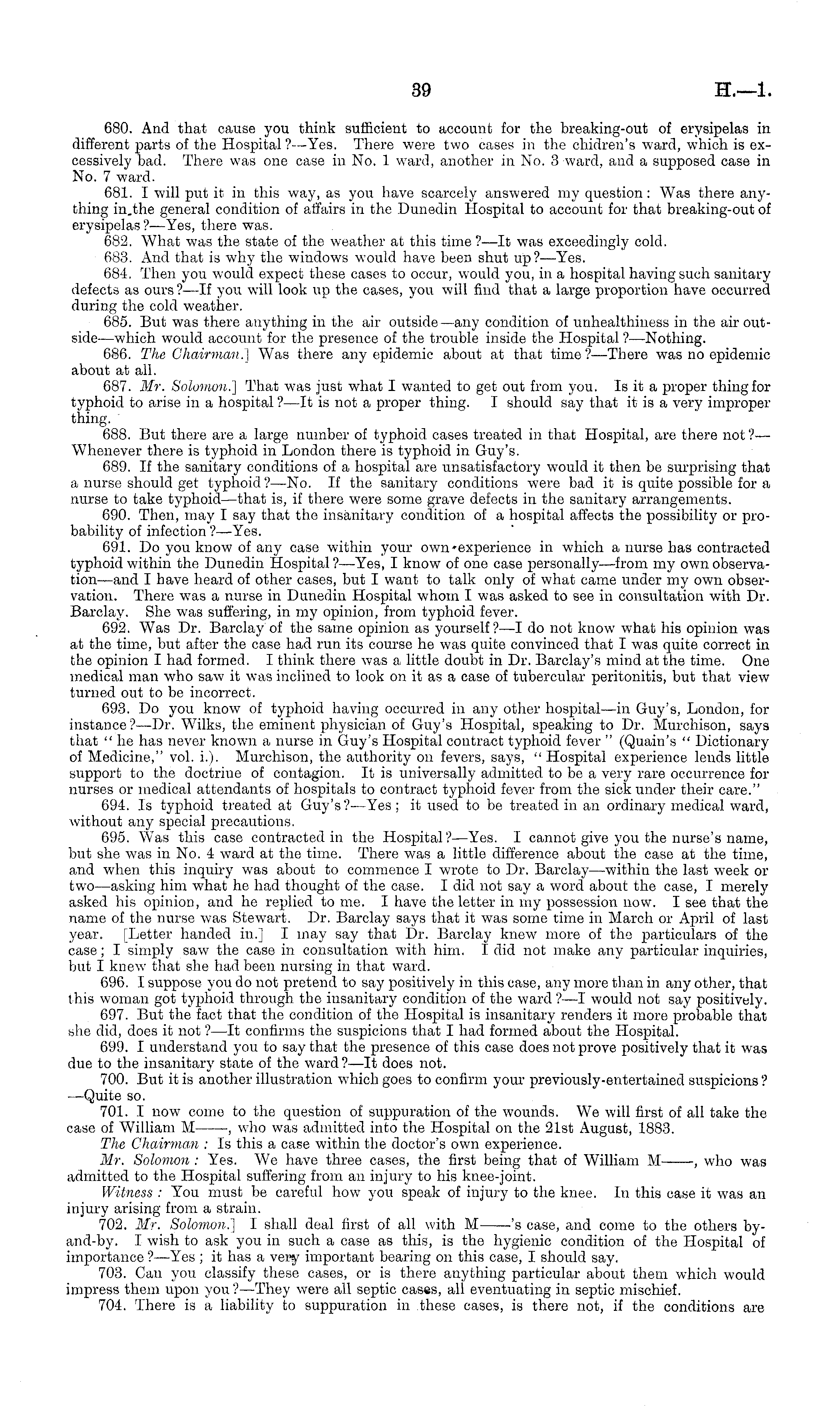 680. And that cause you think sufficient to account for the breaking-out of erysipelas in different parts of the Hospital ? —Yes. There were two cases in the chidren's ward, which is excessively bad. There was one case in No. 1 ward, another in No. 3 ward, and a supposed case in No. 7 ward. 681. I will put it in this way, as you have scarcely answered my question: Was there anything in.the general condition of affairs in the Dunedin Hospital to account for that breaking-out of erysipelas'?— Yes, there was. 682. What was the state of the weather at this time ?—lt was exceedingly cold. 683. And that is why the windows would have been shut up?— Yes. 684. Then you would expect these cases to occur, would you, in a hospital having such sanitary defects as ours?—lf you will look up the cases, you will find that a large proportion have occurred during the cold weather. 685. But was there anything in the air outside—any condition of unhealthiness in the air outside—which would account for the presence of the trouble inside the Hospital ?—Nothing. 686. The Chairman.} Was there any epidemic about at that time ?—There was no epidemic about at all. 687. Mr. Solomon.] That was just what I wanted to get out from you. Is it a proper thing for typhoid to arise in a hospital ?—lt is not a proper thing. I should say that it is a very improper thing. 688. But there are a large number of typhoid cases treated in that Hospital, are there not ?— Whenever there is typhoid in London there is typhoid in Guy's. 689. If the sanitary conditions of a hospital are unsatisfactory w Tould it then be surprising that a nurse should get typhoid?— No. If the sanitary conditions were bad it is quite possible for a nurse to take typhoid—that is, if there were some grave defects in the sanitary arrangements. 690. Then, may I say that the insanitary condition of a hospital affects the possibility or probability of infection ?—Yes. 691. Do you know of any case within your own'experience in which a nurse has contracted typhoid within the Dunedin Hospital ?—Yes, I know of one case personally—from my own observation—and I have heard of other cases, but I want to talk only of what came under my own observation. There was a nurse in Dunedin Hospital whom I was asked to see in consultation with Dr. Barclay. She was suffering, in my opinion, from typhoid fever. 692. Was Dr. Barclay of the same opinion as yourself?—l do not know what his opinion was at the time, but after the case had run its course he was quite convinced that I was quite correct in the opinion I had formed. I think there was a little doubt in Dr. Barclay's mind at the time. One medical man who saw it was inclined to look on it as a case of tubercular peritonitis, but that view turned out to be incorrect. 693. Do you know of typhoid having occurred in any other hospital—in Guy's, London, for instance?— Dr. Wilks, the eminent physician of Guy's Hospital, speaking to Dr. Murchison, says that " he has never known a nurse in Guy's Hospital contract typhoid fever " (Quaiu's " Dictionary of Medicine," vol. i.). Murchison, the authority on fevers, says, "Hospital experience lends little support to the doctrine of contagion. It is universally admitted to be a very rare occurrence for nurses or medical attendants of hospitals to contract typhoid fever from the sick under their care." 694. Is typhoid treated at Guy's?— Yes ; it used to be treated in an ordinary medical ward, without any special precautions. 695. Was this case contracted in the Hospital?— Yes. I cannot give you the nurse's name, but she was in No. 4 ward at the time. There was a little difference about the case at the time, and when this inquiry was about to commence I wrote to Dr. Barclay —within the last week or two —asking him what he had thought of the case. I did not say a word about the case, I merely asked his opinion, and he replied to me. I have the letter in my possession now. I see that the name of the nurse was Stewart. Dr. Barclay says that it was some time in March or April of last year. [Letter handed in.] I may say that Dr. Barclay knew more of the particulars of the case; I simply saw the case in consultation with him. I did not make any particular inquiries, but I knew that she had been nursing in that ward. 696. I suppose you do not pretend to say positively in this case, any more than in any other, that this woman got typhoid through the insanitary condition of the ward ?—I would not say positively. 697. But the fact that the condition of the Hospital is insanitary renders it more probable that she did, does it not ?—lt confirms the suspicions that I had formed about the Hospital. 699. I understand you to say that the presence of this case does not prove positively that it was due to the insanitary state of the ward?—lt does not. 700. But it is another illustration which goes to confirm your previously-entertained suspicions ? -—Quite so. 701. I now come to the question of suppuration of the wounds. We will first of all take the case of William M -, who was admitted into the Hospital on the 21st August, 1883. The Chairman : Is this a case within the doctor's own experience. Mr. Solomon : Yes. We have three cases, the first being that of William M- , who was admitted to the Hospital suffering from an injury to his knee-joint. Witness : You must be careful how you speak of injury to the knee. In this case it was an injury arising from a strain. 702. Mr. Solomon.] I shall deal first of all with M -'s case, and come to the others by-and-by. I wish to ask you in such a case as this, is the hygienic condition of the Hospital of importance ?—Yes ;it has a very important bearing on this case, I should say. 703. Can you classify these cases, or is there anything particular about them which would impress them upon you ? —They were all septic cases, all eventuating in septic mischief. 704. There is a liability to suppuration in these cases, is t