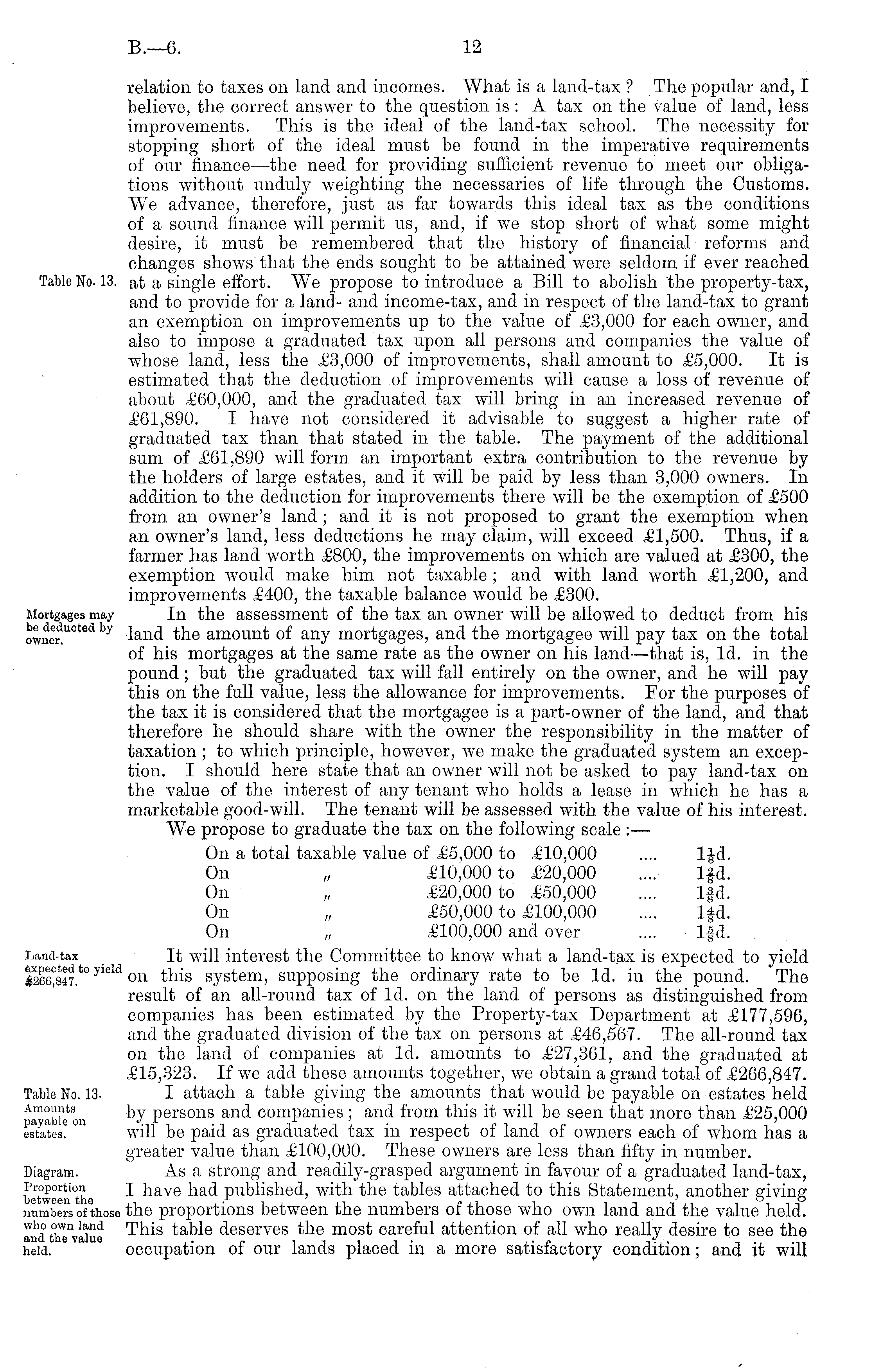 relation to taxes on land and incomes. What is a land-tax ? The popular and, I believe, the correct answer to the question is : A tax on the value of land, less improvements. This is the ideal of the land-tax school. The necessity for stopping short of the ideal must be found in the imperative requirements of our finance —the need for providing sufficient revenue to meet our obligations without unduly weighting the necessaries of life through the Customs. We advance, therefore, just as far towards this ideal tax as the conditions of a sound finance will permit us, and, if we stop short of what some might desire, it must be remembered that the history of financial reforms and changes shows that the ends sought to be attained were seldom if ever reached at a single effort. We propose to introduce a Bill to abolish the property-tax, and to provide for a land- and income-tax, and in respect of the land-tax to grant an exemption on improvements up to the value of £3,000 for each owner, and also to impose a graduated tax upon all persons and companies the value of whose land, less the £3,000 of improvements, shall amount to £5,000. It is estimated that the deduction of improvements will cause a loss of revenue of about £60,000, and the graduated tax will bring in an increased revenue of .£61,890. I have not considered it advisable to suggest a higher rate of graduated tax than that stated in the table. The payment of the additional sum of £61,890 will form an important extra contribution to the revenue by the holders of large estates, and it will be paid by less than 3,000 owners. In addition to the deduction for improvements there will be the exemption of £500 from an owner's land; and it is not proposed to grant the exemption when an owner's land, less deductions he may claim, will exceed £1,500. Thus, if a farmer has land worth £800, the improvements on which are valued at £300, the exemption would make him not taxable; and with land worth £1,200, and improvements £400, the taxable balance would be £300. In the assessment of the tax an owner will be allowed to deduct from his land the amount of any mortgages, and the mortgagee will pay tax on the total of his mortgages at the same rate as the owner on his land—that is, Id. in the pound; but the graduated tax will fall entirely on the owner, and he will pay this on the full value, less the allowance for improvements. For the purposes of the tax it is considered that the mortgagee is a part-owner of the land, and that therefore he should share with the owner the responsibility in the matter of taxation ; to which principle, however, we make the graduated system an exception. I should here state that an owner will not be asked to pay land-tax on the value of the interest of any tenant who holds a lease in which he has a marketable good-will. The tenant will be assessed with the value of his interest. We propose to graduate the tax on the following scale : — On a total taxable value of £5,000 to £10,000 .... l|d. On „ £10,000 to £20,000 .... lfd. On „ £20,000 to £50,000 .... lfd. On „ £50,000 to £100,000 .... lfd. On „ £100,000 and over .... lfd. It will interest the Committee to know what a land-tax is expected to yield lon this system, supposing the ordinary rate to be Id. in the pound. The result of an all-round tax of Id. on the land of persons as distinguished from companies has been estimated by the Property-tax Department at £177,596, and the graduated division of the tax on persons at £46,567. The all-round tax on the land of companies at Id. amounts to £27,361, and the graduated at £15,323. If we add these amounts together, we obtain a grand total of £266,847. I attach a table giving the amounts that would be payable on estates held by persons and companies; and from this it will be seen that more than £25,000 will be paid as graduated tax in respect of land of owners each of whom has a greater value than £100,000. These owners are less than fifty in number. As a strong and readily-grasped argument in favour of a graduated land-tax, I have had published, with the tables attached to this Statement, another giving , the proportions between the numbers of those who own land and the value held. This table deserves the most careful attention of all who really desire to see the occupation of our lands placed in a more satisfactory condition; and it will