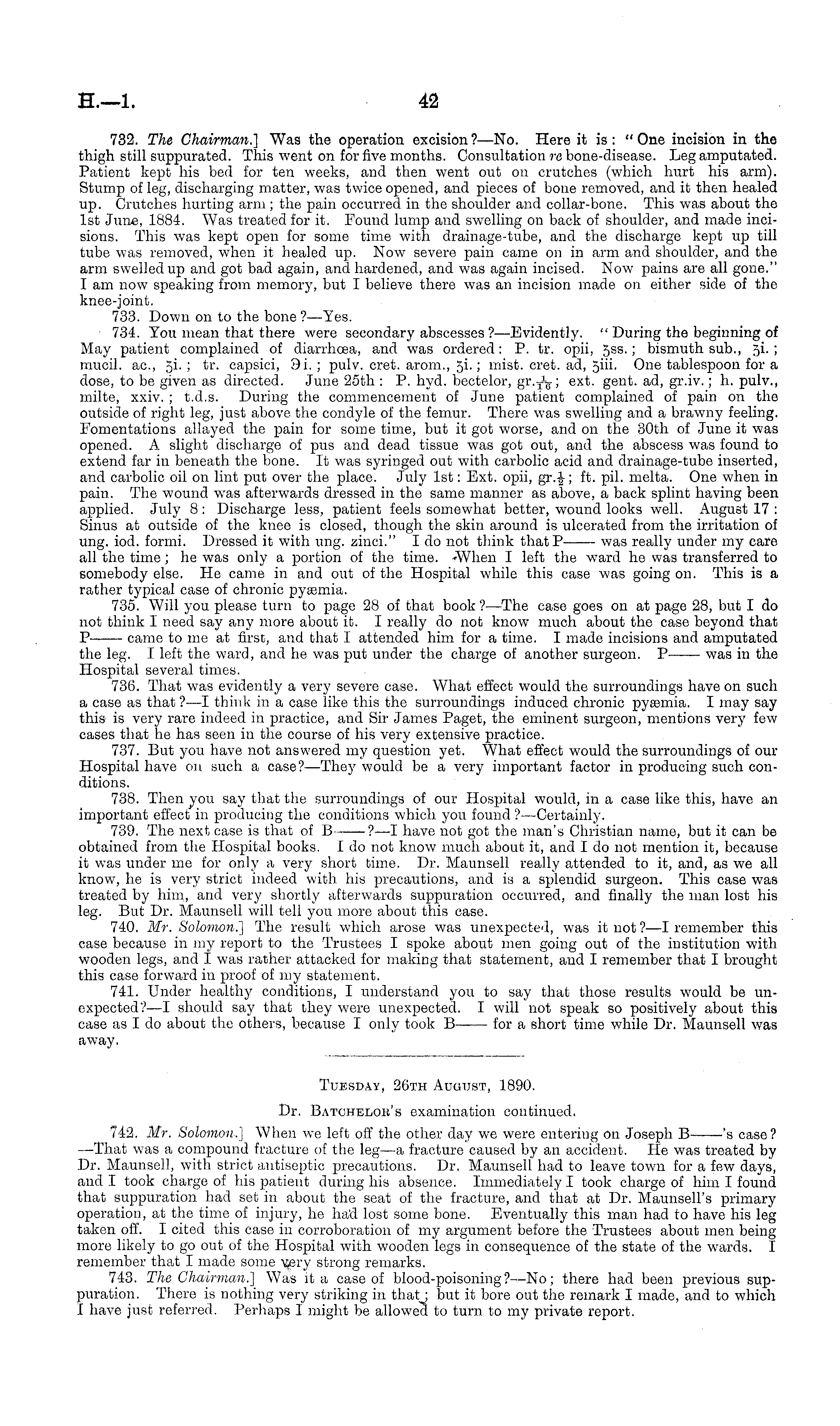 Tuesday, 26th August, 1890. Dr. Batchelok's examination continued. 742. Mr. Solomon.] When we left off the other day we were entering on Joseph B 's case? —That was a compound fracture of the leg—a fracture caused by an accident. He was treated by Dr. Maunsell, with strict antiseptic precautions. Dr. Maunsell' had to leave town for a few days, and I took charge of his patient during his absence. Immediately I took charge of him I found that suppuration had set in about the seat of the fracture, and that at Dr. Maunsell's primary operation, at the time of injury, he had lost some bone. Eventually this man had to have his leg taken off. I cited this case in corroboration of my argument before the Trustees about men being more likely to go out of the Hospital with wooden legs in consequence of the state of the wards. I remember that I made some strong remarks. 743. The Chairman.] Was it a case of blood-poisoning?—No; there had been previous suppuration. There is nothing very striking in thatj but it bore out the remark I made, and to which I have just referred. Perhaps I might be allowed to turn to my private report.