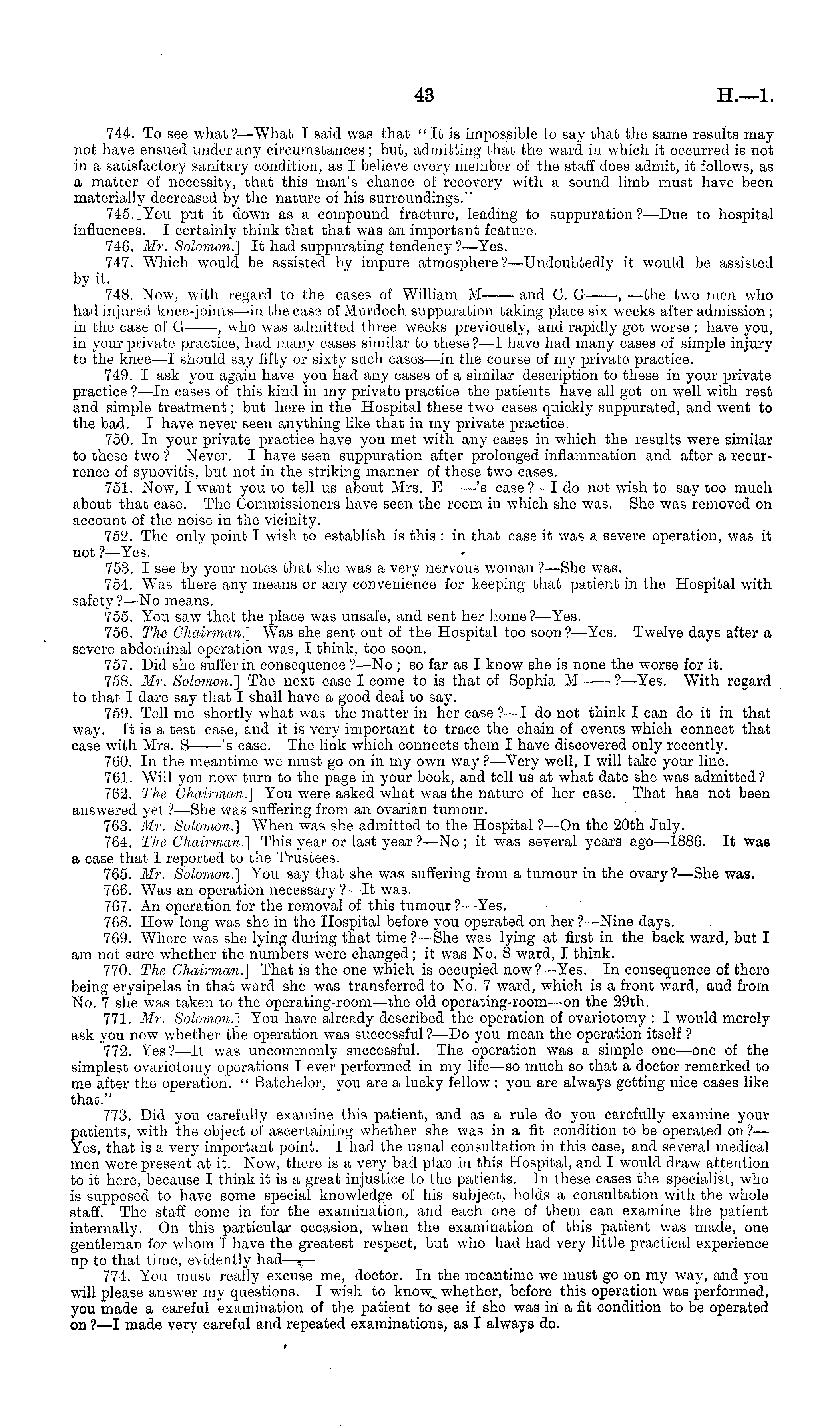 744. To see what?— What I said was that " It is impossible to say that the same results may not have ensued under any circumstances; but, admitting that the ward in which it occurred is not in a satisfactory sanitary condition, as I believe every member of the staff does admit, it follows, as a matter of necessity, that this man's chance of recovery with a sound limb must have been materially decreased by the nature of his surroundings." 745..Y0u put it down as a compound fracture, leading to suppuration?— Due to hospital influences. I certainly think that that was an important feature. 746. Mr. Solomon.] It had suppurating tendency ?—Yes. 747. Which would be assisted by impure atmosphere?— Undoubtedly it would be assisted by it. 748. Now, with regard to the cases of William M and C. G , —the two men who had injured knee-joints—in the case of Murdoch suppuration taking place six weeks after admission; in the case of G , who was admitted three weeks previously, and rapidly got worse : have you, in your private practice, had many cases similar to these ? —I have had many cases of simple injury to the knee—l should say fifty or sixty such cases—in the course of my private practice. 749. I ask you again have you had any cases of a similar description to these in your private practice ?—ln cases of this kind in my private practice the patients have all got on well with rest and simple treatment; but here in the Hospital these two cases quickly suppurated, and went to the bad. I have never seen anything like that in my private practice. 750. In your private practice have you met with any cases in which the results were similar to these two ?—Never. I have seen suppuration after prolonged inflammation and after a recurrence of synovitis, but not in the striking manner of these two cases. 751. Now, I want you to tell us about Mrs. E 's case?—l do not wish to say too much about that case. The Commissioners have seen the room in which she was. She was removed on account of the noise in the vicinity. 752. The only point I wish to establish is this : in that case it was a severe operation, was it not ?—Yes. 753. I see by your notes that she was a very nervous woman ? —She was. 754. Was there any means or any convenience for keeping that patient in the Hospital with safety ?—No means. 755. You saw that the place was unsafe, and sent her home? —Yes. 756. The Chairman.] Was she sent out of the Hospital too soon?— Yes. Twelve days after a severe abdominal operation was, I think, too soon. 757. Did she suffer in consequence ?—No ; so far as I know she is none the worse for it. 758. Mr. Solomon.] The next case I come to is that of Sophia M ■ ?—Yes. With regard to that I dare say that I shall have a good deal to say. 759. Tell me shortly what was the matter in her case ? —I do not think I can do it in that way. It is a test case, and it is very important to trace the chain of events which connect that case with Mrs. S 's case. The link which connects them I have discovered only recently. 760. In the meantime we must go on in my own way ? —Very well, I will take your line. 761. Will you now turn to the page in your book, and tell us at what date she was admitted? 762. The Chairman.] You were asked what was the nature of her case. That has not been answered yet ?—She was suffering from an ovarian tumour. 763. Mr. Solomon.] When was she admitted to the Hospital ? —On the 20th July. 764. The Chairman.] This year or last year ? —No ; it was several years ago—lBB6. It was a case that I reported to the Trustees. 765. Mr. Solomon.] You say that she was suffering from a tumour in the ovary?— She was. 766. Was an operation necessary ?—lt was. 767. An operation for the removal of this tumour? —Yes. 768. How long was she in the Hospital before you operated on her ? —Nine days. 769. Where was she lying during that time ? —She was lying at first in the back ward, but I am not sure whether the numbers were changed; it was No. 8 ward, I think. 770. The Chairman.] That is the one which is occupied now? —Yes. In consequence of there being erysipelas in that ward she was transferred to No. 7 ward, which is a front ward, and from No. 7 she was taken to the operating-room —the old operating-room—on the 29th. 771. Mr. Solomon.] You have already described the operation of ovariotomy : I would merely ask you now whether the operation was successful ?—Do you mean the operation itself ? 772. Yes?—lt was uncommonly successful. The operation was a simple one—one of the simplest ovariotomy operations I ever performed in my life—so much so that a doctor remarked to me after the operation, '' Batchelor, you are a lucky fellow ; you are always getting nice cases like that." 773. Did you carefully examine this patient, and as a rule do you carefully examine your patients, with the object of ascertaining whether she was in a fit condition to be operated on ?— Yes, that is a very important point. I had the usual consultation in this case, and several medical men were present at it. Now, there is a very bad plan in this Hospital, and I would draw attention to it here, because I think it is a great injustice to the patients. In these cases the specialist, who is supposed to have some special knowledge of his subject, holds a consultation with the whole staff. The staff come in for the examination, and each one of them can examine the patient internally. On this particular occasion, when the examination of this patient was made, one gentleman for whom I have the greatest respect, but who had had very little practical experience up to that time, evidently had—j— 774. You must really excuse me, doctor. In the meantime we must go on my way, and you will please answer my questions. I wish to know., whether, before this operation was performed, you made a careful examination of the patient to see if she was in a fit condition to be operated on ?—I made very careful 