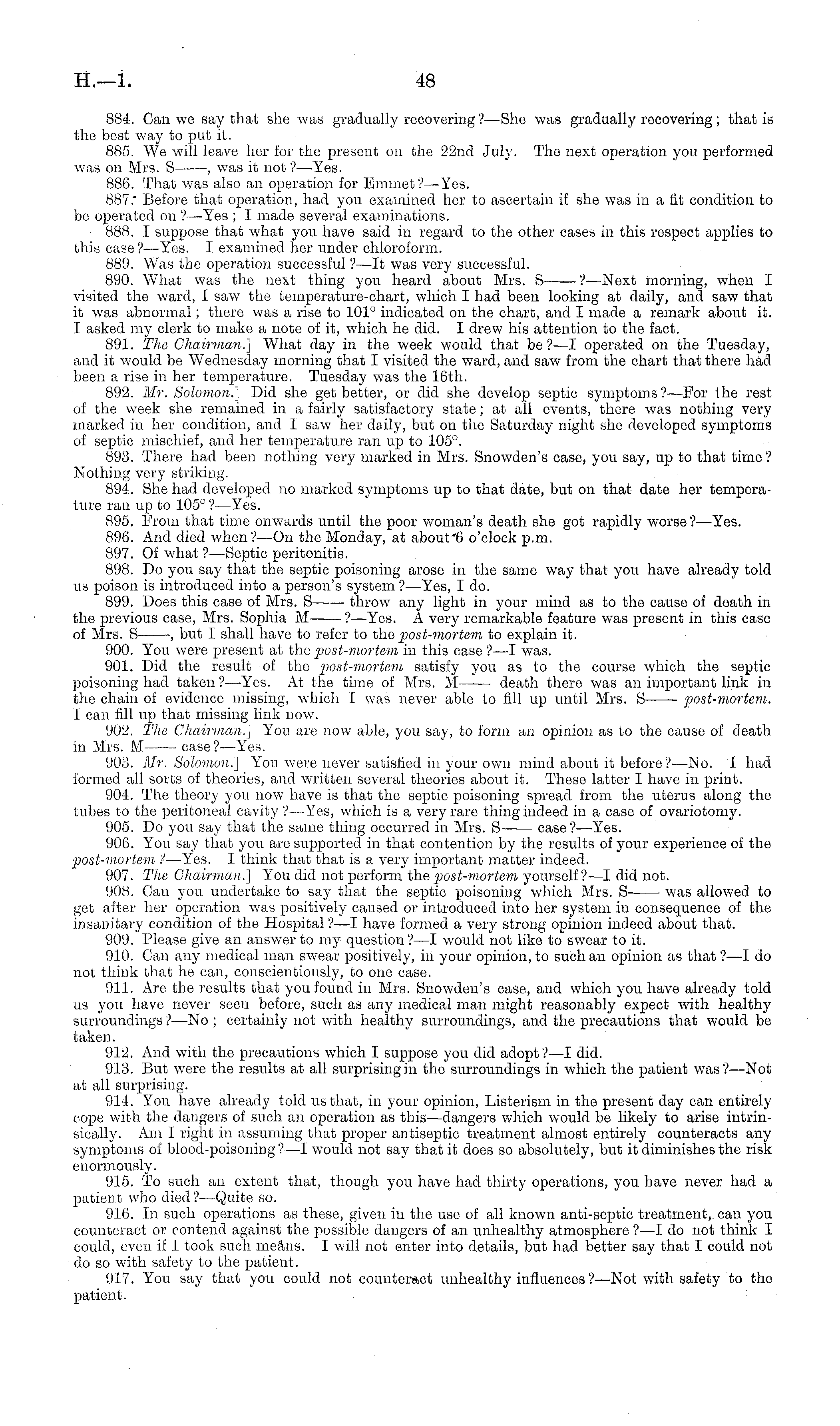 884. Can we say that she was gradually recovering ?—She was gradually recovering; that is the best way to put it. 885. We will leave her for the present ou the 22nd July. The next operation you performed was on Mrs. S , was it not ?—Yes. 886. That was also an operation for Emmet ? —Yes. 887.' Before that operation, had you examined her to ascertain if she was in a lit condition to be operated on ?—Yes ; I made several examinations. 888. I suppose that what you have said in regard to the other cases in this respect applies to this case? —Yes. I examined her under chloroform. 889. Was the operation successful ? —lt was very successful. 890. What was the next thing you heard about Mrs. S——•'?—Next morning, when I visited the ward, I saw the temperature-chart, which I had been looking at daily, and saw that it was abnormal; there was a rise to 101° indicated on the chart, and I made a remark about it. I asked my clerk to make a note of it, which he did. I drew his attention to the fact. 891. The Chairman,'] What day in the week would that be ? —I operated on the Tuesday, and it would be Wednesday morning that I visited the ward, and saw from the chart that there had been a rise in her temperature. Tuesday was the 16th. 892. Mr. Solomon.] Did she get better, or did she develop septic symptoms'? — For the rest of the week she remained in a fairly satisfactory state; at all events, there was nothing very marked in her condition, and I saw her daily, but on the Saturday night she developed symptoms of septic mischief, and her temperature ran up to 105°. 893. There had been nothing very marked in Mrs. Snowden's case, you say, up to that time ? Nothing very striking. 894. She had developed no marked symptoms up to that date, but on that date her temperature ran up to 105° ? —Yes. 895. From that time onwards until the poor woman's death she got rapidly worse ? —Yes. 896. And died when ?—On the Monday, at about' 6 o'clock p.m. 897. Of what ? —Septic peritonitis. 898. Do you say that the septic poisoning arose in the same way that you have already told us poison is introduced into a person's system ? —Yes, I do. 899. Does this case of Mrs. S throw any light in your mind as to the cause of death in the previous case, Mrs. Sophia M ?—Yes. A very remarkable feature was present in this case of Mrs. S , but I shall have to refer to the post-mortem to explain it. 900. You were present at the post-mortem in this case ?—I was. 901. Did the result of the post-mortem satisfy you as to the course which the septic poisoning had taken'? —Yes. At the time of Mrs. M — - death there was an important link in the chain of evidence missing, which I was never able to fill up until Mrs. S— - post-vio-rtem. I can fill up that missing link now. 902. The Chairman.] You are now able, you say, to form an opinion as to the cause of death in Mrs. M case ?—Yes. 903. Mr, Solomon.] You were never satisfied in your own mind about it before? —No. I had formed all sorts of theories, and written several theories about it. These latter I have in print. 904. The theory you now have is that the septic poisoning spread from the uterus along the tubes to the peritoneal cavity ? —Yes, which is a very rare thing indeed in a case of ovariotomy. 905. Do you say that the same thing occurred in Mrs. S case?— Yes. 906. You say that you are supported in that contention by the results of your experience of the post-mortem ? —Yes. I think that that is a very important matter indeed. 907. The Chairman.] You did not perform the post-mortem yourself? —I did not. 908. Can you undertake to say that the septic poisoning which Mrs. S was allowed to get after her operation was positively caused or introduced into her system in consequence of the insanitary condition of the Hospital ?—I have formed a very strong opinion indeed about that. 909. Please give an answer to my question?—l would not like to swear to it. 910. Can any medical man swear positively, in your opinion, to such an opinion as that ? —1 do not think that he can, conscientiously, to one case. 911. Are the results that you found in Mrs. Snowden's case, and which you have already told us you have never seen before, such as any medical man might reasonably expect with healthy surroundings ?—No ; certainly not with healthy surroundings, and the precautions that would be taken. 912. And with the precautions which I suppose you did adopt?—l did. 913. But were the results at all surprising in the surroundings in which the patient was?— Not at all surprising. 914. You have already told us that, in your opinion, Listerisin in the present day can entirely cope with the dangers of such an operation as this—dangers which would be likely to arise intrinsically. Am I right in assuming that proper antiseptic treatment almost entirely counteracts any symptoms of blood-poisoning?—l would not say that it does so absolutely, but it diminishes the risk enormously. 915. To such an extent that, though you have had thirty operations, you have never had a patient who died?— Quite so. 916. In such operations as these, given in the use of all known anti-septic treatment, can you counteract or contend against the possible dangers of an unhealthy atmosphere ?—I do not think I could, even if I took such means. I will not enter into details, but had better say that I could not do so with safety to the patient. 917. You say that you could not counteract unhealthy influences?— Not with safety to the patient.