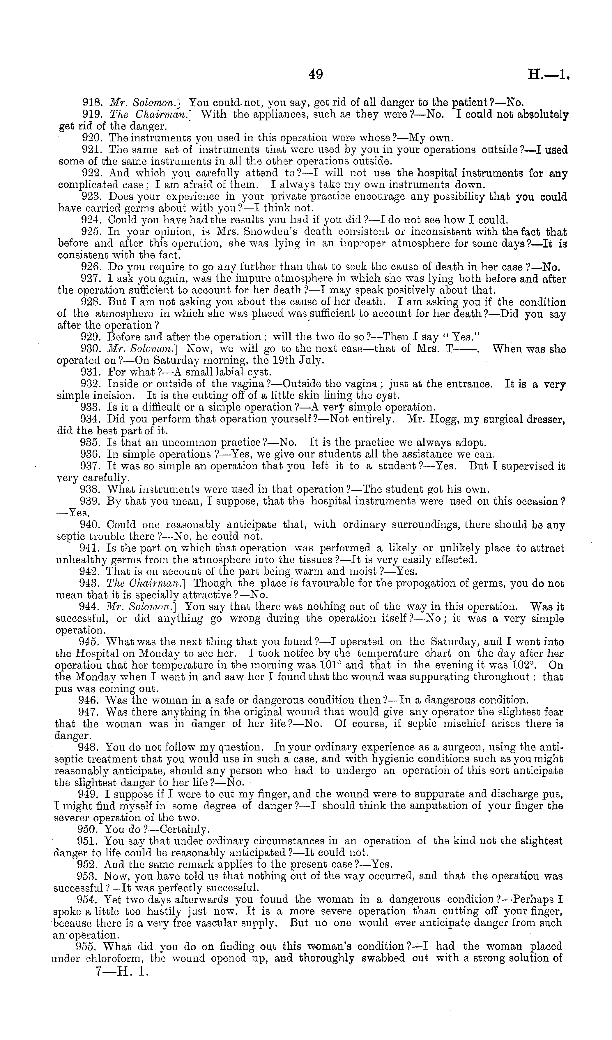 918. Mr. Solomon.] You could not, you say, get rid of all danger to the patient?— No. 919. The Chairman.'] With the appliances, such as they were ?—No. I could not absolutely get rid of the danger. 920. The instruments you used in this operation were whose ?—My own. 921. The same set of instruments that were used by you in your operations outside?—l used some of the same instruments in all the other operations outside. 922. And which you carefully attend to?—I will not use the hospital instruments for any complicated case ; lam afraid of them. I always take my own instruments down. 923. Does your experience in your private practice encourage any possibility that you could have carried germs about with you ?—-I think not. 924. Could you have had the results you had if you did ?—I do not see how I could. 925. In your opinion, is Mrs. Snowden's death consistent or inconsistent with the fact that before and after this operation, she was lying in an improper atmosphere for some days?—lt is consistent with the fact. 926. Do you require to go any further than that to seek the cause of death in her case ?—No. 927. I ask you again, was the impure atmosphere in which she was lying both before and after the operation sufficient to account for her death ? —I may speak positively about that. 928. But lam not asking you about the cause of her death. lam asking you if the condition of the atmosphere in which she was placed was sufficient to account for her death ?—Did you say after the operation ? 929. Before and after the operation : will the two do so?— Then I say " Yes." 930. Mr. Solomon.] Now, we will go to the next case—that of Mrs. T . When was she operated on ?—On Saturday morning, the 19th July. 931. For what ?—A small labial cyst. 932. Inside or outside of the vagina?— Outside the vagina; just at the entrance. Ib is a very simple incision. It is the cutting off of a little skin lining the cyst. 933. Is it a difficult or a simple operation ?—A very simple operation. 934. Did you perform that operation yourself?— Not entirely. Mr. Hogg, my surgical dresser, did the best part of it. 935. Is that an uncommon practice ?—No. It is the practice we always adopt. 936. In simple operations ?—Yes, we give our students all the assistance we can. 937. It was so simple an operation that you left it to a student ?—Yes. But I supervised it very carefully. 938. What instruments were used in that operation?— The student got his own. 939. By that you mean, I suppose, that the hospital instruments were used on this occasion ? —Yes. 940. Could one reasonably anticipate that, with ordinary surroundings, there should be any septic trouble there ? —No, he could not. 941. Is the part on which that operation was performed a likely or unlikely place to attract unhealthy germs from the atmosphere into the tissues ? —lt is very easily affected. 942. That is on account of the part being warm and moist ?—Yes. 943. The Chairman.] Though the place is favourable for the propogation of germs, you do not mean that it is specially attractive ?—No. 944. Mr. Solomon.] You say that there was nothing out of the way in this operation. Was it successful, or did anything go wrong during the operation itself ? —No; it was a very simple operation. 945. What was the next thing that you found ? —I operated on the Saturday, and I wont into the Hospital on Monday to see her. I took notice by the temperature chart on the day after her operation that her temperature in the morning was 101° and that in the evening it was 102°. On the Monday when I went in and saw her I found that the wound was suppurating throughout: that pus was coming out. 946. Was the woman in a safe or dangerous condition then?—ln a dangerous condition. 947. Was there anything in the original wound that would give any operator the slightest fear that the woman was in danger of her life?— No. Of course, if septic mischief arises there is danger. 948. You do not follow my question. In your ordinary experience as a surgeon, using the antiseptic treatment that you would use in such a case, and with hygienic conditions such as you might reasonably anticipate, should any person who had to undergo an operation of this sort anticipate the slightest danger to her life?— No. 949. I suppose if I were to cut my finger, and the wound were to suppurate and discharge pus, I might find myself in some degree of danger ?—I should think the amputation of your finger the severer operation of the two. 950. You do ?—Certainly. 951. You say that under ordinary circumstances in an operation of the kind not the slightest danger to life could be reasonably anticipated ?—lt could not. 952. And the same remark applies to the present case?— Yes. 953. Now, you have told us that nothing out of the way occurred, and that the operation was successful ?—lt was perfectly successful. 954. Yet two days afterwards you found the woman in a dangerous condition ? —Perhaps I spoke a little too hastily just now. It is a more severe operation than cutting off your finger, because there is a very free vascular supply. But no one would ever anticipate danger from such an operation. 955. What did you do on finding out this woman's condition ?—I had the woman placed under chloroform, the wound opened up, and thoroughly swabbed out with a strong solution of 7—H. 1.