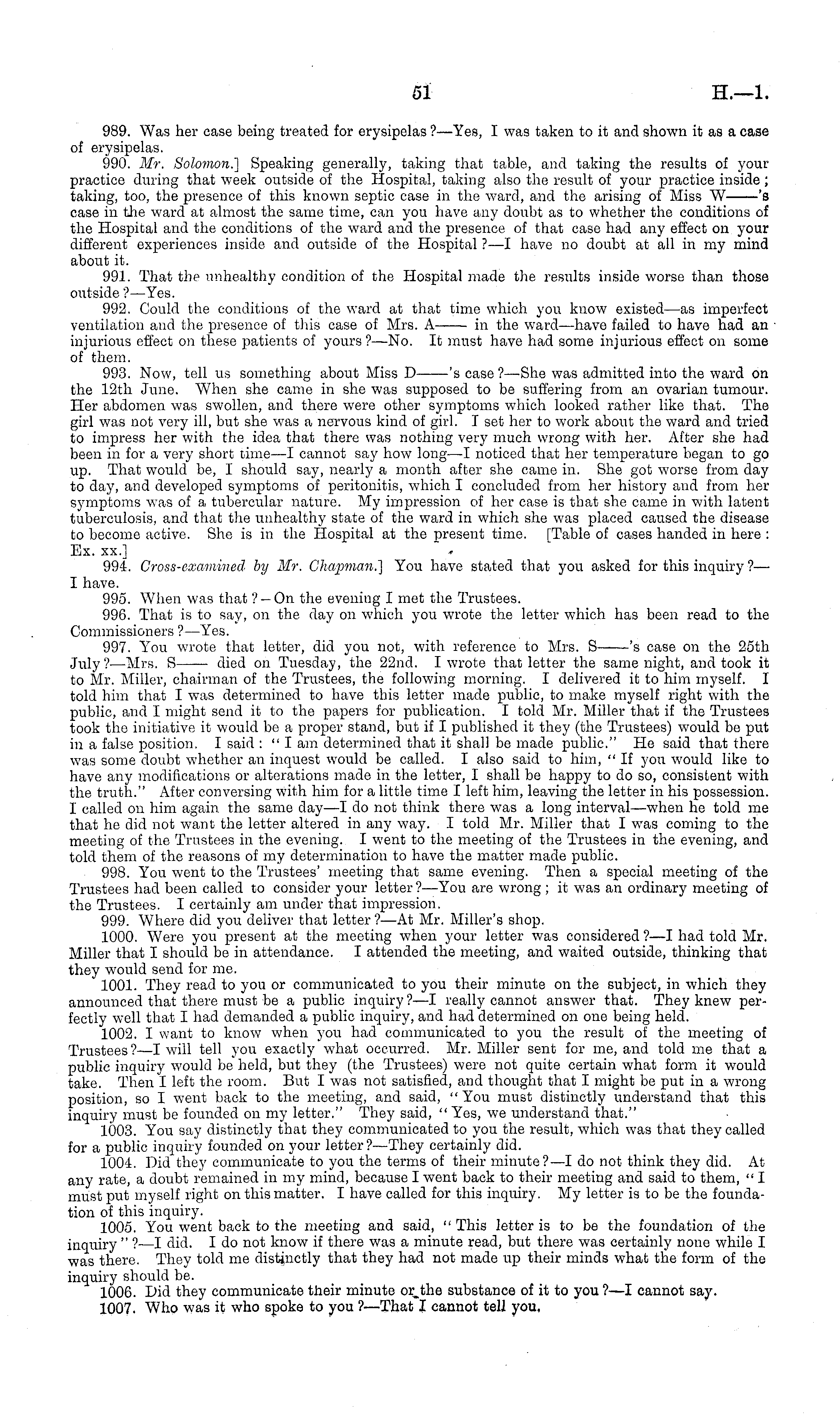 989. Was her case being treated for erysipelas ?—Yes, I was taken to it and shown it as a case of erysipelas. 990. Mr. Solomon.'] Speaking generally, taking that table, and taking the results of your practice during that week outside of the Hospital, taking also the result of your practice inside ; taking, too, the presence of this known septic case in the ward, and the arising of Miss W 's case in the ward at almost the same time, can you have any doubt as to whether the conditions of the Hospital and the conditions of the ward and the presence of that case had any effect on your different experiences inside and outside of the Hospital ? —I have no doubt at all in my mind about it. 991. That the unhealthy condition of the Hospital made the results inside worse than those outside ?—Yes. 992. Could the conditions of the ward at that time which you know existed—as imperfect ventilation and the presence of this case of Mrs. A——■ in the ward —have failed to have had an injurious effect on these patients of yours ?—No. It must have had some injurious effect on some of them. 993. Now, tell us something about Miss D 's case ? —'She was admitted into the ward on the 12th June. When she came in she was supposed to be suffering from an ovarian tumour. Her abdomen was swollen, and there were other symptoms which looked rather like that. The girl was not very ill, but she was a nervous kind of girl. T set her to work about the ward and tried to impress her with the idea that there was nothing very much wrong with her. After she had been in for a very short time—l cannot say how long—l noticed that her temperature began to go up. That would be, I should say, nearly a month after she came in. She got worse from day to day, and developed symptoms of peritonitis, which I concluded from her history and from her symptoms was of a tubercular nature. My impression of her case is that she came in with latent tuberculosis, and that the unhealthy state of the ward in which she was placed caused the disease to become active. She is in the Hospital at the present time. [Table of cases handed in here : Ex. xx.] 994. Gross-examined by Mr. Chapman.] You have stated that you asked for this inquiry ?— I have. 995. When was that ? —On the evening I met the Trustees. 996. That is to say, on the day on which you wrote the letter which has been read to the Commissioners ? —Yes. 997. You wrote that letter, did you not, with reference to Mrs. S 's case on the 25th July?— Mrs. S died on Tuesday, the 22nd. I wrote that letter the same night, and took it to Mr. Miller, chairman of the Trustees, the following morning. I delivered it to him myself. I told him that I was determined to have this letter made public, to make myself right with the public, and I might send it to the papers for publication. I told Mr. Miller that if the Trustees took the initiative it would be a proper stand, but if I published it they (the Trustees) would be put in a false position. I said:"I am determined that it shall be made public." He said that there was some doubt whether an inquest would be called. I also said to him, "If you would like to have any modifications or alterations made in the letter, I shall be happy to do so, consistent with the truth." After conversing with him for a little time I left him, leaving the letter in his possession. I called on him again the same day —I do not think there was a long interval—when he told me that he did not want the letter altered in any way. I told Mr. Miller that I was coming to the meeting of the Trustees in the evening. I went to the meeting of the Trustees in the evening, and told them of the reasons of my determination to have the matter made public. 998. You went to the Trustees' meeting that same evening. Then a special meeting of the Trustees had been called to consider your letter? —You are wrong ; it was an ordinary meeting of the Trustees. I certainly am under that impression. 999. Where did you deliver that letter ?—At Mr. Miller's shop. 1000. Were you present at the meeting when your letter was considered ?—I had told Mr. Miller that I should be in attendance. I attended the meeting, and waited outside, thinking that they would send for me. 1001. They read to you or communicated to you their minute on the subject, in which they announced that there must be a public inquiry? —I really cannot answer that. They knew perfectly well that I had demanded a public inquiry, and had determined on one being held. 1002. I want to know when you had communicated to you the result of the meeting of Trustees ?—I will tell you exactly what occurred. Mr. Miller sent for me, and told me that a public inquiry would be held, but they (the Trustees) were not quite certain what form it would take. Then I left the room. But I was not satisfied, and thought that I might be put in a wrong position, so I went back to the meeting, and said, " You must distinctly understand that this inquiry must be founded on my letter." They said, " Yes, we understand that." 1003. You say distinctly that they communicated to you the result, which was that they called for a public inquiry founded on your letter? —They certainly did. 1004. Did they communicate to you the terms of their minute?—l do not think they did. At any rate, a doubt remained in my mind, because I went back to their meeting and said to them, " I must put myself right on this matter. I have called for this inquiry. My letter is to be the foundation of this inquiry. 1005. You went back to the meeting and said, " This letter is to be the foundation of the inquiry " ? —I did. Ido not know if there was a minute read, but there was certainly none while I was there. They told me distinctly that they had not made up their minds what the form of the inquiry should be. 1006. Did they communicate their minute or the substance of it to you ? —I cannot say. 1007. Who was it who spoke to you ?—That I cannot tell you.