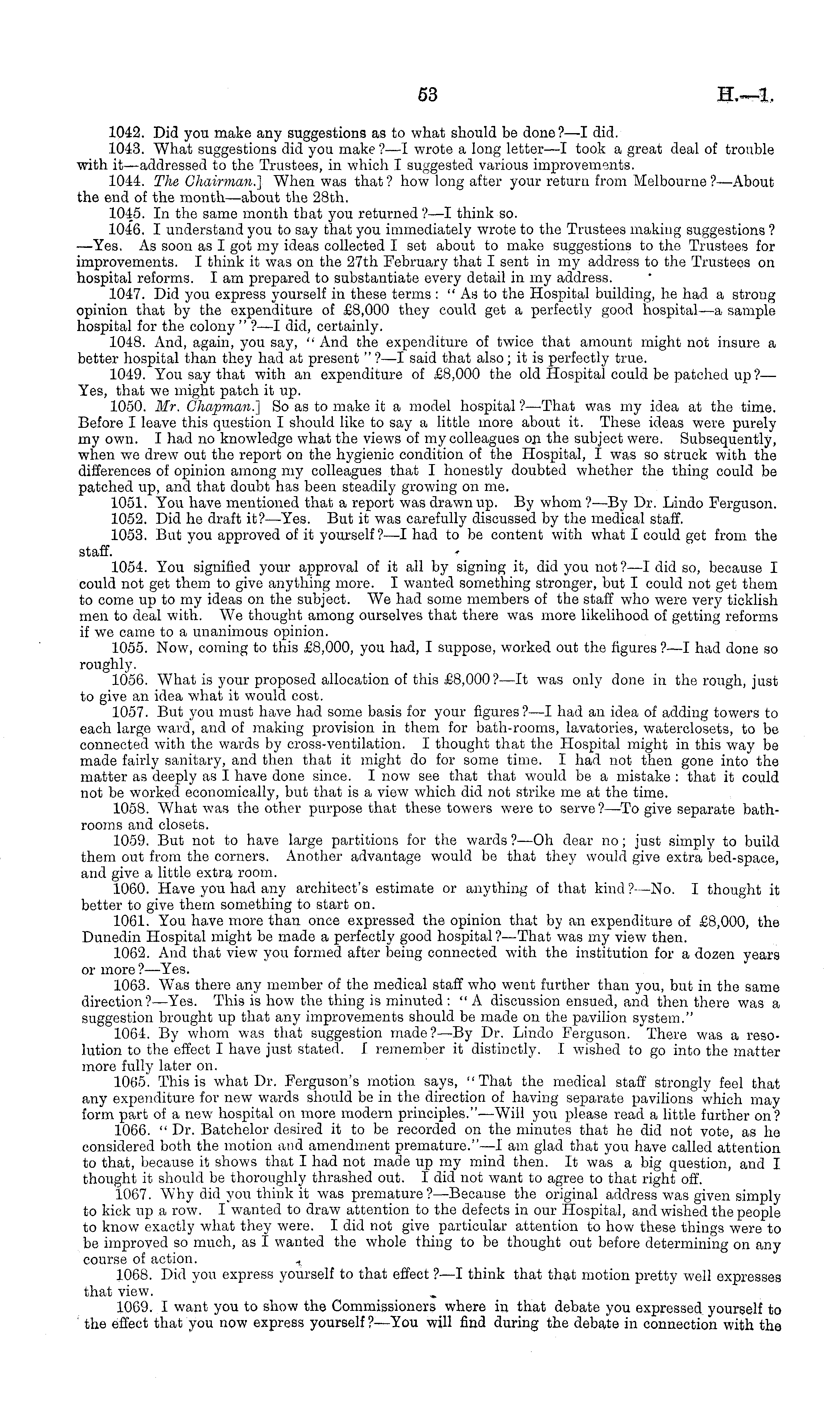 1042. Did you make any suggestions as to what should be done?—l did. 1043. What suggestions did you make ?—I wrote a long letter—l took a great deal of trouble with it—addressed to the Trustees, in which I suggested various improvements. 1044. The Chairman.'] When was that ? how long after your return from Melbourne ?—About the end of the month—about the 28th. 1045. In the same month that you returned ?—I think so. 1046. I understand you to say that you immediately wrote to the Trustees making suggestions ? —Yes. As soon as I got my ideas collected I set about to make suggestions to the Trustees for improvements. I think it was on the 27th February that I sent in my address to the Trustees on hospital reforms. lam prepared to substantiate every detail in my address. 1047. Did you express yourself in these terms : " As to the Hospital building, he had a strong opinion that by the expenditure of £8,000 they could get a perfectly good hospital—a sample hospital for the colony " ? —I did, certainly. 1048. And, again, you say, " And the expenditure of twice that amount might not insure a better hospital than they had at present " ?—I said that also; it is perfectly true. 1049. You say that with an expenditure of £8,000 the old Hospital could be patched up'?— Yes, that we might patch it up. 1050. Mr. Chapman.] So as to make it a model hospital ?—'That was my idea at the time. Before I leave this question I should like to say a little more about it. These ideas were purely my own. I had no knowledge what the views of my colleagues on the subject were. Subsequently, when we drew out the report on the hygienic condition of the Hospital, I was so struck with the differences of opinion among my colleagues that I honestly doubted whether the thing could be patched up, and that doubt has been steadily growing on me. 1051. You have mentioned that a report was drawn up. By whom ?—By Dr. Lindo Ferguson. 1052. Did he draft it?— Yes. But it was carefully discussed by the medical staff. 1053. But you approved of it yourself ?—I had to be content with what I could get from the staff. 1054. You signified your approval of it all by signing it, did you not ?—I did so, because I could not get them to give anything more. I wanted something stronger, but I could not get them to come up to my ideas on the subject. We had some members of the staff who were very ticklish men to deal with. We thought among ourselves that there was more likelihood of getting reforms if we came to a unanimous opinion. 1055. Now, coming to this £8,000, you had, I suppose, worked out the figures ?—I had done so roughly. 1056. What is your proposed allocation of this £8,000 ?—lt was only done in the rough, just to give an idea what it would cost. 1057. But you must have had some basis for your figures?—l had an idea of adding towers to each large ward, and of making provision in them for bath-rooms, lavatories, waterclosets, to be connected with the wards by cross-ventilation. I thought that the Hospital might in this way be made fairly sanitary, and then that it might do for some time. I had not then gone into the matter as deeply as I have done since. I now see that that would be a mistake : that it could not be worked economically, but that is a view which did not strike me at the time. 1058. What was the other purpose that these towers were to serve ?—To give separate bathrooms and closets. 1059. But not to have large partitions for the wards ?—Oh dear no; just simply to build them out from the corners. Another advantage would be that they would give extra bed-space, and give a little extra room. 1060. Have you had any architect's estimate or anything of that kind ?—No. I thought it better to give them something to start on. 1061. You have more than once expressed the opinion that by an expenditure of £8,000, the Dunedin Hospital might be made a perfectly good hospital?— That was my view then. 1062. And that view you formed after being connected with the institution for a dozen years or more ? —Yes. 1063. Was there any member of the medical staff who went further than you, but in the same direction?— Yes. This is how the thing is minuted: " A discussion ensued, and then there was a suggestion brought up that any improvements should be made on the pavilion system." 1064. By whom was that suggestion made?—By Dr. Lindo Ferguson. There was a resolution to the effect I have just stated. I remember it distinctly. I wished to go into the matter more fully later on. 1065. This is what Dr. Ferguson's motion says, "That the medical staff strongly feel that any expenditure for new wards should be in the direction of having separate pavilions which may form part of a new hospital on more modern principles."—Will you please read a little further on? 1066. " Dr. Batchelor desired it to be recorded on the minutes that he did not vote, as he considered both the motion and amendment premature."—l am glad that you have called attention to that, because it shows that I had not made up my mind then. It was a big question, and I thought it should be thoroughly thrashed out. I did not want to agree to that right off. 1067. Why did you think it was premature?— Because the original address was given simply to kick up a row. I wanted to draw attention to the defects in our Hospital, and wished the people to know exactly what they were. I did not give particular attention to how these things were to be improved so much, as I wanted the whole thing to be thought out before determining on any course of action. .. 1068. Did you express yourself to that effect ? —I think that that motion pretty well expresses that view. 1069. I want you to show the Commissioners where in that debate you expressed yourself to : the effect that you now express yourself ?—You will find during the debate in connection with the