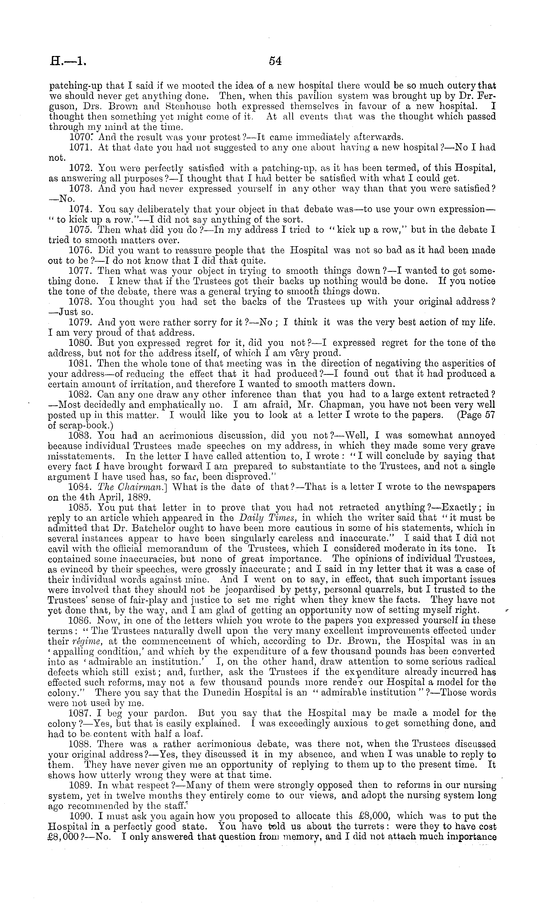 patching-up that I said if we mooted the idea of a new hospital there would be so much outcry that we should never get anything done. Then, when this pavilion system was brought up by Dr. Ferguson, Drs. Brown and Stenhouse both expressed themselves in favour of a new hospital. I thought then something yet might come of it. At all events that was the thought which passed through my mind at the time. 1070? And the result was your protest ?—lt came immediately afterwards. 1071. At that date you had not suggested to any one about having a new hospital?—No I had not. 1072. You were perfectly satisfied with a patching-up. as it has been termed, of this Hospital, as answering all purposes ?—I thought that I had better be satisfied with what I could get. 1073. And you had never expressed yourself in any other way than that you were satisfied? —No. 1074. You say deliberately that your object in that debate was—to use your own expression— "to kick up a row."—l did not say anything of the sort. 1075. Then what did you do ? —ln my address I tried to " kick up a row," but in the debate I tried to smooth matters over. 1076. Did you want to reassure people that the Hospital was not so bad as it had been made out to be ?—I do not know that I did that quite. 1077. Then what was your object in trying to smooth things down ?—I wanted to get something done. I knew that if the Trustees got their backs up nothing would be done. If you notice the tone of the debate, there was a general trying to smooth things down. 1078. You thought you had set the backs of the Trustees up with your original address ? —Just so. 1079. And you were rather sorry for it ?—No ; I think it was the very best action of my life. I am very proud of that address. 1080. But you expressed regret for it, did you not ? —I expressed regret for the tone of the address, but not for the address itself, of which I am very proud. 1081. Then the whole tone of that meeting was in the direction of negativing the asperities of your address—of reducing the effect that it had produced ? —I found out that it had produced a certain amount of irritation, and therefore I wanted to smooth matters down. 1082. Can any one draw any other inference than that you had to a large extent retracted ? —Most decidedly and emphatically no. I am afraid, Mr. Chapman, you have not been very well posted up in this matter. I would like you to look at a letter I wrote to the papers. (Page 57 of scrap-book.) 1083. You had an acrimonious discussion, did you not ?— Well, I was somewhat annoyed because individual Trustees made speeches on my address, in which they made some very grave misstatements. In the letter I have called attention to, I wrote :"I will conclude by saying that every fact i have brought forward I am prepared to substantiate to the Trustees, and not a single argument I have used has, so far, been disproved." 1084. The Chairman.] What is the date of that?— That is a letter I wrote to the newspapers on the 4th April, 1889. 1085. You put that letter in to prove that you had not retracted anything ?—Exactly; in reply to an article which appeared in the Daily Times, in which the writer said that "it must be admitted that Dr. Batchelor ought to have been more cautious in some of his statements, which in several instances appear to have been singularly careless and inaccurate." I said that I did not cavil with the official memorandum of the Trustees, which I considered moderate in its tone. It contained some inaccuracies, but none of great importance. The opinions of individual Trustees, as evinced by their speeches, were grossly inaccurate; and I said in my letter that it was a case of their individual words against mine. And I went on to say, in effect, that such important issues were involved that they should not be jeopardised by petty, personal quarrels, but I trusted to the Trustees' sense of fair-play and justice to set me right when they knew the facts. They have not yet done that, by the way, and I am glad of getting an opportunity now of setting myself right. 1086. Now, in one of the letters which you wrote to the papers you expressed yourself in these terms : " The Trustees naturally dwell upon the very many excellent improvements effected under their regime, at the commencement of which, according to Dr. Brown, the Hospital was in an ' appalling condition,' and which by the expenditure of a few thousand pounds has been converted into as 'admirable an institution.' I, on the other hand, draw attention to some serious radical defects which still exist; and, further, ask the Trustees if the expenditure already incurred has effected such reforms, may not a few thousand pounds more render our Hospital a model for the colony." There you say that the Dunedin Hospital is an " admirable institution " ?—Those words were not used by me. 1087. I beg your pardon. But you say that the Hospital may be made a model for the colony ? —Yes, but that is easily explained. I was exceedingly anxious to get something done, and had to be. content with half a loaf. 1088. There was a rather acrimonious debate, was there not, when the Trustees discussed your original address? —Yes, they discussed it in my absence, and when I was unable to reply to them. They have never given me an opportunity of replying to them up to the present time. It shows how utterly wrong they were at that time. 1089. In what respect ?—Many of them were strongly opposed then to reforms in our nursing system, yet in twelve months they entirely come to our views, and adopt the nursing system long ago recommended by the staff.' 1090. I must ask you again how you proposed to allocate this £8,000, which was to put the Hospital in a perfectly good state. You have told us about the turrets : were they to have cost £8,000 ? —No. I only answered that question from memory, and I did not attach much importance