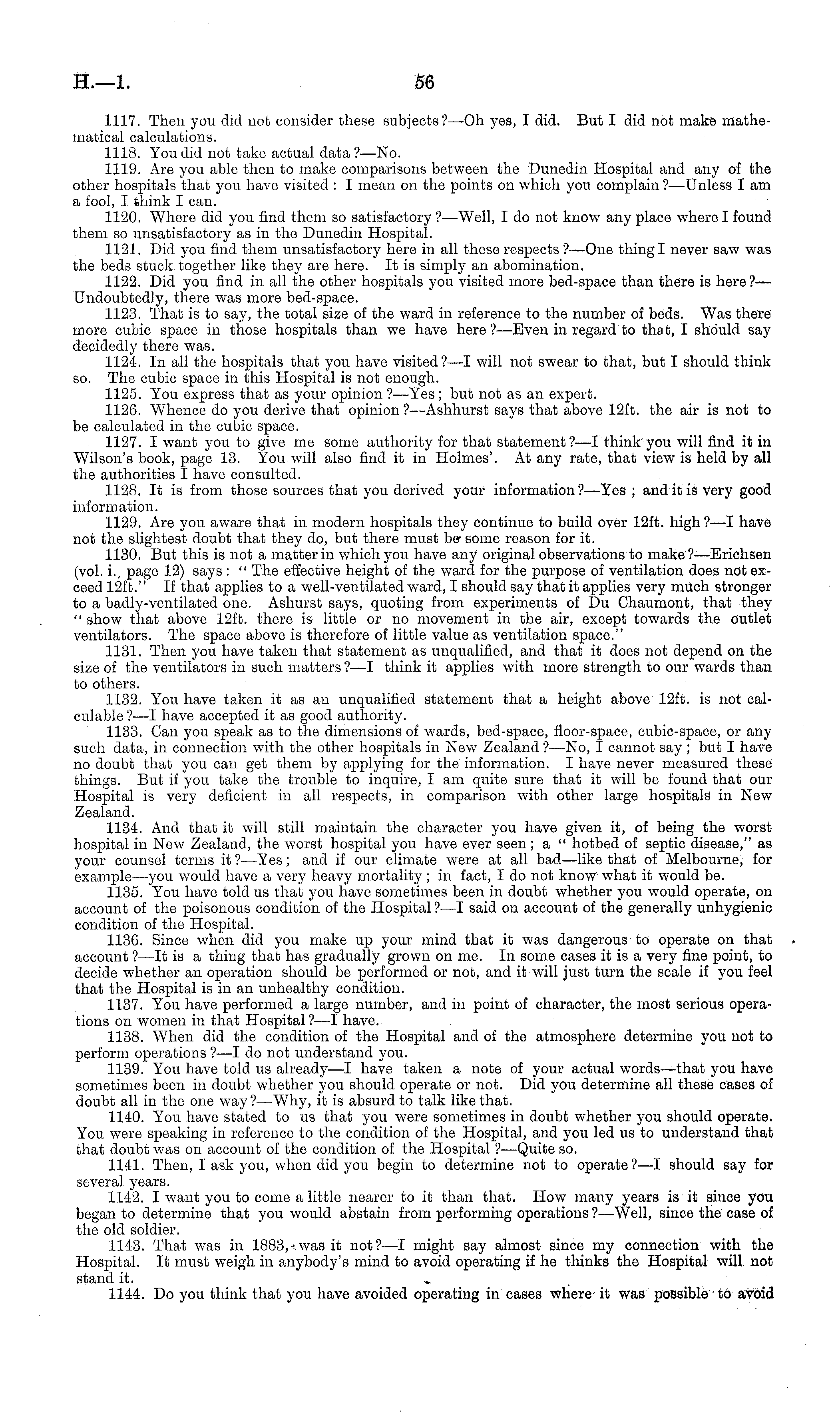 1117. Then you did not consider these subjects?—Oh yes, I did. But I did not make mathematical calculations. 1118. You did not take actual data ? —No. 1119. Are you able then to make comparisons between the Dunedin Hospital and any of the other hospitals that you have visited : I mean on the points on which you complain ?—Unless I am a fool, I think I can. 1120. Where did you find them so satisfactory ? —Well, I do not know any place where I found them so unsatisfactory as in the Dunedin Hospital. 1121. Did you find them unsatisfactory here in all these respects ? —One thing I never saw was the beds stuck together like they are here. It is simply an abomination. 1122. Did you find in all the other hospitals you visited more bed-space than there is here ?— Undoubtedly, there was more bed-space. 1123. That is to say, the total size of the ward in reference to the number of beds. Was there more cubic space in those hospitals than we have here? —Even in regard to that, I should say decidedly there was. 1124. In all the hospitals that you have visited?—l will not swear to that, but I should think so. The cubic space in this Hospital is not enough. 1125. You express that as your opinion?— Yes; but not as an expert. 1126. Whence do you derive that opinion ?—Ashhurst says that above 12ft. the air is not to be calculated in the cubic space. 1127. I want you to give me some authority for that statement ? —I think you will find it in Wilson's book, page 13. You will also find it in Holmes'. At any rate, that view is held by all the authorities I have consulted. 1128. It is from those sources that you derived your information ?—Yes ; and it is very good information. 1129. Are you aware that in modern hospitals they continue to build over 12ft. high?—l have not the slightest doubt that they do, but there must be- some reason for it. 1130. But this is not a matter in which you have any original observations to make?—Erichsen (vol. i., page 12) says : " The effective height of the ward for the purpose of ventilation does not exceed 12ft." If that applies to a well-ventilated ward, I should say that it applies very much stronger to a badly-ventilated one. Ashurst says, quoting from experiments of Dv Chaumont, that they " show that above 12ft. there is little or no movement in the air, except towards the outlet ventilators. The space above is therefore of little value as ventilation space." 1131. Then you have taken that statement as unqualified, and that it does not depend on the size of the ventilators in such matters?—l think it applies with more strength to our wards than to others. 1132. You have taken it as an unqualified statement that a height above 12ft. is not calculable ? —I have accepted it as good authority. 1133. Can you speak as to the dimensions of wards, bed-space, floor-space, cubic-space, or any such data, in connection with the other hospitals in New Zealand?—No, I cannot say ; but I have no doubt that you can get them by applying for the information. I have never measured these things. But if you take the trouble to inquire, I am quite sure that it will be found that our Hospital is very deficient in all respects, in comparison with other large hospitals in New Zealand. 1134. And that it will still maintain the character you have given it, of being the worst hospital in New Zealand, the worst hospital you have ever seen; a " hotbed of septic disease," as your counsel terms it?— Yes; and if our climate were at all bad—like that of Melbourne, for example—you would have a very heavy mortality; in fact, Ido not know what it would be. 1135. You have told us that you have sometimes been in doubt whether you would operate, on account of the poisonous condition of the Hospital ?—I said on account of the generally unhygienic condition of the Hospital. 1136. Since when did you make up your mind that it was dangerous to operate on that account ? —lt is a thing that has gradually grown on me. In some cases it is a very fine point, to decide whether an operation should be performed or not, and it will just turn the scale if you feel that the Hospital is in an unhealthy condition. 1137. You have performed a large number, and in point of character, the most serious operations on women in that Hospital? —I have. 1138. When did the condition of the Hospital and of the atmosphere determine you not to perform operations ? —I do not understand you. 1139. You have told us already—l have taken a note of your actual words—that you have sometimes been in doubt whether you should operate or not. Did you determine all these cases of doubt all in the one way ?—Why, it is absurd to talk like that. 1140. You have stated to us that you were sometimes in doubt whether you should operate. You were speaking in reference to the condition of the Hospital, and you led us to understand that that doubt was on account of the condition of the Hospital ? —Quite so. 1141. Then, I ask you, when did you begin to determine not to operate? —I should say for several years. 1142. I want you to come a little nearer to it than that. How many years is it since you began to determine that you would abstain from performing operations ?—Well, since the case of the old soldier. 1143. That was in 1883, ■?was it not?—l might say almost since my connection with the Hospital. It must weigh in anybody's mind to avoid operating if he thinks the Hospital will not stand it. 1144. Do you think that you have avoided operating in cases where it was possible to avoid
