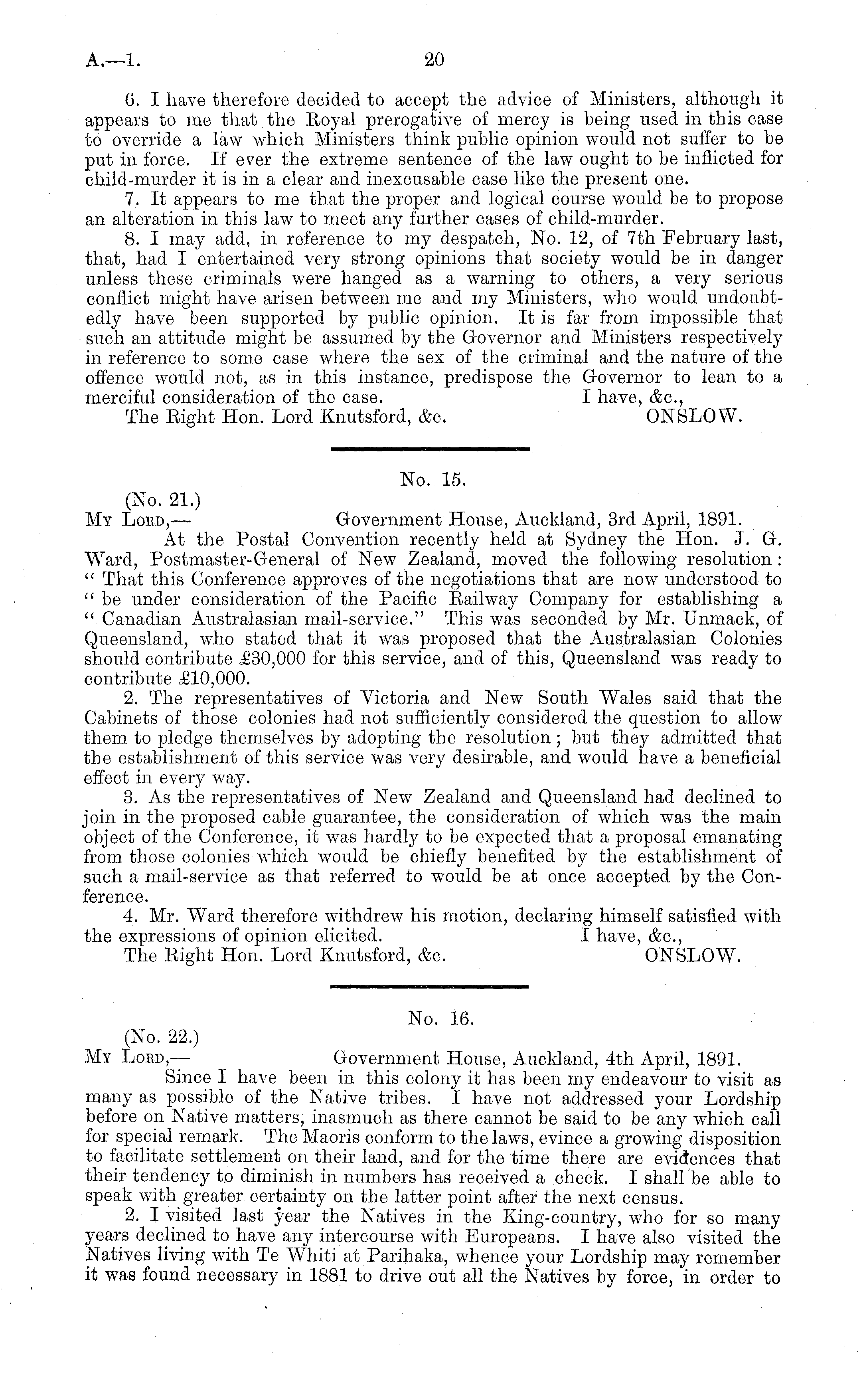 No. 15. (No. 21.) My Lord, — Government House, Auckland, 3rd April, 1891. At the Postal Convention recently held at Sydney the Hon. J. G. Ward, Postmaster-General of New Zealand, moved the following resolution : " That this Conference approves of the negotiations that are now understood to " be under consideration of the Pacific Railway Company for establishing a " Canadian Australasian mail-service." This was seconded, by Mr. Unmack, of Queensland, who stated that it was proposed that the Australasian Colonies should contribute ,£30,000 for this service, and of this, Queensland was ready to contribute £10,000. 2. The representatives of Victoria and New South Wales said that the Cabinets of those colonies had not sufficiently considered the question to allow them to pledge themselves by adopting the resolution ; but they admitted that the establishment of this service was very desirable, and would have a beneficial effect in every way. 3. As the representatives of New Zealand and Queensland had declined to join in the proposed cable guarantee, the consideration of which was the main object of the Conference, it was hardly to be expected that a proposal emanating from those colonies which would be chiefly benefited by the establishment of such a mail-service as that referred to would be at once accepted by the Conference. 4. Mr. Ward therefore withdrew his motion, declaring himself satisfied with the expressions of opinion elicited. I have, &c, The Right Hon. Lord Knutsford, &c. ONSLOW.