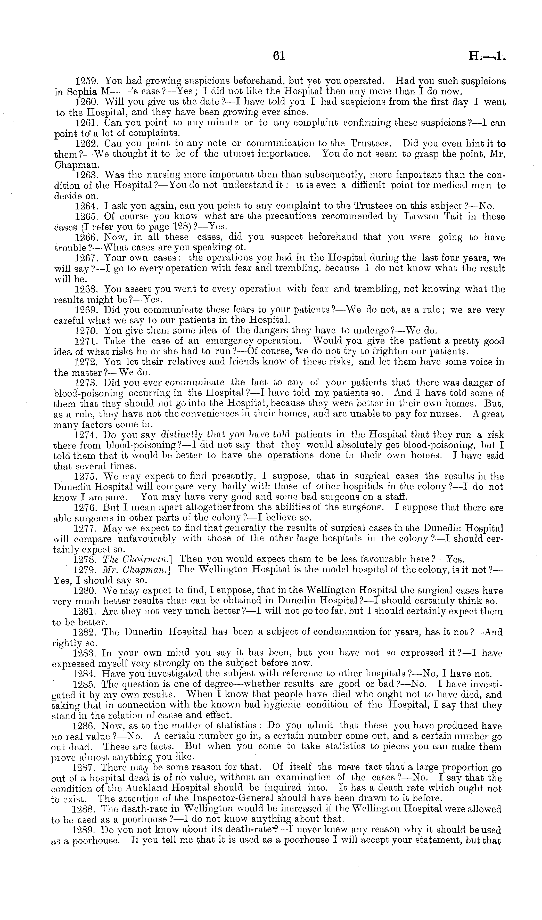 1259. You had growing suspicions beforehand, but yet you operated. Had you such suspicions in Sophia M 's case?— Yes; I did not like the Hospital then any more than Ido now. 1260. "Will you give us the date ?—I have told you I had suspicions from the first day I went to the Hospital, and they have been growing ever since. 1261. Can you point to any minute or to any complaint confirming these suspicions ?—lean point to' a lot of complaints. 1262. Can you point to any note or communication to the Trustees. Did you even hint it to them? —We thought it to be of the utmost importance. You do not seem to grasp the point, Mr. Chapman. 1263. Was the nursing more important then than subsequently, more important than the condition of the Hospital ?—You do not understand it: it is even a difficult point for medical men to decide on. 1264. I ask you again, can you point to any complaint to the Trustees on this subject?— No. 1265. Of course you know what are the precautions recommended by Lawson Tait in these cases (I refer you to page 128) ? —Yes. 1266. Now, in all these cases, did you suspect beforehand that you were going to have trouble? —What cases are you speaking of. 1267. Your own cases : the operations you had in the Hospital during the last four years, we will say ? —I go to every operation with fear and trembling, because Ido not know what the result will be. 1268. You assert you went to every operation with fear and trembling, not knowing what the results might be? —Yes. 1269. Did you communicate these fears to your patients ? —We do not, as a rule ; we are very careful what we say to our patients in the Hospital. 1270. You give them some idea of the dangers they have to undergo?—We do. 1271. Take the case of an emergency operation. Would you give the patient a pretty good idea of what risks he or she had to run ? —Of course, we do not try to frighten our patients. 1272. You let their relatives and friends know of these risks, and let them have some voice in the matter? —We do. 1273. Did you ever communicate the fact to any of your patients that there was danger of blood-poisoning occurring in the Hospital ?—I have told my patients so. And I have told some of them that they should not go into the Hospital, because they were better in their own homes. But, as a rule, they have not the conveniences in their homes, and are unable to pay for nurses. A great many factors come in. 1274. Do you say distinctly that you have told patients in the Hospital that they run a risk therefrom blood-poisoning? —I did not say that they would absolutely get blood-poisoning, but I told them that it would be better to have the operations done in their own homes. I have said that several times. 1275. We may expect to find presently, I suppose, that in surgical cases the results in the Dunedin Hospital will compare very badly with those of other hospitals in the colony ?—I do not know lam sure. You may have very good and some bad surgeons on a staff. 1276. But I mean apart altogether from the abilities of the surgeons. I suppose that there are able surgeons in other parts of the colony? —I believe so. 1277. May we expect to find that generally the results of surgical cases in the Dunedin Hospital will compare unfavourably with those of the other large hospitals in the colony ?—I should certainly expect so. 1278. The Chairman.] Then you would expect them to be less favourable here?— Yes. 1279. Mr. Chapman.] The Wellington Hospital is the model hospital of the colony, is it not?— Yes, I should say so. 1280. We may expect to find, I suppose, that in the Wellington Hospital the surgical cases have very much better results than can be obtained in Dunedin Hospital ?—I should certainly think so. 1281. Are they not very much better?—l will not go too far, but I should certainly expect them to be better. 1282. The Dunedin Hospital has been a subject of condemnation for years, has it not?— And rightly so. 1283. In your own mind you say it has been, but you have not so expressed it?—l have expressed myself very strongly on the subject before now. 1284. Have you investigated the subject with reference to other hospitals ?—No, I have not. 1285. The question is one of degree —whether results are good or bad ? —No. I have investigated it by my own results. When I know that people have died who ought not to have died, and taking that in connection with the known bad hygienic condition of the Hospital, I say that they stand in the relation of cause and effect. 1286. Now, as to the matter of statistics : Do you admit that these you have produced have no real value ?—No. A certain number go in, a certain number come out, and a certain number go out dead. These are facts. But when you come to take statistics to pieces you can make them prove almost anything you like. 1287. There may be some reason for that. Of itself the mere fact that a large proportion go out of a hospital dead is of no value, without an examination of the cases ?—No. I say that the condition of the Auckland Hospital should be inquired into. It has a death rate which ought not to exist. The attention of the Inspector-General should have been drawn to it before. 1288. The death-rate in Wellington would be increased if ihe Wellington Hospital were allowed to be used as a poorhouse ? —I do not know anything about that. 1289. Do you not know about its death-rate ■? —I never knew any reason why it should be used as a poorhouse. If you tell me that it is used as a poorhouse I will accept your statement, but that