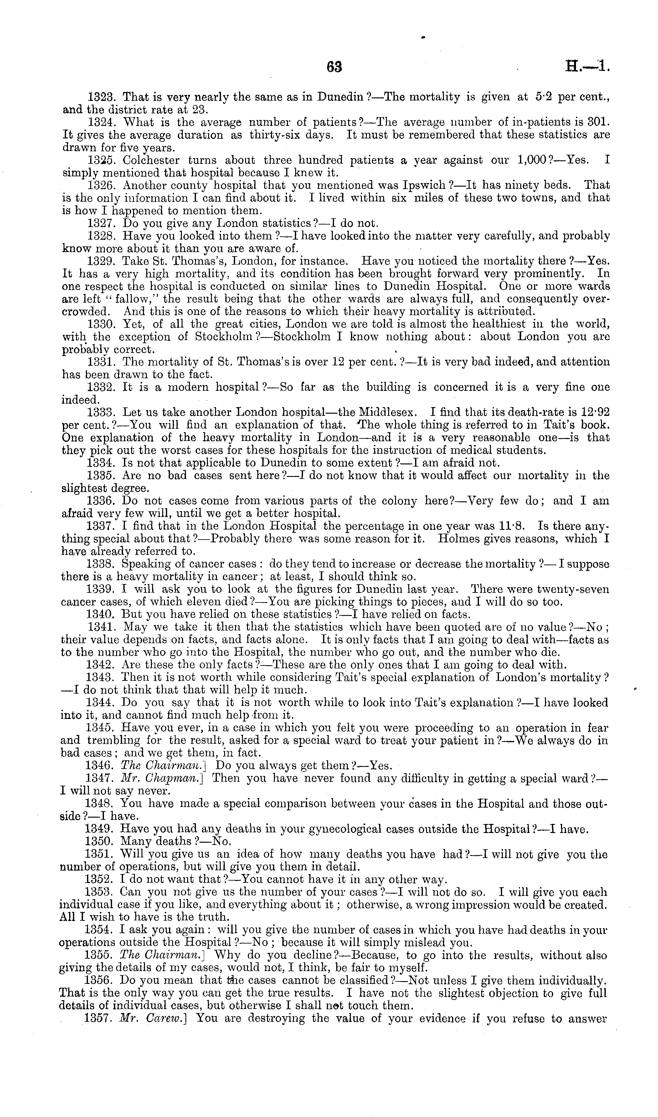 1323. That is very nearly the same as in Dunedin?—The mortality is given at 52 per cent., and the district rate at 23. 1324. What is the average number of patients?— The average number of in-patients is 301. It gives the average duration as thirty-six days. It must be remembered that these statistics are drawn for five years. 1325. Colchester turns about three hundred patients a year against our 1,000? —Yes. I simply mentioned that hospital because I knew it. 1326. Another county hospital that you mentioned was Ipswich ?—lt has ninety beds. That is the only information I can find about it. I lived within six miles of these two towns, and that is how I happened to mention them. 1327. Do you give any London statistics?—l do not. 1328. Have you looked into them?—l have looked into the matter very carefully, and probably know more about it than you are aware of. 1329. Take St. Thomas's, London, for instance. Have you noticed the mortality there ?—-Yes. It has a very high mortality, and its condition has been brought forward very prominently. In one respect the hospital is conducted on similar lines to Dunedin Hospital. One or more wards are left " fallow," the result being that the other wards are always full, and consequently overcrowded. And this is one of the reasons to -which their heavy mortality is attributed. 1330. Yet, of all the great cities, London we are told is almost the healthiest in the world, with the exception of Stockholm ?■—Stockholm I know nothing about: about London you are probably correct. 1331. The mortality of St. Thomas's is over 12 per cent. ?—lt is very bad indeed, and attention has been drawn to the fact. 1332. It is a modern hospital ? —So far as the building is concerned it is a very fine one indeed. 1333. Let us take another London hospital—the Middlesex. I find that its death-rate is 12-92 per cent. ?—You will find an explanation of that. The whole thing is referred to in Tait's book. One explanation of the heavy mortality in London—and it is a very reasonable one—is that they pick out the worst cases for these hospitals for the instruction of medical students. 1334. Is not that applicable to Dunedin to some extent ?—I am afraid not. 1335. Are no bad cases sent here ?—I do not know that it would affect our mortality in the slightest degree. 1336. Do not cases come from various parts of the colony here?— Very few do; and I am afraid very few will, until we get a better hospital. 1337. I find that in the London Hospital the percentage in one year was 11-8. Is there anything special about that ?—Probably there was some reason for it. Holmes gives reasons, which I have already referred to. 1338. Speaking of cancer cases :do they tend to increase or decrease the mortality ?— I suppose there is a heavy mortality in cancer; at least, I should think so. 1339. I will ask you to look at the figures for Dunedin last year. There were twenty-seven cancer cases, of which eleven died?— You are picking things to pieces, and I will do so too. 1340. But you have relied on these statistics ?—I have relied on facts. 1341. May we take it then that the statistics which have been quoted are of no value?—No ; their value depends on facts, and facts alone. It is only facts that lam going to deal with—facts as to the number who go into the Hospital, the number who go out, and the number who die. 1342. Are these the only facts ?—These are the only ones that I am going to deal with. 1343. Then it is not worth while considering Tait's special explanation of London's mortality ? —I do not think that that will help it much. 1344. Do you say that it is not worth while to look into Tait's explanation ?—I have looked into it, and cannot find much help from it. 1345. Have you ever, in a case in which you felt you were proceeding to an operation in fear and trembling for the result, asked for a special ward to treat your patient in ?—We always do in bad cases ; and we get them, in fact. 1346. The Chairman.] Do you always get them ?—Yes. 1347. Mr. Chapman.] Then you have never found any difficulty in getting a special ward?— I will not say never. 1348. You have made a special comparison between your cases in the Hospital and those outside ?—I have. 1349. Have you had any deaths in your gynecological cases outside the Hospital?—l have. 1350. Many deaths ?—No. 1351. Will you give us an idea of how many deaths you have had?—l will not give you the number of operations, but will give you them in detail. 1352. Ido not want that?— You cannot have it in any other way. 1353. Can you not give us the number of your cases ?—I will not do so. I will give you each individual case if you like, and everything about it; otherwise, a wrong impression would be created. All I wish to have is the truth. 1354. I ask you again : will you give the number of cases in which you have had deaths in your operations outside the Hospital ? —No ; because it will simply mislead you. 1355. The Chairman.] Why do you decline ?—Because, to go into the results, without also giving the details of my cases, would not, I think, be fair to myself. 1356. Do you mean that the cases cannot be classified?— Not unless I give them individually. That is the only way you can get the true results. I have not the slightest objection to give full details of individual cases, but otherwise I shall not touch them. 1357. Mr. Came] You are destroying the value of your evidence if you refuse to answer