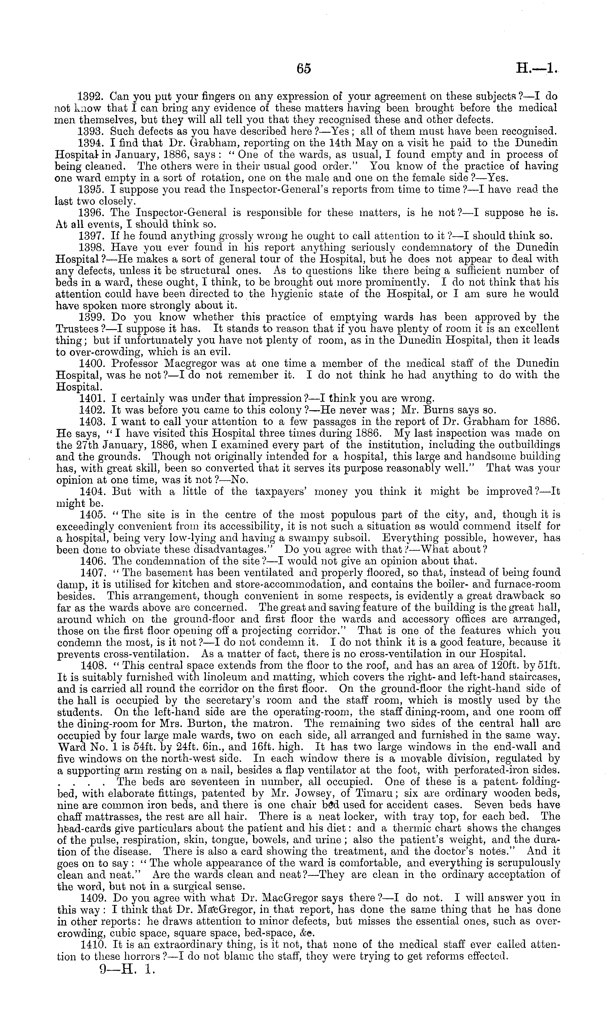 1392. Can you put your fingers on any expression of your agreement on these subjects ?—I do not know that I can bring any evidence of these matters having been brought before the medical men themselves, but they will all tell you that they recognised these and other defects. 1393. Such defects as you have described here ?—Yes; all of them must have been recognised. 1394. I find that Dr. Grabham, reporting on the 14th May on a visit he paid to the Dunedin Hospital: in January, 1886, says : " One of the wards, as usual, I found empty and in process of being cleaned. The others were in their usual good order." You know of the practice of having one ward empty in a sort of rotation, one on the male and one on the female side ?—Yes. 1395. I suppose you read the Inspector-General's reports from time to time ? —I have read the last two closely. 1396. The Inspector-General is responsible for these matters, is lie not ?—I suppose he is. At all events, I should think so. 1397. If he found anything grossly wrong he ought to call attention to it ? —I should think so. 1398. Have you ever found in his report anything seriously condemnatory of the Dunedin Hospital ?—He makes a sort of general tour of the Hospital, but he does not appear to deal with any defects, unless it be structural ones. As to questions like there being a sufficient number of beds in a ward, these ought, I think, to be brought out more prominently. I do not think that his attention could have been directed to the hygienic state of the Hospital, or I am sure he would have spoken more strongly about it. 1399. Do you know whether this practice of emptying wards has been approved by the Trustees ?—I suppose it has. It stands to reason that if you have plenty of room it is an excellent thing; but if unfortunately you have not plenty of room, as in the Dunedin Hospital, then it leads to over-crowding, which is an evil. 1400. Professor Macgregor was at one time a member of the medical staff of the Dunedin Hospital, was he not ?—I do not remember it. Ido not think he had anything to do with the Hospital. 1401. I certainly was under that impression?—l think you are wrong. 1402. It was before you came to this colony ?—He never was; Mr. Burns says so. 1403. I want to call your attention to a few passages in the report of Dr. Grabham for 1886. He says, " I have visited this Hospital three times during 1886. My last inspection was made on the 27th January, 1886, when I examined every part of the institution, including the outbuildings and the grounds. Though not originally intended for a hospital, this large and handsome building has, with great skill, been so converted that it serves its purpose reasonably well." That was your opinion at one time, was it not ? —No. 1404. But with a little of the taxpayers' money you think it might be improved?—lt might be. 1405. " The site is in the centre of the most populous part of the city, and, though it is exceedingly convenient from its accessibility, it is not such a situation as would commend itself for a hospital, being very low-lying and having a swampy subsoil. Everything possible, however, has been done to obviate these disadvantages." Do you agree with that I —What about? 1406. The condemnation of the site?—l would not give an opinion about that. 1407. " The basement has been ventilated and properly floored, so that, instead of being found damp, it is utilised for kitchen and store-accommodation, and contains the boiler- and furnace-room besides. This arrangement, though convenient in some respects, is evidently a great drawback so far as the wards above are concerned. The great and saving feature of the building is the great hall, around which on the ground-floor and first floor the wards and accessory offices are arranged, those on the first floor opening off a projecting corridor." That is one of the features which you condemn the most, is it not? —I do not condemn it. Ido not think it is a good feature, because it prevents cross-ventilation. As a matter of fact, there is no cross-ventilation in our Hospital. 1408. " This central space extends from the floor to the roof, and has an area of 120 ft. by 51ft. It is suitably furnished with linoleum and matting, which covers the right- and left-hand staircases, and is carried all round the corridor on the first floor. On the ground-floor the right-hand side of the hall is occupied by the secretary's room and the staff room, which is mostly used by the students. On the left-hand side are the operating-room, the staff dining-room, and one room off the dining-room for Mrs. Burton, the matron. The remaining two sides of the central hall are occupied by four large male wards, two on each side, all arranged and furnished in the same way. Ward No. lis 54ft. by 24ft. 6in., and 16ft. high. It has two large windows in the end-wall and five windows on the north-west side. In each window there is a movable division, regulated by a supporting arm resting on a nail, besides a flap ventilator at the foot, with perforated-iron sides. . . . The beds are seventeen in number, all occupied. One of these is a patent- foldingbed, with elaborate fittings, patented by Mr. Jowsey, of Timaru; six are ordinary wooden beds, nine are common iron beds, and there is one chair bed used for accident cases. Seven beds have chaff mattrasses, the rest are all hair. There is a neat locker, with tray top, for each bed. The head-cards give particulars about the patient and his diet: and a thermic chart shows the changes of the pulse, respiration, skin, tongue, bowels, and urine ; also the patient's weight, and the duration of the disease. There is also a card showing the treatment, and the doctor's notes." And it goes on to say : " The whole appearance of the ward is comfortable, and everything is scrupuloiisly clean and neat." Are the wards clean and neat? —They are clean in the ordinary acceptation of the word, but not in a surgical sense. 1409. Do yo