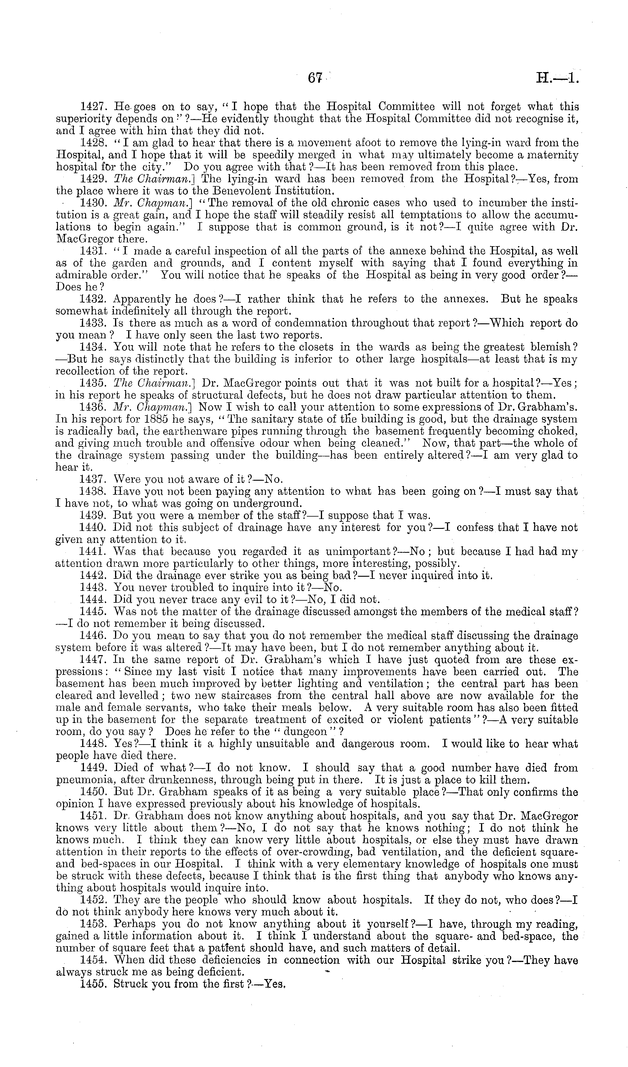 1427. He goes on to say, "I hope that the Hospital Committee will not forget what this superiority depends on " ? —He evidently thought that the Hospital Committee did not recognise it, and I agree with him that they did not. 1428. " I am glad to hear that there is a movement afoot to remove the lying-in ward from the Hospital, and I hope that it will be speedily merged in what may ultimately become a maternity hospital for the city." Do you agree with that ? —lt has been removed from this place. 1429. The Chairman.} The lying-in ward has been removed from the Hospital? —Yes, from the place where it was to the Benevolent Institution. 1430. Mr. Chapman.'] "The removal of the old chronic cases who used to incumber the institution is a great gain, and I hope the staff will steadily resist all temptations to allow the accumulations to begin again." I suppose that is common ground, is it not?—l quite agree with Dr. MacGregor there. 1431. " I made a careful inspection of all the parts of the annexe behind the Hospital, as well as of the garden and grounds, and I content myself with saying that I found everything in admirable order." You will notice that he speaks of the Hospital as being in very good order?— Does he ? 1432. Apparently he does ?—I rather think that he refers to the annexes. But he speaks somewhat indefinitely all through the report. 1433. Is there as much as a word of condemnation throughout that report ?—Which report do you mean ? I have only seen the last two reports. 1434. You will note that he refers to the closets in the wards as being the greatest blemish? —But he says distinctly that the building is inferior to other large hospitals—at least that is my recollection of the report. 1435. The Chairman.] Dr. MacGregor points out that it was not built for a hospital?— Yes; in his report he speaks of structural defects, but he does not draw particular attention to them. 1436. Mr. Chapman.] Now I wish to call your attention to some expressions of Dr. Grabham's. In his report for 1885 he says, " The sanitary state of trie building is good, but the drainage system is radically bad, the earthenware pipes running through the basement frequently becoming choked, and giving much trouble and offensive odour when being cleaned." Now, that part—the whole of the drainage system passing under the building—has been entirely altered ?—I am very glad to hear it. 1437. Were you not aware of it ?—No. 1438. Have you not been paying any attention to what has been going on ?—I must say that I have not, to what was going on underground. 1439. But you were a member of the staff? —I suppose that I was. 1440. Did not this subject of drainage have any interest for you ?—I confess that I have not given any attention to it. 1441. Was that because you regarded it as unimportant? —No; but because I had had my attention drawn more particularly to other things, more interesting, possibly. 1442. Did the drainage ever strike you as being bad?—l never inquired into it. 1443. You never troubled to inquire into it? —No. 1444. Did you never trace any evil to it ?—No, I did not. 1445. Was not the matter of the drainage discussed amongst the members of the medical staff? —I do not remember it being discussed. 1446. Do you mean to say that you do not remember the medical staff discussing the drainage system before it was altered ? —lt may have been, but I do not remember anything about it. 1447. In the same report of Dr. Grabham's which I have just quoted from are these expressions : " Since my last visit I notice that many improvements have been carried out. The basement has been much improved by better lighting and ventilation ; the central part has been cleared and levelled; two new staircases from the central hall above are now available for the male and female servants, who take their meals below. A very suitable room has also been fitted up in the basement for the separate treatment of excited or violent patients"?—A very suitable room, do you say ? Does he refer to the " dungeon " ? 1448. Yes?—l think it a highly unsuitable and dangerous room. I would like to hear what people have died there. 1449. Died of what ?—I do not know. I should say that a good number have died from pneumonia, after drunkenness, through being put in there. It is just a place to kill them. 1450. But Dr. Grabham speaks of it as being a very suitable place ? —That only confirms the opinion I have expressed previously about his knowledge of hospitals. 1451. Dr, Grabham does not know anything about hospitals, and you say that Dr. MacGregor knows very little about them ?—No, I do not say that he knows nothing; Ido not think he knows much. I think they can know very little about hospitals, or else they must have drawn attention in their reports to the effects of over-crowding, bad ventilation, and the deficient squareand bed-spaces in our Hospital. I think with a very elementary knowledge of hospitals one must be struck with these defects, because I think that is the first thing that anybody who knows anything about hospitals would inquire into. 1452. They are the people who should know about hospitals. If they do not, who does?—l do not think anybody here knows very much about it. 1453. Perhaps you do not know anything about it yourself?—l have, through my reading, gained a little information about it. I think I understand about the square- and bed-space, the number of square feet that a patient should have, and such matters of detail. 1454. When did these deficiencies in connection with our Hospital strike you ?—They have always struck me as being deficient. 1455. Struck you from the first ? —Yes,