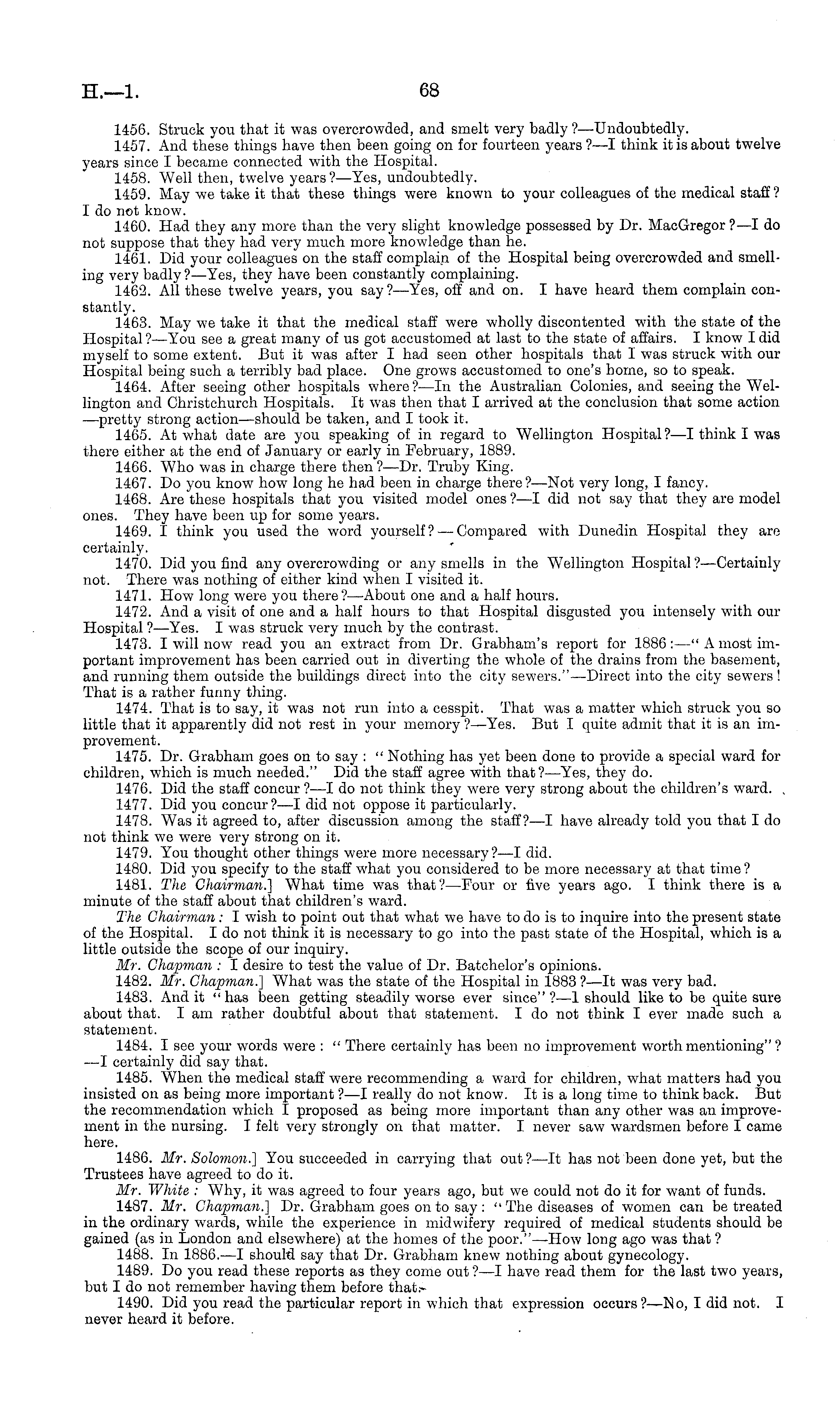 1456. Struck you that it was overcrowded, and smelt very badly ?—Undoubtedly. 1457. And these things have then been going on for fourteen years ?—I think it is about twelve years since I became connected with the Hospital. 1458. Well then, twelve years ?—Yes, undoubtedly. 1459. May we take it that these things were known to your colleagues of the medical staff? I do not know. 1460. Had they any more than the very slight knowledge possessed by Dr. MacGregor ? —I do not suppose that they had very much more knowledge than he. 1461. Did your colleagues on the staff complain of the Hospital being overcrowded and smelling very badly ?—Yes, they have been constantly complaining. 1462. All these twelve years, you say? —Yes, off and on. I have heard them complain constantly. 1463. May we take it that the medical staff were wholly discontented wdth the state of the Hospital?— You see a great many of us got accustomed at last to the state of affairs. I know I did myself to some extent. But it was after I had seen other hospitals that I was struck with our Hospital being such a terribly bad place. One grows accustomed to one's borne, so to speak. 1464. After seeing other hospitals where ?—ln the Australian Colonies, and seeing the Wellington and Christchurch Hospitals. It was then that I arrived at the conclusion that some action —pretty strong action—should be taken, and I took it. 1465. At what date are you speaking of in regard to Wellington Hospital?—l think I was there either at the end of January or early in February, 1889. 1466. Who was in charge there then?— Dr. Truby King. 1467. Do you know how long he had been in charge there?— Not very long, I fancy. 1468. Are these hospitals that you visited model ones ?—I did not say that they are model ones. They have been up for some years. 1469. I think you used the word yourself? — Compared with Dunedin Hospital they are certainly. 1470. Did you find any overcrowding or any smells in the Wellington Hospital ? —Certainly not. There was nothing of either kind when I visited it. 1471. How long were you there? —About one and a half hours. 1472. And a visit of one and a half hours to that Hospital disgusted you intensely with our Hospital ?—Yes. I was struck very much by the contrast. 1473. I will now read you an extract from Dr. Grabham's report for 1886: —" A most important improvement has been carried out in diverting the whole of the drains from the basement, and running them outside the buildings direct into the city sewers."—Direct into the city sewers ! That is a rather funny thing. 1474. That is to say, it was not run into a cesspit. That was a matter which struck you so little that it apparently did not rest in your memory ? —Yes. But I quite admit that it is an improvement. 1475. Dr. Grabham goes on to say : " Nothing has yet been done to provide a special ward for children, which is much needed." Did the staff agree with that?— Yes, they do. 1476. Did the staff concur ? —I do not think they were very strong about the children's ward. , 1477. Did you concur? —I did not oppose it particularly. 1478. Was it agreed to, after discussion among the staff?—l have already told you that I do not think we were very strong on it. 1479. You thought other things were more necessary?-—I did. 1480. Did you specify to the staff what you considered to be more necessary at that time ? 1481. The Chairman.] What time was that?— Four or five years ago. I think there is a minute of the staff about that children's ward. The Chairman: I wish to point out that what we have to do is to inquire into the present state of the Hospital. Ido not think it is necessary to go into the past state of the Hospital, which is a little outside the scope of our inquiry. Mr. Chapman : I desire to test the value of Dr. Batchelor's opinions. 1482. Mr. Chapman.] What was the state of the Hospital in 1883 ?—lt was very bad. 1483. And it " has been getting steadily worse ever since" ?—1 should like to be quite sure about that. I am rather doubtful about that statement. I do not think I ever made such a statement. 1484. I see your words were : " There certainly has been no improvement worth mentioning" ? —I certainly did say that. 1485. When the medical staff were recommending a ward for children, what matters had you insisted on as being more important ?—I really do not know. It is a long time to think back. But the recommendation which I proposed as being more important than any other was an improvement in the nursing. I felt very strongly on that matter. I never saw wardsmen before I came here. 1486. Mr. Solomon.] You succeeded in carrying that out ? —lt has not been done yet, but the Trustees have agreed to do it. Mr. White : Why, it was agreed to four years ago, but we could not do it for want of funds. 1487. Mr. Chapman.] Dr. Grabham goes onto say: "The diseases of women can be treated in the ordinary wards, while the experience in midwifery required of medical students should be gained (as in London and elsewhere) at the homes of the poor."—How long ago was that ? 1488. In 1886.—1 should say that Dr. Grabham knew nothing about gynecology. 1489. Do you read these reports as they come out ? —I have read them for the last two years, but I do not remember having them before that.--1490. Did you read the particular report in which that expression occurs?—No, I did not. I never heard it before.