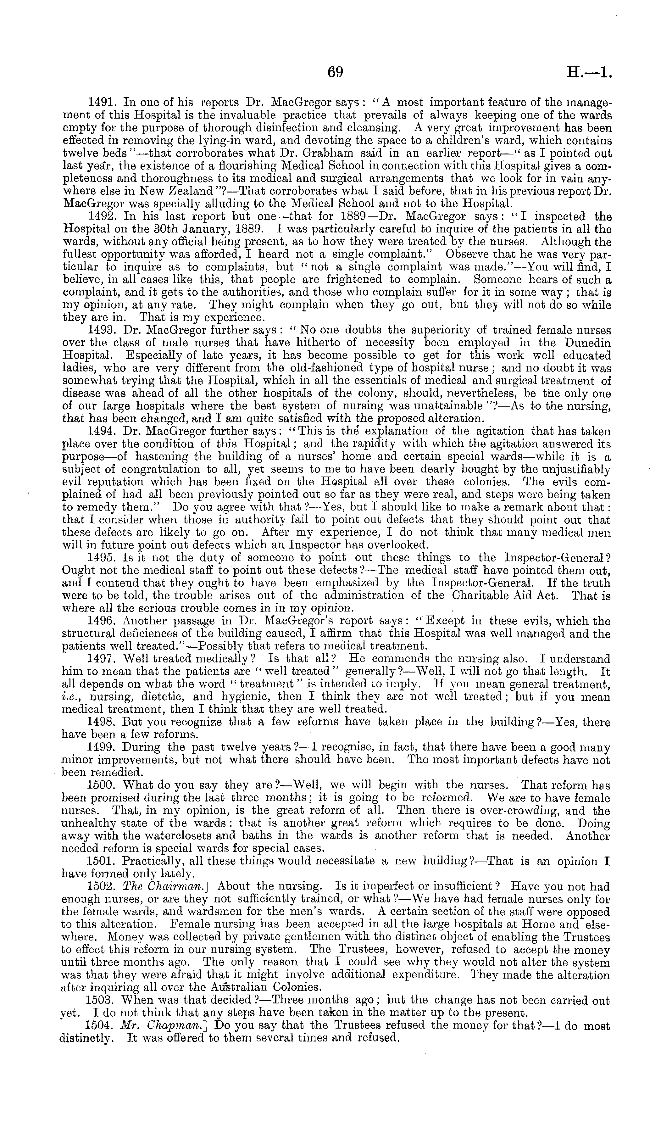 1491. In one of his reports Dr. MacGregor says : "A most important feature of the management of this Hospital is the invaluable practice that prevails of always keeping one of the wards empty for the purpose of thorough disinfection and cleansing. A very great improvement has been effected in removing the lying-in ward, and devoting the space to a children's ward, which contains twelve beds "—that corroborates what Dr. Grabham said in an earlier report—" as I pointed out last year, the existence of a flourishing Medical School in connection with this Hospital gives a completeness and thoroughness to its medical and surgical arrangements that we look for in vain anywhere else in New Zealand"? —That corroborates what I said, before, that in his previous report Dr. MacGregor was specially alluding to the Medical School and not to the Hospital. 1492. In his last report but one —that for 1889—Dr. MacGregor says: "I inspected the Hospital on the 30th January, 1889. I was particularly careful to inquire of the patients in all the wards, without any official being present, as to how they were treated by the nurses. Although the fullest opportunity was afforded, I heard not a single complaint." Observe that he was very particular to inquire as to complaints, but "not a single complaint was made."—You will find, I believe, in all cases like this, that people are frightened to complain. Someone hears of such a complaint, and it gets to the authorities, and those who complain suffer for it in some way ; that is my opinion, at any rate. They might complain when they go out, but they will not do so while they are in. That is my experience. 1493. Dr. MacGregor further says : " No one doubts the superiority of trained female nurses over the class of male nurses that have hitherto of necessity been employed in the Dunedin Hospital. Especially of late years, it has become possible to get for this work well educated ladies, who are very different from the old-fashioned type of hospital nurse ; and no doubt it was somewhat trying that the Hospital, which in all the essentials of medical and surgical treatment of disease was ahead of all the other hospitals of the colony, should, nevertheless, be the only one of our large hospitals where the best system of nursing was unattainable '"? —As to the nursing, that has been changed, and I am quite satisfied with the proposed alteration. 1494. Dr. MacGregor further says: " This is the' explanation of the agitation that has taken place over the condition of this Hospital; and the rapidity with which the agitation answered its purpose—of hastening the building of a nurses' home and certain special wards—while it is a subject of congratulation to all, yet seems to me to have been dearly bought by the unjustifiably evil reputation which has been fixed on the Hospital all over these colonies. The evils complained of had all been previously pointed out so far as they were real, and steps were being taken to remedy them." Do you agree with that ?—Yes, but I should like to make a remark about that: that I consider when those in authority fail to point out defects that they should point out that these defects are likely to go on. After my experience, I do not think that many medical men will in future point out defects which an Inspector has overlooked. 1495. Is it not the duty of someone to point out these things to the Inspector-General? Ought not the medical staff to point out these defects ?—The medical staff have pointed them out, and I contend that they ought to have been emphasized by the Inspector-General. If the truth were to be told, the trouble arises out of the administration of the Charitable Aid Act. That is where all the serious trouble comes in in my opinion. 1496. Another passage in Dr. MacGregor's report says: "Except in these evils, which the structural deficiences of the building caused, I affirm that this Hospital was well managed and the patients well treated."—Possibly that refers to medical treatment. 1497. Well treated medically ? Is that all? He commends the nursing also. I understand him to mean that the patients are " well treated" generally? —Well, I will not go that length. It all depends on what the word " treatment "is intended to imply. If you mean general treatment, i.e., nursing, dietetic, and hygienic, then I think they are not well treated; but if you mean medical treatment, then I think that they are well treated. 1498. But you recognize that a few reforms have taken place in the building ?—Yes, there have been a few reforms. 1499. During the past twelve years ?— I recognise, in fact, that there have been a good many minor improvements, but not what there should have been. The most important defects have not been remedied. 1500. What do you say they are?— Well, we will begin with the nurses. That reform has been promised during the last three months; it is going to be reformed. We are to have female nurses. That, in my opinion, is the great reform of all. Then there is over-crowding, and the unhealthy state of the wards : that is another great reform which requires to be done. Doing away with the waterclosets and baths in the wards is another reform that is needed. Another needed reform is special wards for special cases. 1501. Practically, all these things would necessitate a new building?— That is an opinion I have formed only lately. 1502. The Chairman.] About the nursing. Is it imperfect or insufficient ? Have you not had enough nurses, or are they not sufficiently trained, or what ?—We have had female nurses only for the female wards, and wardsmen for the men's wards. A certain section of the staff were opposed to this alteration. Female nursing has been accepted in all the large hospitals at Home and elsewhere. Money was collected by private gentlemen with the distinct object of enabling the Trustees to effect this reform in our nursing system. The Trustees, however, refused to accept the money 