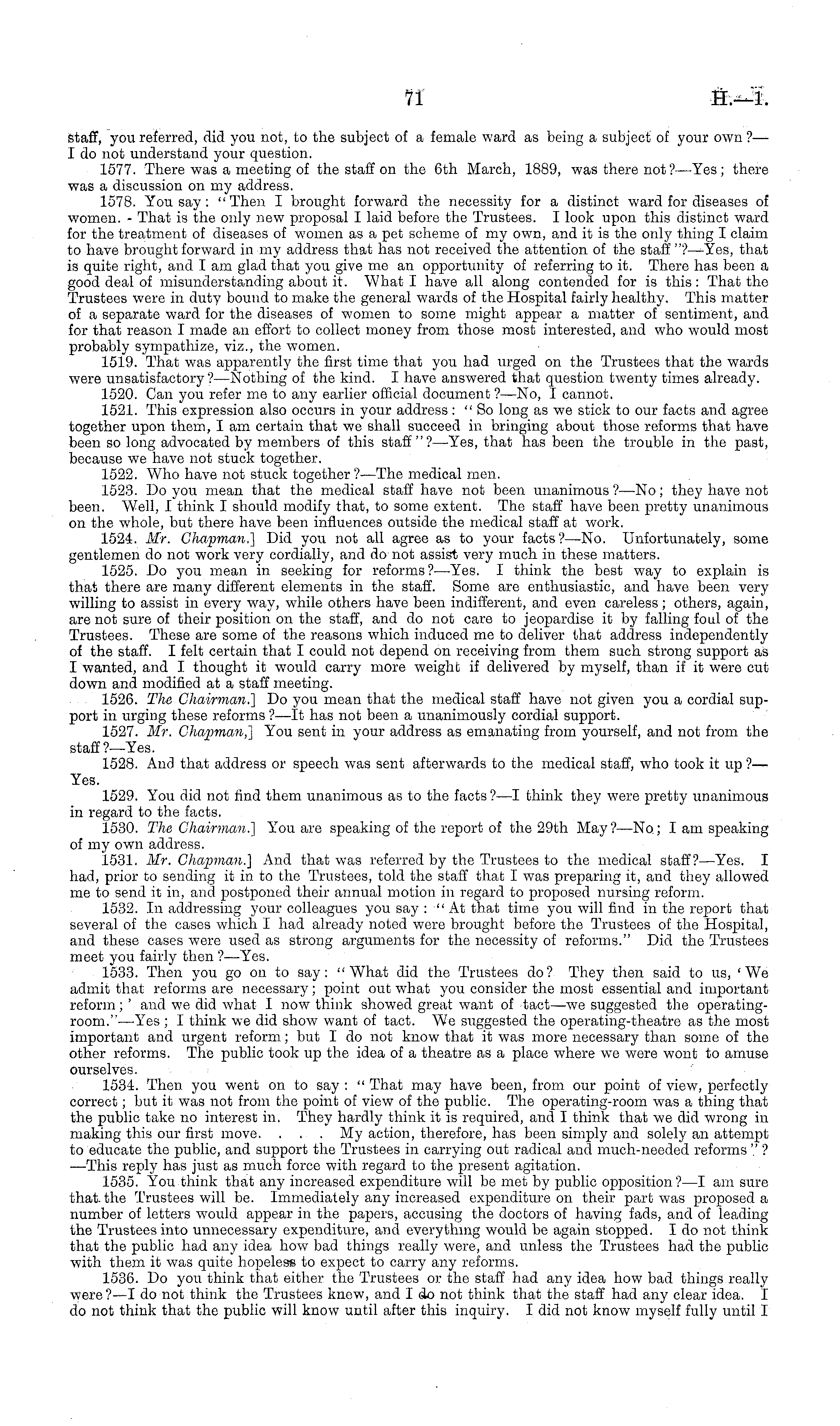 staff, you referred, did you not, to the subject of a female ward as being a subject of your own? — I do not understand your question. 1577. There was a meeting of the staff on the 6th March, 1889, was there not?— Yes; there was a discussion on my address. 1578. You say: "Then I brought forward the necessity for a distinct ward for diseases of women. - That is the only new proposal I laid before the Trustees. I look upon this distinct ward for the treatment of diseases of women as a pet scheme of my own, and it is the only thing I claim to have brought forward in my address that has not received the attention of the staff"?— Yes, that is quite right, and lam glad that you give me an opportunity of referring to it. There has been a good deal of misunderstanding about it. What I have all along contended for is this: That the Trustees were in duty bound to make the general wards of the Hospital fairly healthy. This matter of a separate ward for the diseases of women to some might appear a matter of sentiment, and for that reason I made an effort to collect money from those most interested, and who would most probably sympathize, viz., the women. 1519. That was apparently the first time that you had urged on the Trustees that the wards were unsatisfactory? —Nothing of the kind. I have answered that question twenty times already. 1520. Can you refer me to any earlier official document ?—No, I cannot. 1521. This expression also occurs in your address : " So long as we stick to our facts and agree together upon them, I am certain that we shall succeed in bringing about those reforms that have been so long advocated by members of this staff"?— Yes, that has been the trouble in the past, because we have not stuck together. 1522. Who have not stuck together ?—The medical men. 1523. Do you mean that the medical staff have not been unanimous ?—No; they have not been. Well, I think I should modify that, to some extent. The staff have been pretty unanimous on the whole, but there have been influences outside the medical staff at work. 1524. Mr. Chapman.] Did you not all agree as to your facts ? —No. Unfortunately, some gentlemen do not work very cordially, and do not assist very much in these matters. 1525. Do you mean in seeking for reforms?— Yes. I think the best way to explain is that there are many different elements in the staff. Some are enthusiastic, and have been very willing to assist in every way, while others have been indifferent, and even careless; others, again, are not sure of their position on the staff, and do not care to jeopardise it by falling foul of the Trustees. These are some of the reasons which induced me to deliver that address independently of the staff. I felt certain that I could not depend on receiving from them such strong support as I wanted, and I thought it would carry more weight if delivered by myself, than if it were cut down and modified at a staff meeting. 1526. The Chairman.] Do you mean that the medical staff have not given you a cordial support in urging these reforms ?—lt has not been a unanimously cordial support. 1527. Mr. Chapman,] You sent in your address as emanating from yourself, and not from the staff ?—Yes. 1528. And that address or speech was sent afterwards to the medical staff, who took it up ?— Yes. 1529. You did not find them unanimous as to the facts ?—I think they were pretty unanimous in regard to the facts. 1530. The Chairman.] You are speaking of the report of the 29th May ? —No; lam speaking of my own address. 1531. Mr. Chapman.] And that was referred by the Trustees to the medical staff?— Yes. I had, prior to sending it in to the Trustees, told the staff that I was preparing it, and they allowed me to send it in, and postponed their annual motion in regard to proposed nursing reform. 1532. In addressing your colleagues you say : " At that time you will find in the report that several of the cases which I had already noted were brought before the Trustees of the Hospital, and these cases were used as strong arguments for the necessity of reforms." Did the Trustees meet you fairly then ?—Yes. 1533. Then you go on to say: "What did the Trustees do? They then said to us, 'We admit that reforms are necessary; point out what you consider the most essential and important reform; ' and we did what I now think showed great want of tact—we suggested the operatingroom."—Yes ; I think we did show want of tact. We suggested the operating-theatre as the most important and urgent reform; but I do not know that it was more necessary than some of the other reforms. The public took up the idea of a theatre as a place where we were wont to amuse ourselves. 1534. Then you went on to say : " That may have been, from our point of view, perfectly correct; but it was not from the point of view of the public. The operating-room was a thing that the public take no interest in. They hardly think it is required, and I think that we did wrong in making this our first move. . . . My action, therefore, has been simply and solely an attempt to educate the public, and support the Trustees in carrying out radical and much-needed reforms'.' ? —This reply has just as much force with regard to the present agitation. 1535. You think that any increased expenditure will be met by public opposition? —I am sure that the Trustees will be. Immediately any increased expenditure on their part was proposed a number of letters would appear in the papers, accusing the doctors of having fads, and of leading the Trustees into unnecessary expenditure, and everything would be again stopped. Ido not think that the public had any idea how bad things really were, and unless the Trustees had the public with them it was quite hopeless to expect to carry any reforms. 1536. Do you think that either the Trustees or the staff had any idea how bad things really were ? —I do not think the Trustees knew, and Ido not think that the staff had any clear idea. I