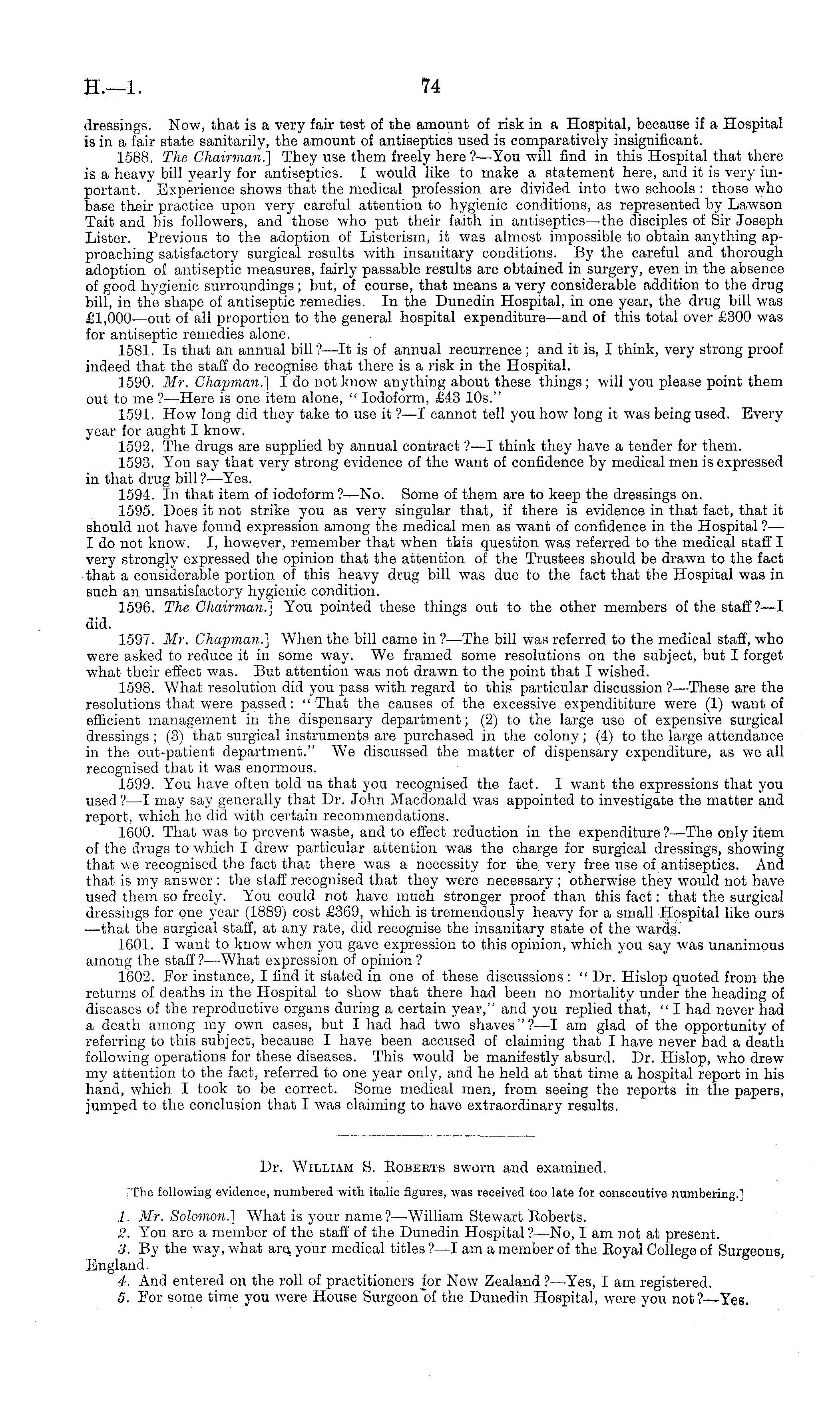 Dr. William S. Boberts sworn and examined. [The following evidence, numbered with italic figures, was received too late for consecutive numbering.] 1. Mr. Solomon.} What is your name?— William Stewart Eoberts. 2. You are a member of the staff of the Dunedin Hospital ?—No, I am not at present. 3. By the way, what are, your medical titles ?—I am a member of the Eoyal College of Surgeons, England. 4. And entered on the roll of practitioners for New Zealand ?—Yes, I am registered. 5. For some time you were House Surgeon of the Dunedin Hospital, were you not?— Yes.