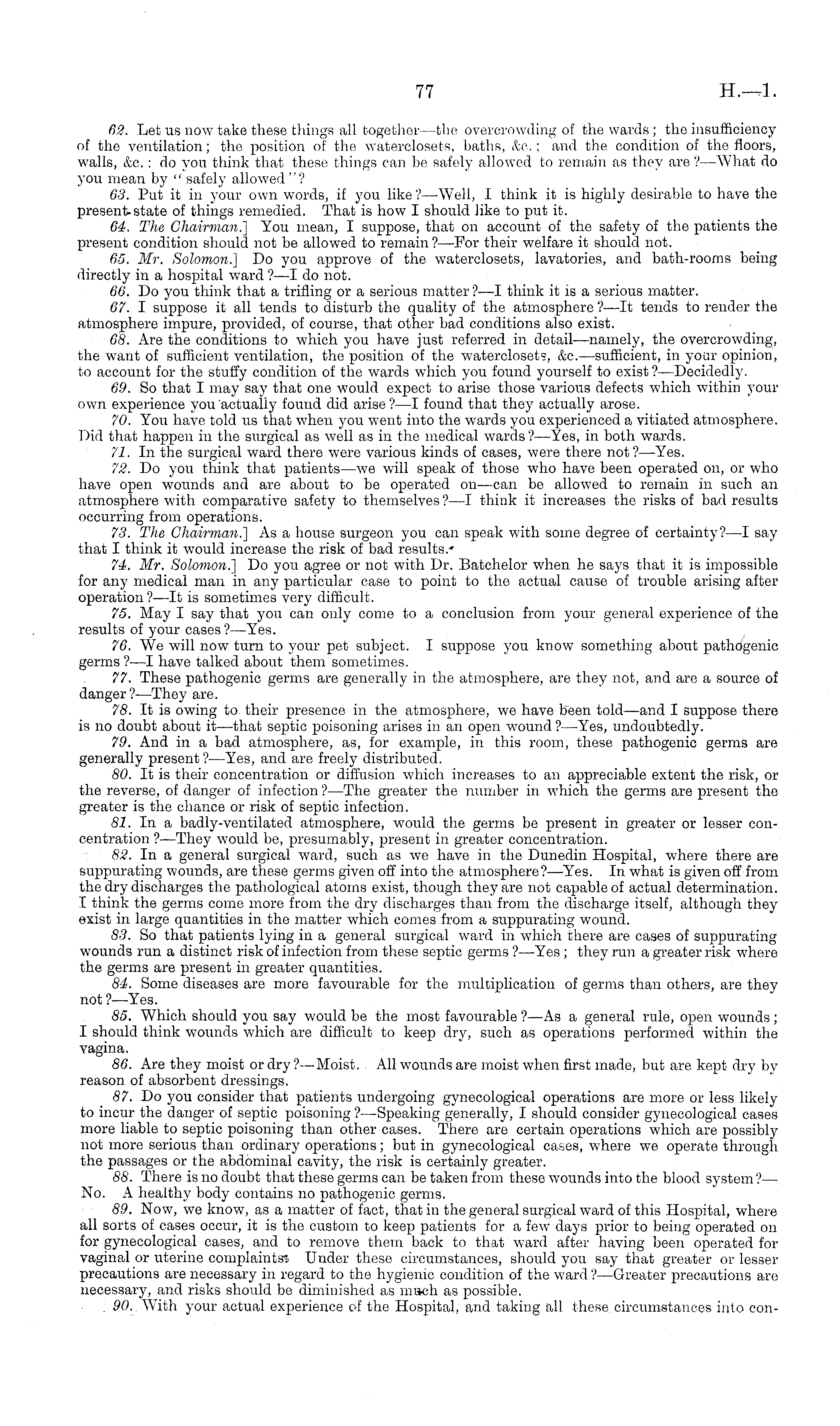 62. Let us now take these things all together—the overcrowding of the wards ; the insufficiency of the ventilation; the position of the waterclosets, baths, &c,; and the condition of the floors, walls, &c.: do you think that these, tilings can he safely allowed to remain as they are ?—What do you mean by " safely allowed "? 63. Put it in your own words, if you like ?—Well, I think it is highly desirable to have the present-state of things remedied. That is how I should, like to put it. 64. The Chairman.} You mean, I suppose, that on account of the safety of the patients the present condition should not be allowed to remain? —For their welfare it should not. 65. Mr. Solomon.] Do you approve of the waterclosets, lavatories, and bath-rooms being directly in a hospital ward ?—I do not. 66. Do you think that a trifling or a serious matter ? —I think it is a serious matter. 67. I suppose it all tends to disturb the quality of the atmosphere ?—lt tends to render the atmosphere impure, provided, of course, that other bad conditions also exist. 68. Are the conditions to which you have just referred in detail—namely, the overcrowding, the want of sufficient ventilation, the position of the waterclosets, &c.—sufficient, in your opinion, to account for the stuffy condition of the wards which you found yourself to exist ?—Decidedly. 69. So that I may say that one would expect to arise those various defects which within your own experience you actually found did arise?—l found that they actually arose. 70. You have told us that when you went into the wards you experienced a vitiated atmosphere. Did that happen in the surgical as well as in the medical wards ? —Yes, in both wards. 71. In the surgical ward there were various kinds of cases, were there not? —Yes. 72. Do you think that patients—we will speak of those who have been operated on, or who have open wounds and are about to be operated on—can be allowed to remain in such an atmosphere with comparative safety to themselves?—l think it increases the risks of bad results occurring from operations. 73. The Chairman.! As a house surgeon you can speak with some degree of certainty?—l say that I think it would increase the risk of bad results.' 74. Mr. Solomon.] Do you agree or not with Dr. Batchelor when he says that it is impossible for any medical man in any particular case to point to the actual cause of trouble arising after operation?—lt is sometimes very difficult. 75. May I say that you can only come to a conclusion from your general experience of the results of your cases?— Yes. 76. We will now turn to your pet subject. I suppose you know something about pathogenic germs ?■—l have talked about them sometimes. 77. These pathogenic germs are generally in the atmosphere, are they not, and are a source of danger ? —They are. 78. It is owing to their presence in the atmosphere, we have been told—and I suppose there is no doubt about it—that septic poisoning arises in an open wound ?—Yes, undoubtedly. 79. And in a bad atmosphere, as, for example, in this room, these pathogenic germs are generally present?— Yes, and are freely distributed. 80. It is their concentration or diffusion which increases to an appreciable extent the risk, or the reverse, of danger of infection ? —The greater the number in which the germs are present the greater is the chance or risk of septic infection. Si. In a badly-ventilated atmosphere, would the germs be present in greater or lesser concentration ?—They would be, presumably, present in greater concentration. 82. In a general surgical ward, such as we have in the Dunedin Hospital, where there are suppurating wounds, are these germs given off into the atmosphere?— Yes. In what is given off from the dry discharges the pathological atoms exist, though they are not capable of actual determination. I think the germs come more from the dry discharges than from the discharge itself, although they exist in large quantities in the matter which comes from a suppurating wound. 83. So that patients lying in a general surgical ward in which there are cases of suppurating wounds run a distinct risk of infection from these septic germs ? —Yes ; they run a greater risk where the germs are present in greater quantities. 84. Some diseases are more favourable for the multiplication of germs than others, are they not ?—Yes. 85. Which should you say would be the most favourable ? —As a general rule, open wounds; I should think wounds which are difficult to keep dry, such as operations performed within the vagina. 86. Are they moist or dry ?—Moist. All wounds are moist when first made, but are kept dry by reason of absorbent dressings. 87. Do you consider that patients undergoing gynecological operations are more or less likely to incur the danger of septic poisoning ?—Speaking generally, I should consider gynecological cases more liable to septic poisoning than other cases. There are certain operations which are possibly not more serious than ordinary operations; but in gynecological cases, where we operate through the passages or the abdominal cavity, the risk is certainly greater. 88. There is no doubt that these germs can be taken from these wounds into the blood system?— No. A healthy body contains no pathogenic germs. 89. Now, we know, as a matter of fact, that in the general surgical ward of this Hospital, where all sorts of cases occur, it is the custom to keep patients for a few days prior to being operated on for gynecological cases, and to remove them back to that ward after having been operated for vaginal or uterine complaints^ Under these circumstances, should you say that greater or lesser precautions are necessary in regard to the hygienic condition of the ward ? —Greater precautions are necessary, and risks should be diminished as much as possible. 90. With your actual experience of the Hospital, and taking all these circumstances into con-