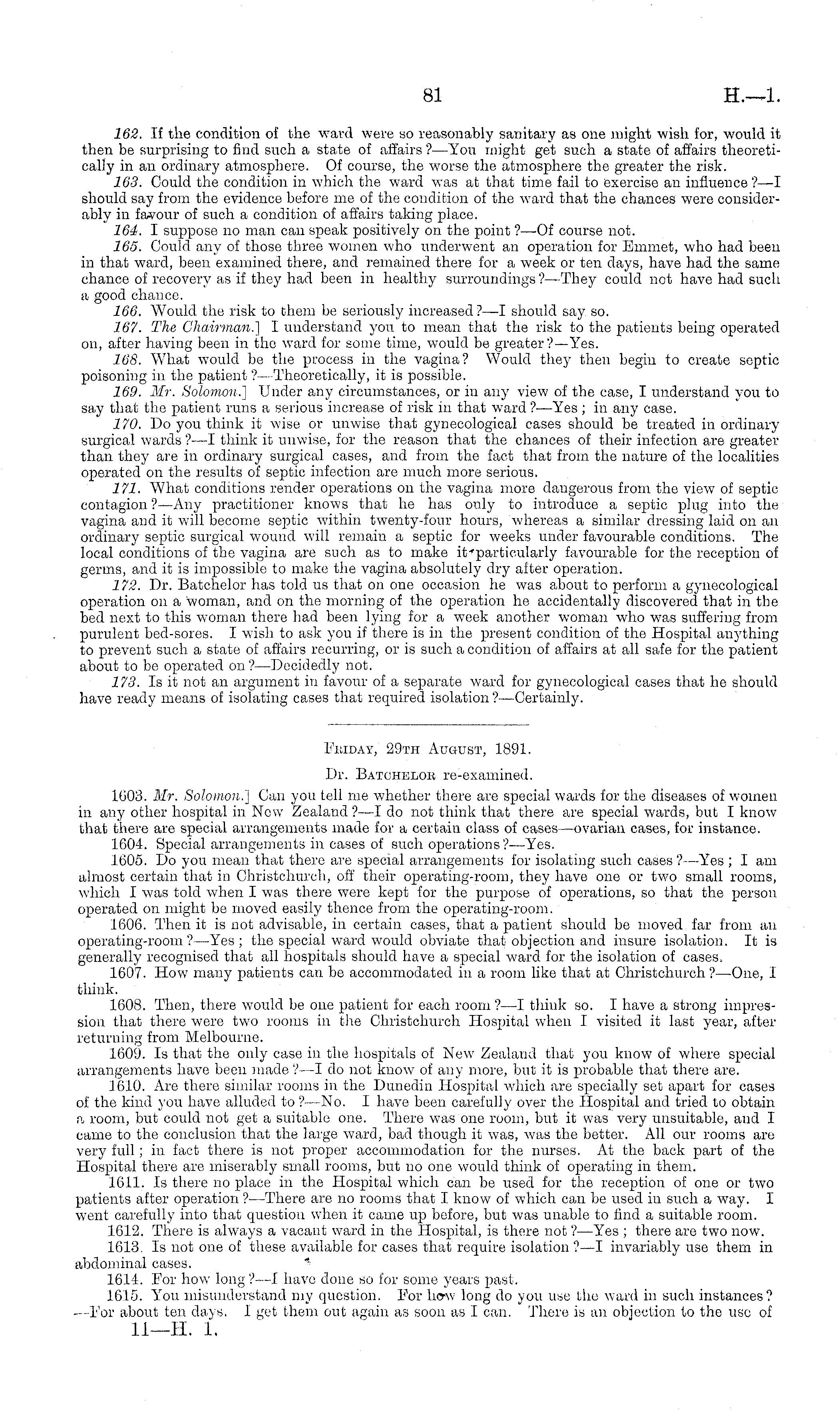 162. If the condition of the ward were so reasonably sanitary as one might wish for, would it then be surprising to find such a state of affairs ?—You might get such a state of affairs theoretically in an ordinary atmosphere. Of course, the worse the atmosphere the greater the risk. 163. Could the condition in which the ward was at that time fail to exercise an influence?—l should say from the evidence before me of the condition of the ward that the chances were considerably in favour of such a condition of affairs taking place. 164. I suppose no man can speak positively on the point ?—Of course not. 165. Could any of those three women who underwent an operation for Emmet, who had been in that ward, been examined there, and remained there for a week or ten days, have had the same chance of recovery as if they had been in healthy surroundings ?—They could not have had such a good chance. 166. Would the risk to them be seriously increased?—l should say so. 167. The Chairman.] I understand you to mean that the risk to the patients being operated on, after having been in the ward for some time, would be greater?— Yes. 168. What would be the process in the vagina? Would they then begin to create septic poisoning in the patient?— Theoretically, it is possible. 169. Mr. Solomon.] Under any circumstances, or in any view of the case, I understand you to say that the patient runs a serious increase of risk in that ward ?—Yes ; in any case. 170. Do you think it wise or unwise that gynecological cases should be treated in ordinary surgical wards ?—I think it unwise, for the reason that the chances of their infection are greater than they are in ordinary surgical cases, and from the fact that from the nature of the localities operated on the results of septic infection are much more serious. 171. What conditions render operations on the vagina more dangerous from the view of septic contagion ?—Any practitioner knows that he has ordy to introduce a septic plug into the vagina and it will become septic within twenty-four hours, whereas a similar dressing laid on an ordinary septic surgical wound will remain a septic for weeks under favourable conditions. The local conditions of the vagina are such as to make it'particularly favourable for the reception of germs, and it is impossible to make the vagina absolutely dry after operation. 172. Dr. Batchelor has told us that on one occasion he was about to perform a gynecological operation on a woman, and on the morning of the operation he accidentally discovered that in the bed next to this woman there had been lying for a week another woman who was suffering from purulent bed-sores. I wish to ask you if there is in the present condition of the Hospital anything to prevent such a state of affairs recurring, or is such a condition of affairs at all safe for the patient about to be operated on?— Decidedly not. 173. Is it not an argument in favour of a separate ward for gynecological cases that he should have ready means of isolating cases that required isolation ?—Certainly.