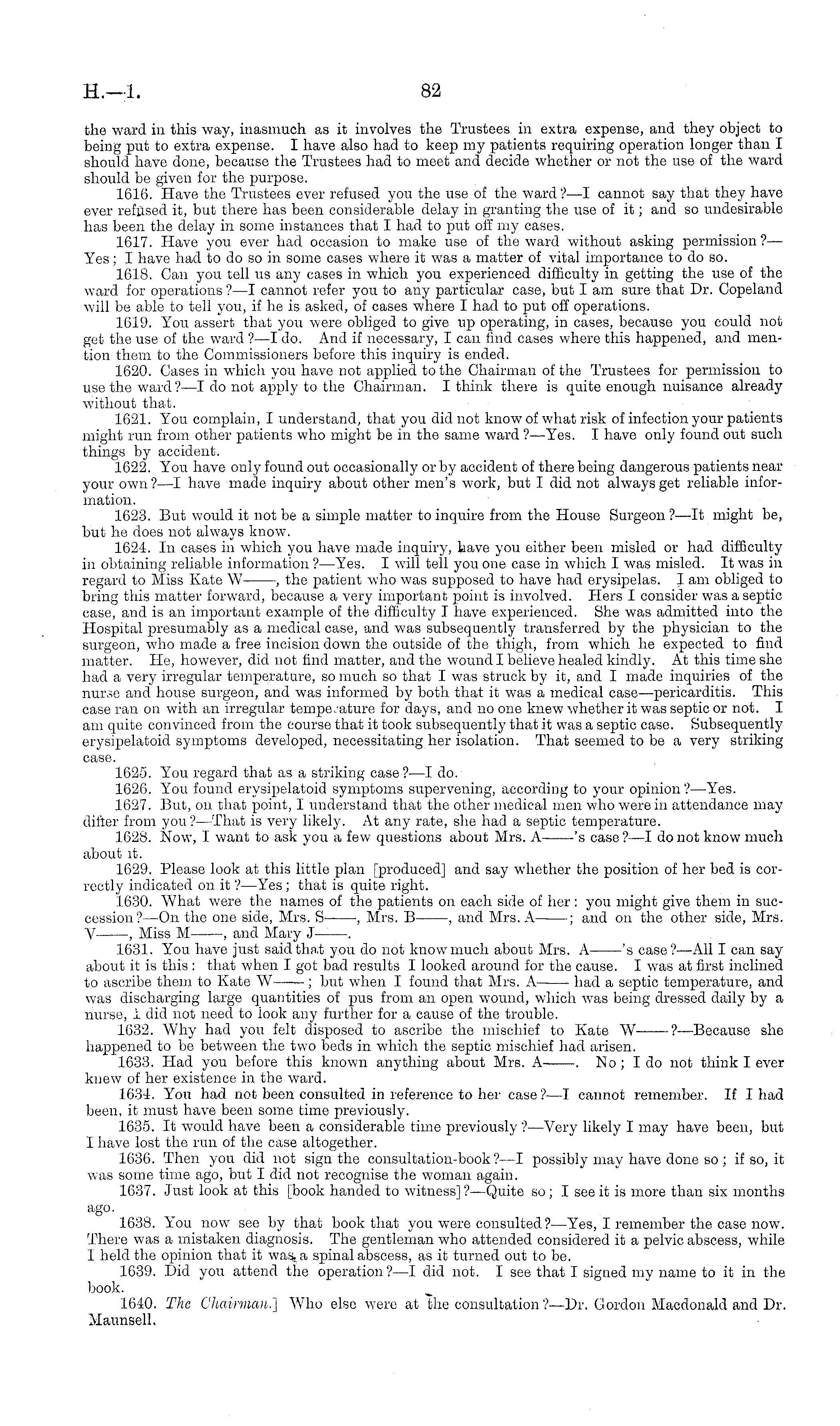 the ward in this way, inasmuch as it involves the Trustees in extra expense, and they object to being put to extra expense. I have also had to keep my patients requiring operation longer than I should have done, because the Trustees had to meet and decide whether or not the use of the ward should be given for the purpose. 1616. Have the Trustees ever refused you the use of the ward ? —I cannot say that they have ever refilsed it, but there has been considerable delay in granting the use of it; and so undesirable has been the delay in some instances that I had to put off my cases. 1617. Have you ever had occasion to make use of the ward without asking permission? — Yes; I have had to do so in some cases where it was a matter of vital importance to do so. 1618. Can you tell us any cases in which you experienced difficulty in getting the use of the ward for operations ?—I cannot refer you to any particular case, but lam sure that Dr. Copeland will be able to tell you, if he is asked, of cases where I had to put off operations. 1619. You assert that you were obliged to give up operating, in cases, because you could not get the use of the ward ? —I do. And if necessary, I can find cases where this happened, and mention them to the Commissioners before this inquiry is ended. 1620. Cases in which you have not applied to the Chairman of the Trustees for permission to use the ward? —I do not apply to the Chairman. I think there is quite enough nuisance already without that. 1621. You complain, I understand, that you did not know of what risk of infection your patients might run from other patients who might be in the same ward ? —Yes. I have only found out such things by accident. 1622. You have only found out occasionally or by accident of there being dangerous patients near your own? —I have made inquiry about other men's work, but I did not always get reliable information. 1623. But would it not be a simple matter to inquire from the House Surgeon ?—lt might be, but he does not always know. 1624. In cases in which you have made inquiry, have you either been misled or had difficulty in obtaining reliable information ? —Yes. I will tell you one case in which I was misled. It was in regard to Miss Kate W , the patient who was supposed to have had erysipelas. lam obliged to bring this matter forward, because a very important point is involved. Hers I consider was a septic case, and is an important example of the difficulty I have experienced. She was admitted into the Hospital presumably as a medical case, and was subsequently transferred by the physician to the surgeon, who made a free incision down the outside of the thigh, from which he expected to find matter. He, however, did not find matter, and the wound I believe healed kindly. At this time she had a very irregular temperature, so much so that I was struck by it, and I made inquiries of the nurse and house surgeon, and was informed by both that it was a medical case —pericarditis. This case ran on with an irregular temperature for days, and no one knew whether it was septic or not. I am quite convinced from the course that it took subsequently that it was a septic case. Subsequently erysipelatoid symptoms developed, necessitating her isolation. That seemed to be a very striking case. 1625. You regard that as a striking case? —I do. 1626. You found erysipelatoid symptoms supervening, according to your opinion ?—Yes. 1627. But, on that point, I understand that the other medical men who were in attendance may differ from you ?—That is very likely. At any rate, she had a septic temperature. 1628. Now, I want to ask you a few questions about Mrs. A 's case ?—I do not know much about it. 1629. Please look at this little plan [produced] and say whether the position of her bed is correctly indicated on it ?—Yes ; that is quite right. 1630. What were the names of the patients on each side of her : you might give them in succession? —On the one side, Mrs. S , Mrs. B , and Mrs. A ; and on the other side, Mrs. V , Miss M , and Mary J . 1631. You have just said that you do not know much about Mrs. A 's case?— All 1 can say about it is this : that when I got bad results I looked around for the cause. I was at first inclined to ascribe them to Kate W ; but when I found that Mrs. A had a septic temperature, and was discharging large quantities of pus from an open wound, which was being dressed daily by a nurse, i did not need to iook any further for a cause of the trouble. 1632. Why had you felt disposed to ascribe the mischief to Kate W— — ?—Because she happened to be between the two beds in which the septic mischief had arisen. 1633. Had you before this known anything about Mrs. A . No; Ido not think I ever knew of her existence in the ward. 1634. You had not been consulted in reference to her case? —I cannot remember. If I had been, it must have been some time previously. 1635. It would have been a considerable time previously ?—Very likely I may have been, but I have lost the run of the case altogether. 1636. Then you did not sign the consultation-book ?—I possibly may have done so ; if so, it was some time ago, but I did not recognise the woman again. 1637. Just look at this [book handed to witness]? —Quite so; I see it is more than six months ago. 1638. You now see by that book that you were consulted ? —Yes, I remember the case now. There was a mistaken diagnosis. The gentleman who attended considered it a pelvic abscess, while I held the opinion that it was. a spinal abscess, as it turned out to be. 1639. Did you attend the operation?—l did not. I see that I signed my name to it in the book. 1640. The Chairman.] Who else were at the consultation? — Dr. Gordon Macdouald and Dr. Maunsell.