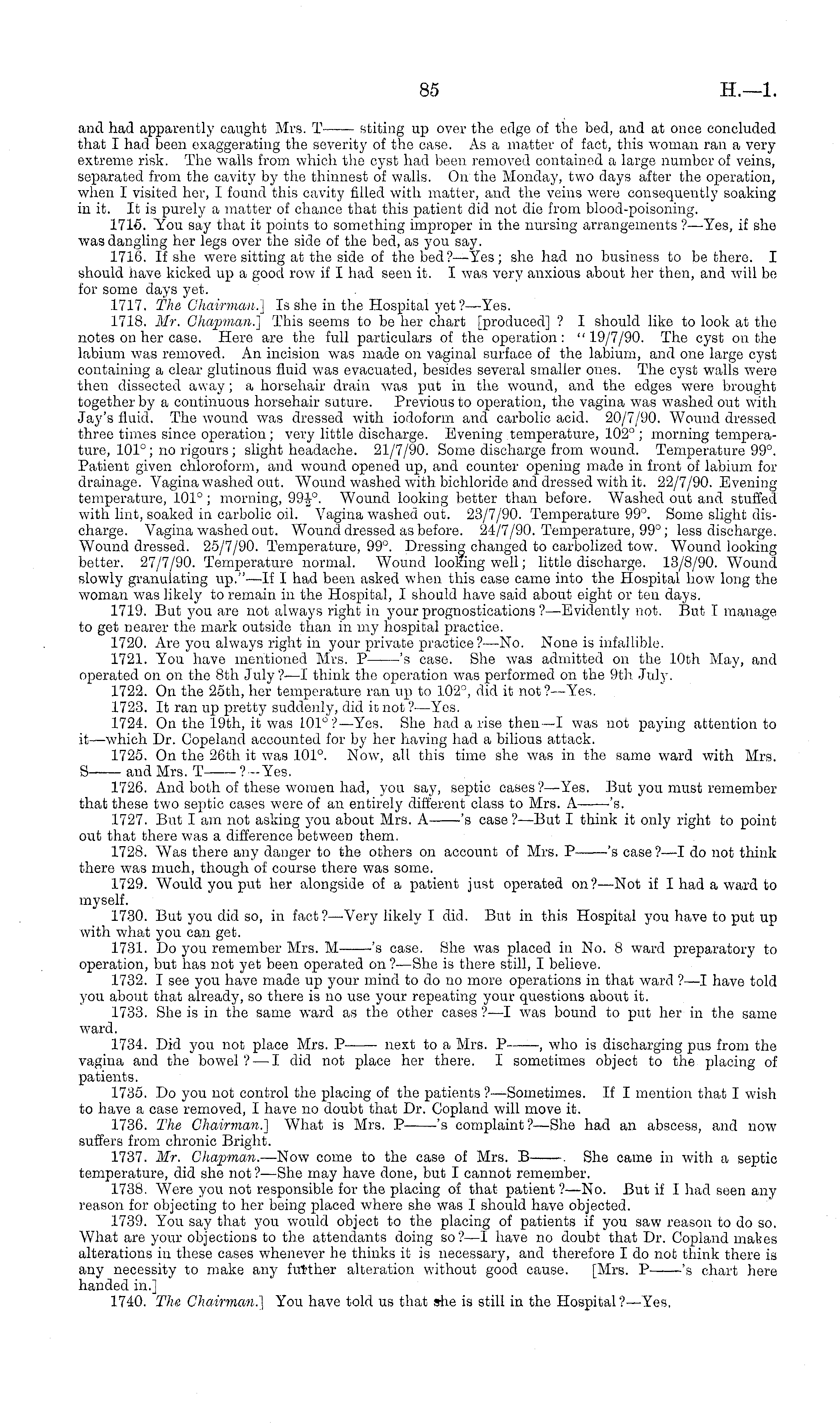 and had apparently caught Mrs. T stiting up over the edge of the bod, and at onco concluded that I had Been exaggerating the severity of the case. As a matter of fact, this woman ran a very extreme risk. The walls from which the cyst had been removed contained a large number of veins, separated from the cavity by the thinnest of walls. On the Monday, two days after the operation, when I visited her, I found this cavity filled with matter, and the veins were consequently soaking in it. It is purely a matter of chance that this patient did not die from blood-poisoning. 1715. You say that it points to something improper in the nursing arrangements ?—Yes, if she was dangling her legs over the side of the bed, as you say. 1716. If she were sitting at the side of the bed?— Yes; she had no business to be there. I should have kicked up a good row if I had seen it. I was very anxious about her then, and will be for some days yet. 1717. The Chairman.'] Is she in the Hospital yet?— Yes. 1718. Mr. Ghajjman.] This seems to be her chart [produced] ? I should like to look at the notes on her case. Here are the full particulars of the operation: "19/7/90. The cyst on the labium was removed. An incision was made on vaginal surface of the labium, and one large cyst containing a clear glutinous fluid was evacuated, besides several smaller ones. The cyst walls were then dissected away; a horsehair drain was put in the wound, and the edges were brought together by a continuous horsehair suture. Previous to operation, the vagina was washed out with Jay's fluid. The wound was dressed with iodoform and carbolic acid. 20/7/90. Wound dressed three times since operation ; very little discharge. Evening temperature, 102° ; morning temperature, 101°; no rigours; slight headache. 21/7/90. Some discharge from wound. Temperature 99°. Patient given chloroform, and wound opened up, and counter opening made in front of labium for drainage. Vagina washed out. "Wound washed with bichloride and dressed with it. 22/7/90. Evening temperature, 101°; morning, 99-J 0. Wound looking better than before. Washed out and stuffed with lint, soaked in carbolic oil. Vagina washed out. 23/7/90. Temperature 99°. Some slight discharge. Vagina washed out. Wound dressed as before. 24/7/90. Temperature, 99°; less discharge. Wound dressed. 25/7/90. Temperature, 99°. Dressing changed to carbolized tow. Wound looking better. 27/7/90. Temperature normal. Wound looking well; little discharge. 13/8/90. Wound slowly granulating up."—lf I had been asked when this case came into the Hospital how long the woman was likely to remain in the Hospital, I should have said about eight or ten days. 1719. But you are not always right in your prognostications ?—Evidently not. But I manage to get nearer the mark outside than in my hospital practice. 1720. Are you always right in your private practice?— No. None is infallible. 1721. You have mentioned Mrs. Ps case. She was admitted on the 10th May, and operated on on the Bth July? —I think the operation was performed on the 9th July. 1722. On the 25th, her temperature ran up to 102°, did it not?— Yes. 1723. It ran up pretty suddenly, did ie not ?—Yes. 1724. On the 19th, it was 101°? —Yes. She had a rise then —I was not paying attention to it —which Dr. Copeland accounted for by her having had a bilious attack. 1725. On the 26th it was 101°. Now, all this time she was in the same ward with Mrs. S and Mrs. T ? - Yes. 1726. And both of these women had, you say, septic cases?— Yes. But you must remember that these two septic cases were of an entirely different class to Mrs. A 's. 1727. But I am not asking you about Mrs. A——'s case? —But I think it only right to point out that there was a difference between them. 1728. Was there any danger to the others on account of Mrs. Ps case?—l do not think there was much, though of course there was some. 1729. Would you put her alongside of a patient just operated on?— Not if I had a ward to myself. 1730. But you did so, in fact?—-Very likely I did. But in this Hospital you have to put up with what you can get. 1731. Do you remember Mrs. M 's case. She was placed in No. 8 ward preparatory to operation, but has not yet been operated on ?—She is there still, I believe. 1732. I see you have made up your mind to do no more operations in that ward ?—I have told you about that already, so there is no use your repeating your questions about it. 1733. She is in the same ward as the other cases ? —I was bound to put her in the same ward. 1734. Did you not place Mrs. P next to a Mrs. P , who is discharging pus from the vagina and the bowel? — I did not place her there. I sometimes object to the placing of patients. 1735. Do you not control the placing of the patients ?—Sometimes. If I mention that I wish to have a case removed, I have no doubt that Dr. Copland will move it. 1736. The Chairman'] What is Mrs. Ps complaint?— She had an abscess, and now suffers from chronic Bright. 1737. Mr. Chapman. —Now come to the case of Mrs. B . She came in with a septic temperature, did she not ?—She may have done, but I cannot remember. 1738. Were you not responsible for the placing of that patient ?—No. But if I had seen any reason for objecting to her being placed where she was I should have objected. 1739. You say that you would object to the placing of patients if you saw reason to do so. What are your objections to the attendants doing so ? —I have no doubt that Dr. Copland makes alterations in these cases whenever he thinks it is necessary, and therefore I do not think there is any necessity to make any further alteration without good cause. [Mrs. P——'s chart here handed in.] 1740. The Chairman.} You have told us that she is still in the Hospital ?—Yes,