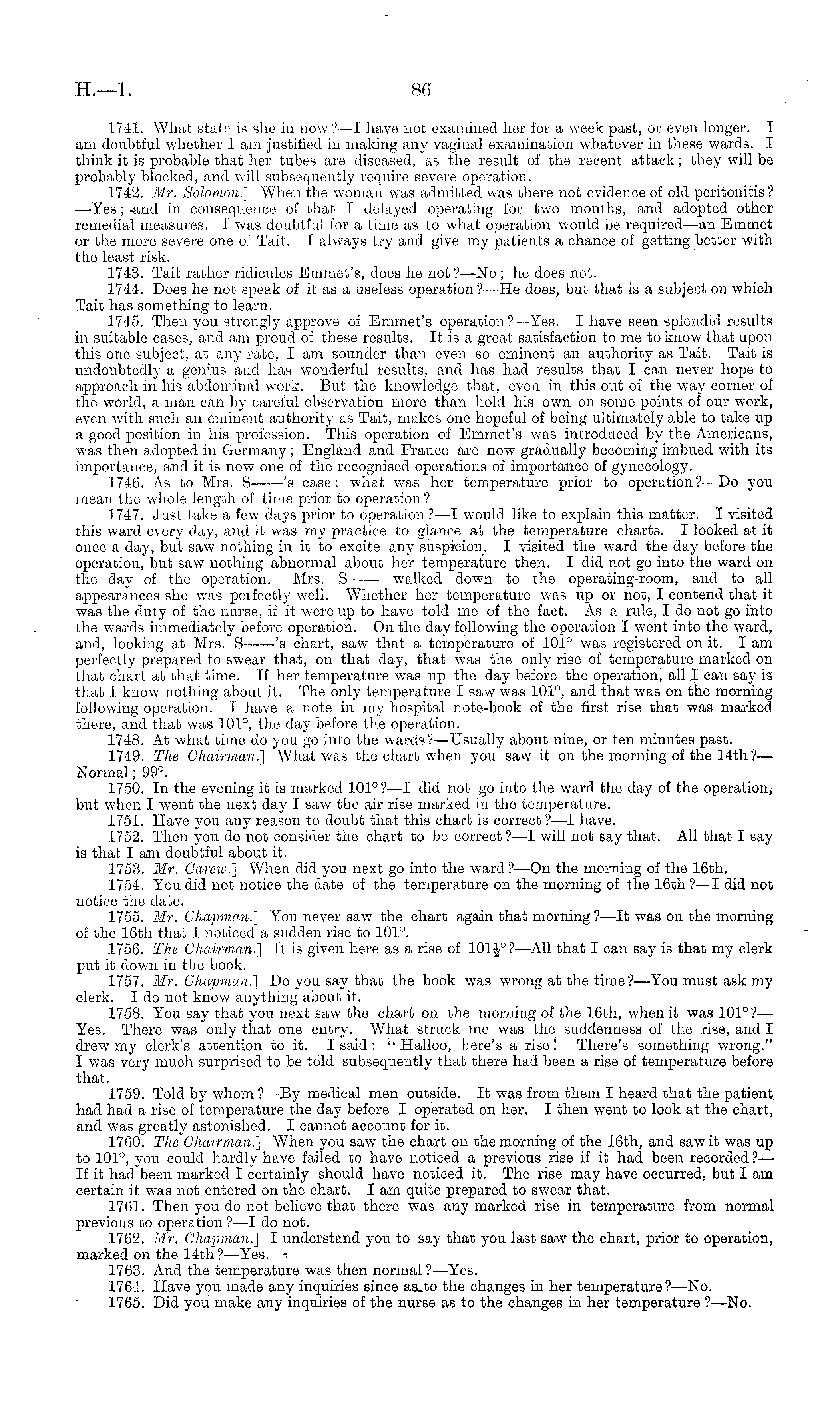 1741. What state is she in now?—l have not examined her for a week past, or even longer. I am doubtful whether 1 am justified in making any vaginal examination whatever in these wards. I think it is probable that her tubes are diseased, as the result of the recent attack; they will be probably blocked, and will subsequently require severe operation. 1742. Mr. Solomon.] When the woman was admitted was there not evidence of old peritonitis? —Yes; -and in consequence of that I delayed operating for two months, and adopted other remedial measures. I was doubtful for a time as to what operation would be required—an Emmet or the more severe one of Tait. I always try and give my patients a chance of getting better with the least risk. 1743. Tait rather ridicules Emmet's, does he not ?—No ; he does not. 1744. Does he not speak of it as a useless operation?—He does, but that is a subject on which Tait has something to learn. 1745. Then you strongly approve of Emmet's operation?— Yes. I have seen splendid results in suitable cases, and am proud of these results. It is a great satisfaction to me to know that upon this one subject, at any rate, I am sounder than even so eminent an authority as Tait. Tait is undoubtedly a genius and has wonderful results, and lias had results that I can never hope to approach in his abdominal work. But the knowledge that, even in this out of the way corner of the world, a man can by careful observation more than hold his own on some points of our work, even w rith such an eminent authority as Tait, makes one hopeful of being ultimately able to take up a good position in his profession. This operation of Emmet's was introduced by the Americans, was then adopted in Germany; England and France are now gradually becoming imbued with its importance, and it is now one of the recognised operations of importance of gynecology. 1746. As to Mrs. S 's case: what was her temperature prior to operation?—Do you mean the whole length of time prior to operation ? 1747. Just take a few days prior to operation ? —I would like to explain this matter. I visited this ward every day, and it was my practice to glance at the temperature charts. I looked at it once a day, but saw nothing in it to excite any suspicion. I visited the ward the day before the operation, but saw nothing abnormal about her temperature then. I did not go into the ward on the day of the operation. Mrs. S— walked down to the operating-room, and to all appearances she was perfectly well. Whether her temperature was up or not, I contend that it was the duty of the nurse, if it were up to have told me of the fact. As a rule, Ido not go into the wards immediately before operation. On the day following the operation I went into the ward, and, looking at Mrs. S—— s chart, saw that a temperature of 101° was registered on it. lam perfectly prepared to swear that, on that day, that was the only rise of temperature marked on that chart at that time. If her temperature was up the day before the operation, all I can say is that I know nothing about it. The only temperature I saw was 101°, and that was on the morning following operation. I have a note in my hospital note-book of the first rise that was marked there, and that was 101°, the day before the operation. 1748. At what time do you go into the wards? —Usually about nine, or ten minutes past. 1749. The Chairman.'] What was the chart when yoii saw it on the morning of the 14th?— Normal; 99°. 1750. In the evening it is marked 101° ? —I did not go into the ward the day of the operation, but when I went the next day I saw the air rise marked in the temperature. 1751. Have you any reason to doubt that this chart is correct ? —I have. 1752. Then you do not consider the chart to be correct? —I will not say that. All that I say is that I am doubtful about it. 1753. Mr. Careio.] When did you next go into the ward?—On the morning of the 16th. 1754. You did not notice the date of the temperature on the morning of the 16th?—I did not notice the date. 1755. Mr. Chapman.] You never saw the chart again that morning ?—lt was on the morning of the 16th that I noticed a sudden rise to 101°. 1756. The Chairman.] It is given here as a rise of 101-J 0?—All that I can say is that my clerk put it down in the book. 1757. Mr. Chapman.] Do you say that the book was wrong at the time?— You must ask my clerk. Ido not know anything about it. 1758. You say that you next saw the chart on the morning of the 16th, when it was 101°?— Yes. There was only that one entry. What struck me was the suddenness of the rise, and I drew my clerk's attention to it. I said : " Halloo, here's a rise ! There's something wrong." I was very much surprised to be told subsequently that there had been a rise of temperature before that. 1759. Told by whom? —By medical men outside. It was from them I heard that the patient had had a rise of temperature the day before I operated on her. I then went to look at the chart, and was greatly astonished. I cannot account for it. 1760. The Chairman.] When you saw the chart on the morning of the 16th, and saw it was up to 101°, you could hardly have failed to have noticed a previous rise if it had been recorded ?— If it had been marked I certainly should have noticed it. The rise may have occurred, but lam certain it was not entered on the chart. lam quite prepared to swear that. 1761. Then you do not believe that there was any marked rise in temperature from normal previous to operation?—l do not. 1762. Mr. Chapman."] I understand you to say that you last saw the chart, prior to operation, marked on the 14th? —Yes. i 1763. And the temperature was then normal ?—Yes. 1764. Have you made any inquiries since as»to the changes in her temperature?— No. 1765. Did you make any inquiries of the nurse as to the changes in her temperature ?—No.