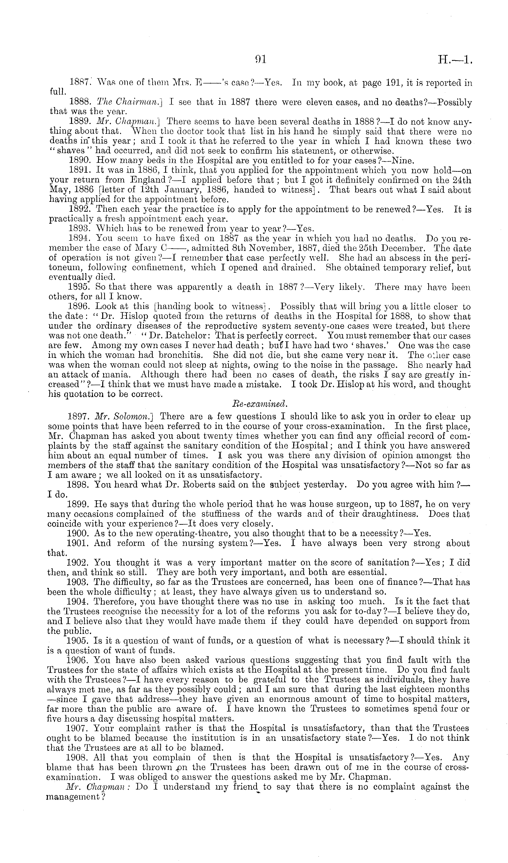 1887. Was one of them Mrs. E 's case? — Yes. In my book, at page 191, it is reported in full. 1888. The Chairman.] I see that in 1887 there were eleven cases, and no deaths'?— Possibly that was the year. 1889. Mr. Chapman.] There seems to have been several deaths in 1888 ?—I do not know anything about that. When the doctor took that list in his hand he simply said that there were no deaths in" this year ; and I took it that he referred to the year in which I had known these two " shaves " had occurred, and did not seek to confirm his statement, or otherwise. 1890. How many beds in the Hospital are you entitled to for your cases ? —Nine. 1891. It was in 1886, I think, that you applied for the appointment which you now hold—on your return from England ?—I applied before that; but I gob it definitely confirmed on the 24th May, 1886 [letter of 12th January, 1886, handed to witness]. That bears out what I said about having applied for the appointment before. 1892. Then each year the practice is to apply for the appointment to be renewed?— Yes. It is practically a fresh appointment each year. 1893. Which has to be renewed from year to year? —Yes. 1894. You seem to have fixed on 1887 as the year in which you had no deaths. Do you remember the case of Mary 0 , admitted Bth November, 1887, died the 25th December. The date of operation is not given ?—I remember that case perfectly well. She had an abscess in the peritoneum, following confinement, which I opened and drained. She obtained temporary relief, but eventually died. 1895. So that there was apparently a death in 1887 ?—Very likely. There may have been others, for all I know. 1896. Look at this [handing book to witness] . Possibly that will bring you a little close,]1 to the date : "Dr. Hislop quoted from the returns of deaths in the Hospital for 1888, to show that under the ordinary diseases of the reproductive system seventy-one cases were treated, but there was not one death." " Dr. Batchelor: That is perfectly correct. You must remember that our cases are few. Among my own cases I never had death ; but'l have had two ' shaves.' One was the case in which the woman had bronchitis. She did not die, but she came very near it. The oilier case was when the woman could not sleep at nights, owing to the noise in the passage. She nearly had an attack of mania. Although there had been no cases of death, the risks I say are greatly increased" ? —I think that we must have made a mistake. I took Dr. Hislop at his word, and thought his quotation to be correct. Re-examined. 1897. Mr. Solomon.] There are a few questions I should like to ask you in order to clear up some points that have been referred to in the course of your cross-examination. In the first place, Mr. Chapman has asked you about twenty times whether you can find any official record of complaints by the staff against the sanitary condition of the Hospital; and I think you have answered him about an equal number of times. I ask you was there any division of opinion amongst the members of the staff that the sanitary condition of the Hospital was unsatisfactory ?—Not so far as I am aware ; we all looked on it as unsatisfactory. 1898. You heard what Dr. Eoberts said on the subject yesterday. Do you agree with him ?— I do. 1899. He says that during the whole period that he was house surgeon, up to 1887, he on very many occasions complained of the stuffiness of the wards and of their draughtiness. Does that coincide with your experience?—lt does very closely. 1900. As to the new operating-theatre, you also thought that to be a necessity?— Yes. 1901. And reform of the nursing system? —Yes. I have always been very strong about that. 1902. You thought it was a very important matter on the score of sanitation?— Yes; I did then, and think so still. They are both very important, and both are essential. 1903. The difficulty, so far as the Trustees are concerned, has been one of finance?— That has been the whole difficulty; at least, they have always given us to understand so. 1904. Therefore, you have thought there was no use in asking too much. Is it the fact that the Trustees recognise the necessity for a lot of the reforms you ask for to-day ?—I believe they do, and I believe also that they would have made them if they could have depended on support from the public. 1905. Is it a question of want of funds, or a question of what is necessary?—l should think it is a question of want of funds. 1906. You have also been asked various questions suggesting that you find fault with the Trustees for the state of affairs which exists at the Hospital at the present time. Do you find fault with the Trustees ? —I have every reason to be grateful to the Trustees as individuals, they have always met me, as far as they possibly could ; and I am sure that during the last eighteen months —since I gave that address—they have given an enormous amount of time to hospital matters, far more than the public are aware of. I have known the Trustees to sometimes spend four or five hours a day discussing hospital matters. 1907. Your complaint rather is that the Hospital is unsatisfactory, than that the Trustees ought to be blamed because the institution is in an unsatisfactory state? —Yes. 1 do not think that the Trustees are at all to be blamed. 1908. All that you complain of then is that the Hospital is unsatisfactory?— Yes. Any blame that has been thrown x>n the Trustees has been drawn out of me in the course of crossexamination. I was obliged to answer the questions asked me by Mr. Chapman. Mr. Chapman : Do I understand my friend to say that there is no complaint against the management ?