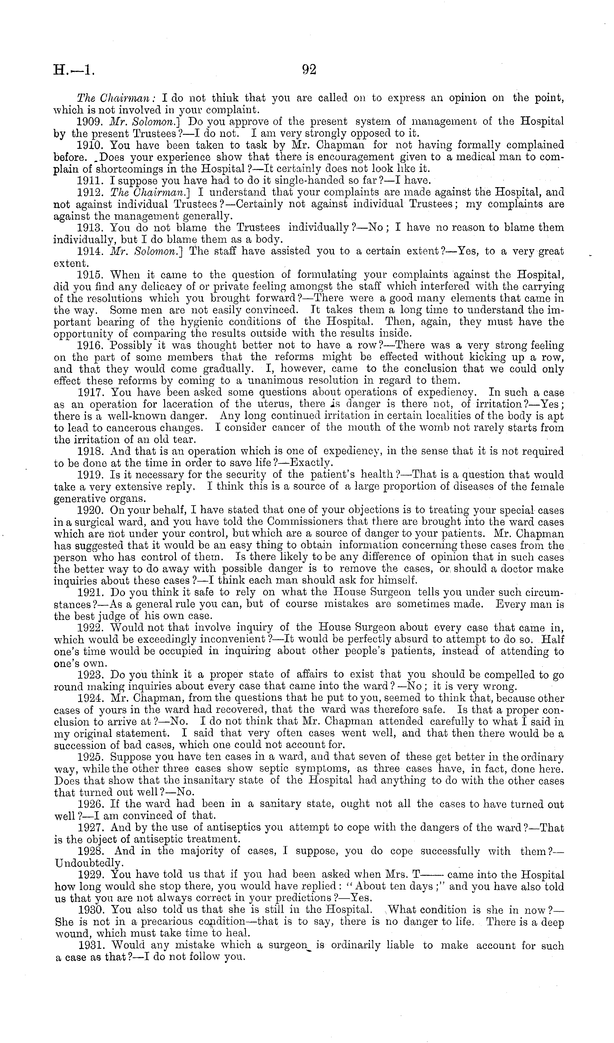 The Chairman: I do not think that you are called on to express an opinion on the point, which is not involved in your complaint. 1909. Mr. Solomon.] Do you approve of the present system of management of the Hospital by the present Trustees ? —I do not. lam very strongly opposed to it. 1910. You have been taken to task by Mr. Chapman for not having formally complained before. .Does your experience show that there is encouragement given to a medical man to complain of shortcomings in the Hospital ? —lt certainly does not look like it. 1911. I suppose you have had to do it single-handed so far? —I have. 1912. The Chairman.'] I understand that your complaints are made against the Hospital, and not against individual Trustees ? —Certainly not against individual Trustees; my complaints are against the management generally. 1913. You do not blame the Trustees individually ?—No ; I have no reason to blame them individually, but I do blame them as a body. 1914. Mr. Solomon.] The staff have assisted you to a certain extent?— Yes, to a very great extent. 1915. When it came to the question of formulating your complaints against the Hospital, did you find any delicacy of or private feeling amongst the staff which interfered with the carrying of the resolutions which you brought forward?— There were a good many elements that came in the way. Some men are not easily convinced. Tt takes them a long time to understand the important bearing of the hygienic conditions of the Hospital. Then, again, they must have the opportunity of comparing the results mitside with the results inside. 1916. Possibly it was thought better not to have a row ?—There was a very strong feeling on the part of some members that the reforms might be effected without kicking up a row, and that they would come gradually. I, however, came to the conclusion that we could only effect these reforms by coming to a unanimous resolution in regard to them. 1917. You have been asked some questions about operations of expediency. In such a case as an operation for laceration of the uterus, there is danger is there not, of irritation?— Yes; there is a well-known danger. Any long continued irritation in certain localities of the body is apt to lead to cancerous changes. 1 consider cancer of the mouth of the womb not rarely starts from the irritation of an old tear. 1918. x\nd that is an operation which is one of expediency, in the sense that it is not required to be done at the time in order to save life ?—Exactly. 1919. Is it necessary for the security of the patient's health ? —That is a question that would take a very extensive reply. I think this is a source of a large proportion of diseases of the female generative organs. 1920. On your behalf, I have stated that one of your objections is to treating your special cases in a surgical ward, and you have told the Commissioners that there are brought into the ward cases which are not under your control, but which are a source of danger to your patients. Mr. Chapman has suggested that it would be an easy thing to obtain information concerning these cases from the person who has control of them. Is there likely to be any difference of opinion that in such cases the better way to do away with possible danger is to remove the cases, or should a doctor make inquiries about these cases ?—I think each man should ask for himself. 1921. Do you think it safe to rely on what the House Surgeon tells you under such circumstances? —As a general rule you can, but of course mistakes are sometimes made. Every man is the best judge of his own case. 1922. Would not that involve inquiry of the House Surgeon about every case that came in, which would be exceedingly inconvenient ?—lt would be perfectly absurd to attempt to do so. Half one's time would be occupied in inquiring about other people's patients, instead of attending to one's own. 1923. Do you think it a proper state of affairs to exist that you should be compelled to go round making inquiries about every case that came into the ward ? -—No; it is very wrong. 1924. Mr. Chapman, from the questions that he put to you, seemed to think that, because other cases of yours in the ward had recovered, that the ward was therefore safe. Is that a proper conclusion to arrive at ?—No. I do not think that Mr. Chapman attended carefully to what I said in my original statement. I said that very often cases went well, and that then there would be a succession of bad cases, which one could not account for. 1925. Suppose you have ten cases in a ward, and that seven of these get better in the ordinary way, while the other three cases show septic symptoms, as three cases have, in fact, done here. Does that show that the insanitary state of the Hospital had anything to do with the other cases that turned out well ?—No. 1926. If the ward had been in a sanitary state, ought not all the cases to have turned out well ? —I am convinced of that. 1927. And by the use of antiseptics you attempt to cope with the clangers of the ward ?—That is the object of antiseptic treatment. 1928. And in the majority of cases, I suppose, you do cope successfully with them?— Undoubtedly. 1929. You have told us that if you had been asked when Mrs. T came into the Hospital how long would she stop there, you would have replied : " About ten days ;" and you have also told us that you are not always correct in your predictions ? —Yes. 1930. You also told us that she is still in the Hospital. What condition is she in now ?— She is not in a precarious condition—that is to say, there is no danger to life. There is a deep wound, which must take time to heal. 1931. Would any mistake which a surgeon is ordinarily liable to make account for such a case as that ?—I do not follow you.