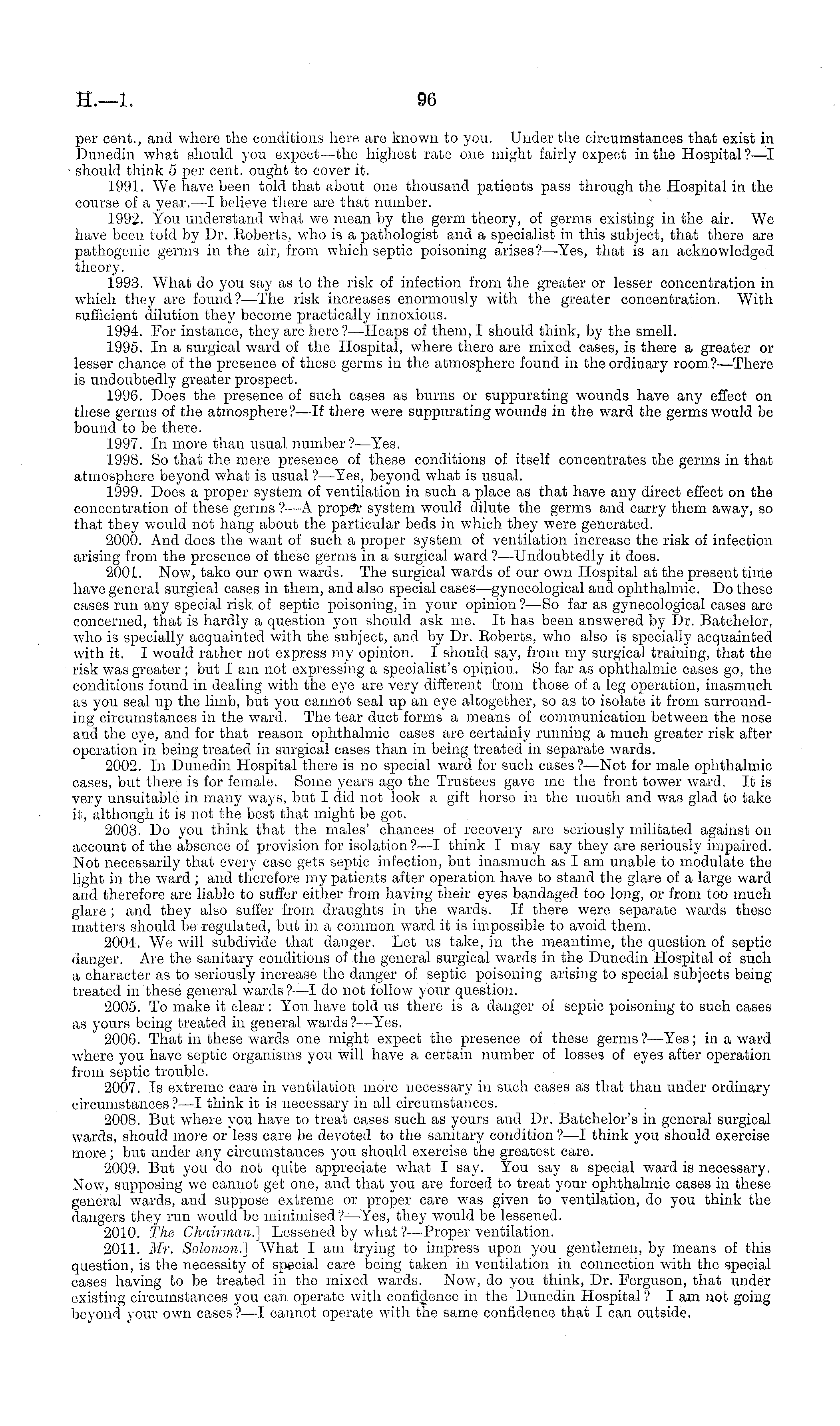 per cent., and where the conditions here, are known to you. Under the circumstances that exist in Dunedin what should you expect —the highest rate one might fairly expect in the Hospital ?—I • should think 5 per cent, ought to cover it. 1991. We have been told that about one thousand patients pass through the Hospital in the course of a year.—l believe there are that number. 1992. You understand what we mean by the germ theory, of germs existing in the air. We have been told by Dr. Roberts, who is a pathologist and a specialist in this subject, that there are pathogenic germs in the air, from which septic poisoning arises?—-Yes, that is an acknowledged theory. 1993. What do you say as to the risk of infection from the greater or lesser concentration in which they are found?— The risk increases enormously with the greater concentration. With sufficient dilution they become practically innoxious. 1994. For instance, they are here ?—Heaps of them, I should think, by the smell. 1995. In a surgical ward of the Hospital, where there are mixed cases, is there a greater or lesser chance of the presence of these germs in the atmosphere found in the ordinary room?— There is undoubtedly greater prospect. 1996. Does the presence of such cases as burns or suppurating wounds have any effect on these germs of the atmosphere?—lf there were suppurating wounds in the ward the germs would be bound to be there. 1997. In more than usual number?— Yes. 1998. So that the mere presence of these conditions of itself concentrates the germs in that atmosphere beyond what is usual ?—Yes, beyond what is usual. 1999. Does a proper system of ventilation in such a place as that have any direct effect on the concentration of these germs ?—A prope*r system would dilute the germs and carry them away, so that they would not hang about the particular beds in which they were generated. 2000. And does the want of such a proper system of ventilation increase the risk of infection arising from the presence of these germs in a surgical ward ? —Undoubtedly it does. 2001. Now, take our own wards. The surgical wards of our own Hospital at the present time have general surgical cases in them, and also special cases—gynecological and ophthalmic. Do these cases run any special risk of septic poisoning, in your opinion ?—So far as gynecological cases are concerned, that is hardly a question you should ask me. It has been answered by Dr. Batchelor, who is specially acquainted with the subject, and by Dr. Roberts, who also is specially acquainted with it. I would rather not express my opinion. I should say, from my surgical training, that the risk was greater ; but lam not expressing a specialist's opinion. So far as ophthalmic cases go, the conditions found in dealing with the eye are very different from those of a leg operation, inasmuch as you seal up the limb, but you cannot seal up an eye altogether, so as to isolate it from surrounding circumstances in the ward. The tear duct forms a means of communication between the nose and the eye, and for that reason ophthalmic cases are certainly running a much greater risk after operation in being treated in surgical cases than in being treated in separate wards. 2002. In Dunedin Hospital there is no special ward for such cases?— Not for male ophthalmic cases, but there is for female. Some years ago the Trustees gave me the front tower ward. It is very unsuitable in many ways, but I did not look a gift horse in the mouth and was glad to take it, although it is not the best that might be got. 2003. Do you think that the males' chances of recovery are seriously militated against on account of the absence of provision for isolation ?—I think I may say they are seriously impaired. Not necessarily that every case gets septic infection, but inasmuch as I am unable to modulate the light in the ward ; and therefore my patients after operation have to stand the glare of a large ward and therefore are liable to suffer either from having their eyes bandaged too long, or from too much glare ; and they also suffer from draughts in the wards. If there were separate wards these matters should be regulated, but in a common ward it is impossible to avoid them. 2004. We will subdivide that danger. Let us take, in the meantime, the question of septic danger. Are the sanitary conditions of the general surgical wards in the Duuedin Hospital of such a character as to seriously increase the danger of septic poisoning arising to special subjects being treated in these general wards?—l do not follow your question. 2005. To make it clear: You have told us there is a danger of septic poisoning to such cases as yours being treated in general wards?— Yes. 2006. That in these wards one might expect the presence of these germs?— Yes; in a ward where you have septic organisms you will have a certain number of losses of eyes after operation from septic trouble. 2007. Is extreme care in ventilation more necessary in such cases as that than under ordinary circumstances ? —I think it is necessary in all circumstances. 2008. But where you have to treat cases such as yours and Dr. Batchelor's in general surgical wards, should more or less care be devoted to the sanitary condition ?—I think you should exercise more; but under any circumstances you should exercise the greatest care. 2009. But you do not quite appreciate what I say. You say a special ward is necessary. Now, supposing we cannot get one, and that you are forced to treat your ophthalmic cases in these general wards, and suppose extreme or proper care was given to ventilation, do you think the dangers they run would be minimised?— Yes, they would be lesseued. 2010. The Chairman.] Lessened by what ? —Proper ventilation. 2011. Mr. Solomon.} What I am trying to impress upon you gentlemen, by means of this question, is the necessity of special care being taken in ventilation in connection with the special cases having to be tr