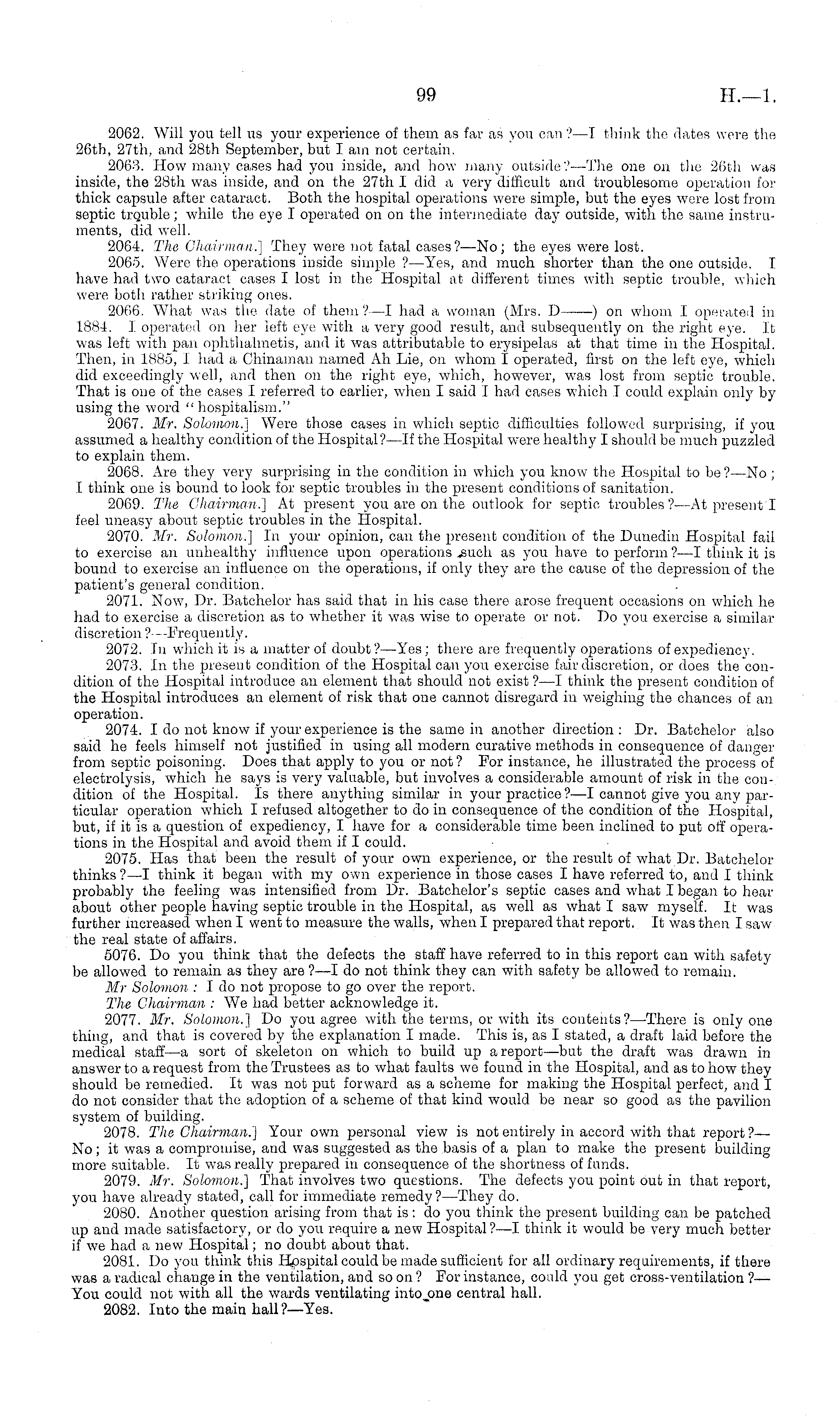2062. Will you tell us your experience of them as far as yon can.—l think the dates were the 26th, 27th, and 28th September, but I am not certain. 2068. How many cases had you inside, and how many outside.—Die one on the 26th was inside, the 28th was inside, and on the 27th I did a very difficult and troublesome operation for thick capsule after cataract. Both the hospital operations were simple, but the eyes were lost from septic trouble; while the eye I operated on on the intermediate day outside, with the same instruments, did well. 2064. The Chairman.} They were not fatal cases?—No; the eyes were lost. 2065. Were the operations inside simple ? —Yes, and much shorter than the one outside. T have had two cataract cases I lost in the Hospital at different times with septic trouble, which were both rather strikiug ones. 2066. What was the date of them?—l had a woman (Mrs. D )on whom I operated in 1884. I operated on her left eye with a very good result, and subsequently on the right eye. It was left with pan ophbhalmetis, and it was attributable to erysipelas at that time in the Hospital. Then, in 1885, 1 had a Chinaman named Ah Lie, on whom I operated, first on the left eye, which did exceedingly well, and then on the right eye, which, however, was lost from septic trouble. That is one of the cases I referred to earlier, when I said I had cases which I could explain only by using the word " hospitalism." 2067. Mr. Solomon.] Were those cases in which septic difficulties followed surprising, if you assumed a healthy condition of the Hospital?—lf the Hospital were healthy I should be much puzzled to explain them. 2068. Are they very surprising in the condition in which you know the Hospital to be? —No ; I think one is bound to look for septic troubles in the present conditions of sanitation. 2069. The Chairman.] At present you are on the outlook for septic troubles?—At present I feel uneasy about septic troubles in the Hospital. 2070. Mr. Solomon.] In your opinion, can the present condition of the Dunedin Hospital fail to exercise an unhealthy influence upon operations ..such as you have to perform ?—I think it is bound to exercise an influence on the operations, if only they are. the cause of the depression of the patient's general condition. 2071. Now, Dr. Batchelor has said that in his case there arose frequent occasions on which he had to exercise a discretion as to whether it was wise to operate or not. Do you exercise a similar discretion ?- - -Frequently. 2072. Jn which it is a matter of doubt?— Yes; there are frequently operations of expediency. 2073. In the present condition of the Hospital can you exercise fail1 discretion, or does the condition of the Hospital introduce an element that should not exist ?—I think the present condition of the Hospital introduces an element of risk that one cannot disregard in weighing the chances of an operation. 2074. I do not know if your experience is the same in another direction: Dr. Batchelor also said he feels himself not justified in using all modern curative methods in consequence of danger from septic poisoning. Does that apply to you or not ? For instance, he illustrated the process of electrolysis, which he says is very valuable, but involves a considerable amount of risk in the condition of the Hospital. Is there anything similar in your practice ?—I cannot give you any particular operation which I refused altogether to do in consequence of the condition of the Hospital, but, if it is a question of expediency, I have for a considerable time been inclined to put off operations in the Hospital and avoid them if I could. 2075. Has that been the result of your own experience, or the result of what Dr. Batchelor thinks ?—I think it began with my own experience in those cases I have referred to, and I think probably the feeling was intensified from Dr. Batchelor's septic cases and what I began to hear about other people having septic trouble in the Hospital, as well as what I saw myself. It was further increased when I went to measure the walls, when I prepared that report. It was then I saw the real state of affairs. 5076. Do you think that the defects the staff have referred to in this report can with safety be allowed to remain as they are ?—-I do not think they can with safety be allowed to remain. Mr Solomon : I do not propose to go over the report. The Chairman : We had better acknowledge it. 2077. Mr. Solomon.] Do you agree with the terms, or with its contents? —There is only one thing, and that is covered by the explanation I made. This is, as I stated, a draft laid before the medical staff —a sort of skeleton on which to build up a report—but the draft was drawn in answer to a request from the Trustees as to what faults we found in the Hospital, and as to how they should be remedied. It was not put forward as a scheme for making the Hospital perfect, and I do not consider that the adoption of a scheme of that kind would be near so good as the pavilion system of building. 2078. The Chairman.] Your own personal view is not entirely in accord with that report ?— No; it was a compromise, and was suggested as the basis of a plan to make the present building more suitable. It was really prepared in consequence of the shortness of funds. 2079. Mr. Solomon.] That involves two questions. The defects you point out in that report, you have already stated, call for immediate remedy?— They do. 2080. Another question arising from that is: do you think the present building can be patched up and made satisfactory, or do you require a new Hospital ? —I think it would be very much better if we had a new Hospital; no doubt about that. 2081. Do you think this Hospital could be made sufficient for all ordinary requirements, if there was a radical change in the ventilation, and so on ? For instance, coald you get cross-ventilation ?— You could not with all the wards ventilating into jane central hall. 2082. Into