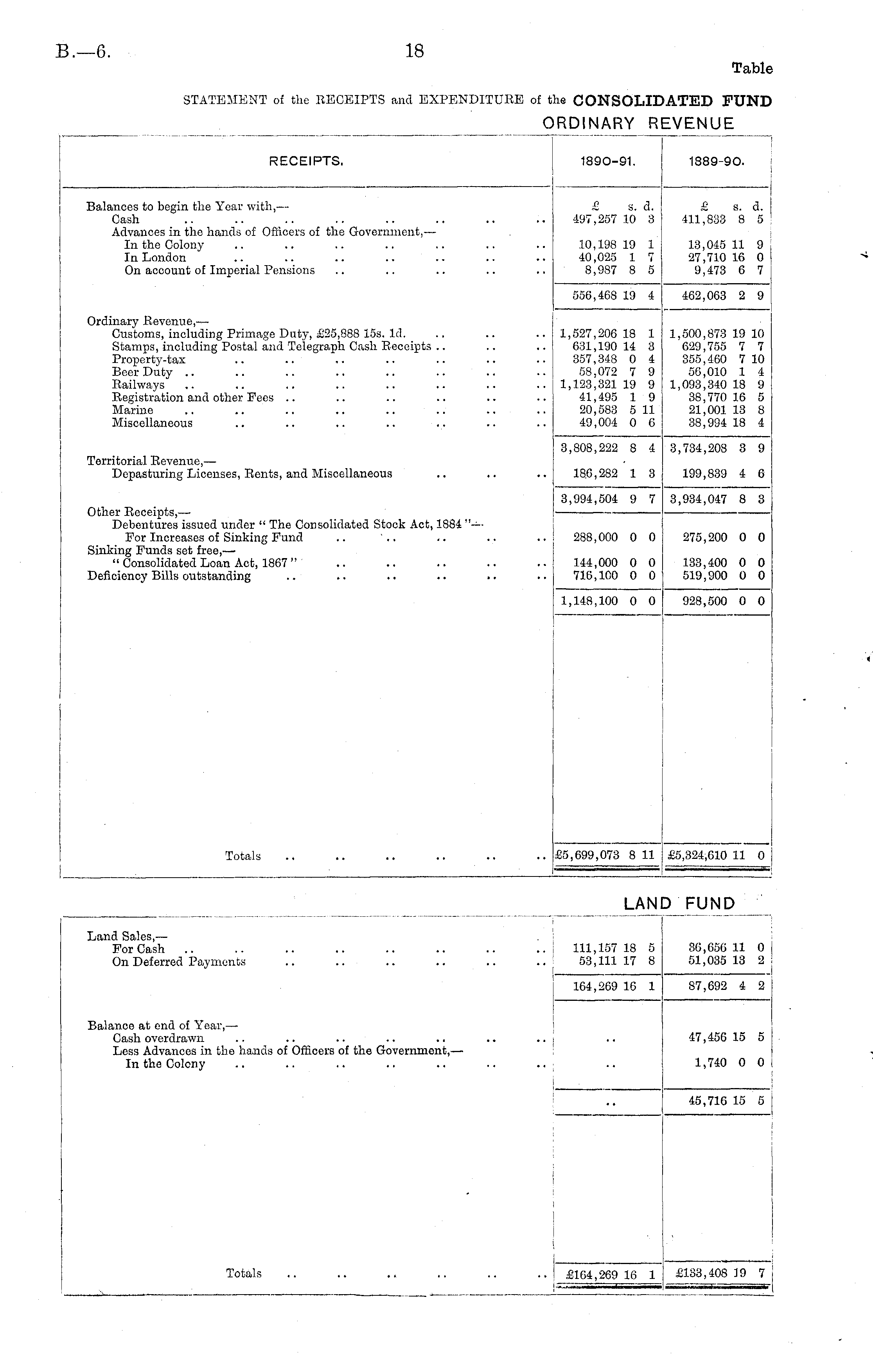 RECEIPTS. 189O-91. 1889-90. Balances to begin the Year with, — Cash Advances in the hands of Officers of the Government, — In the Colony In London On account of Imperial Pensions £ s. d. 497,257 10 3 10,198 19 1 40,025 1 7 8,987 8 5 £ s. d. 411,833 8 5 13,045 11 9 27,710 16 0 9,473 6 7 556,468 19 4 462,063 2 9 Ordinary Revenue, — Customs, including Primage Duty, £25,888 15s. Id. Stamps, including Postal and Telegraph Cash Receipts Property-tax Beer Duty Railways Registration and other Fees Marine Miscellaneous 1,527,206 18 1 631,190 14 3 357,348 0 4 58,072 7 9 1,123,321 19 9 41,495 1 9 20,583 5 11 49,004 0 6 1,500,873 19 10 629,755 7 7 355,460 7 10 56,010 1 4 1,093,340 18 9 38,770 16 5 21,001 13 8 38,994 18 i Territorial Revenue, — Depasturing Licenses, Rents, and Miscellaneous 3,808,222 8 4 186,282 1 3 3,734,208 3 9 199,839 4 6 Other Receipts,— Debentures issued under " The Consolidated Stock Act, 1884 "—• For Increases of Sinking Fund Sinking Funds set free, — " Consolidated Loan Act, 1867 " Deficiency Bills outstanding 3,994,504 9 7 1,148,100 0 0 288,000 0 0 144,000 0 0 716,100 0 0 3,934,047 8 3 275,200 0 0 133,400 0 0 519,900 0 0 928,500 0 0 Totals £5,699,073 8 11 £5,324,610 11 0 Land Sales, — For Cash On Deferred Payments — LAN 111,157 18 5 53,111 17 8 164,269 16 1 D FUND SG,65C 11 0 51,035 13 2 87,692 4 2 Balance at end of Year, —■ Cash overdrawn Less Advances in the hands of Officers of the Government, — In the Colony •■ I 47,456 15 5 1,740 0 0 45,716 15 5 Totals ■' £164,269 16 1 3164.269 16 1 £133,408 ]9 7