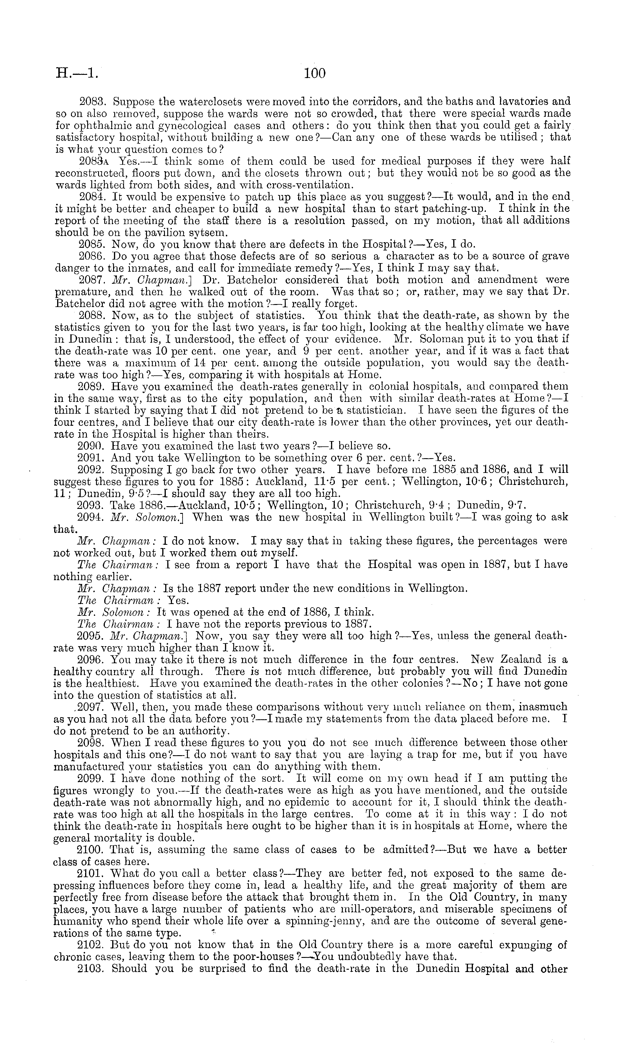 2083. Suppose the waterclosets were moved into the corridors, and the baths and lavatories and so on also removed, suppose the wards were not so crowded, that there were special wards made for ophthalmic and gynecological cases and others : do you think then that you could get a fairly satisfactory hospital, without building a new one ? —Can any one of these wards be utilised ; that is what your question comes to ? 2083 a Yes. —I think some of them could be used for medical purposes if they were half reconstructed, floors put down, and the closets thrown out; but they would not be so good as the wards lighted from both sides, and with cross-ventilation. 2084. It would be expensive to patch up this place as you suggest?—lt would, and in the end it might be better and cheaper to build a new hospital than to start patching-up. I think in the report of the meeting of the staff there is a resolution passed, on my motion, that all additions should be on the pavilion sytsem. 2085. Now, do you know that there are defects in the Hospital ? —Yes, I do. 2086. Do you agree that those defects are of so serious a character as to be a source of grave danger to the inmates, and call for immediate remedy?— Yes, I think I may say that. 2087. Mr. Chapman.] Dr. Batchelor considered that both motion and amendment were premature, and then he walked out of the room. Was that so; or, rather, may we say that Dr. Batchelor did not agree with the motion? —I really forget. 2088. Now, as to the subject of statistics. You think that the death-rate, as shown by the statistics given to you for the last two years, is far too high, looking at the healthy climate we have in Dunedin : that is, I understood, the effect of your evidence. Mr. Soloman put it to you that if the death-rate was 10 per cent, one year, and 9 per cent, another year, and if it was a fact that there was a maximum of 14 per cent, among the outside population, you would say the deathrate was too high ?—Yes, comparing it with hospitals at Home. 2089. Have you examined the death-rates generally in colonial hospitals, and compared them in the same way, first as to the city population, and then with similar death-rates at Home ?—I think I started by saying that I did not pretend to be ti statistician. I have seen the figures of the four centres, and I believe that our city death-rate is lower than the other provinces, yet our deathrate in the Hospital is higher than theirs. 2090. Have you examined the last two years ?—I believe so. 2091. And you take Wellington to be something over 6 per. cent. ?—Yes. 2092. Supposing Igo back for two other years. I have before me 1885 and 1886, and I will suggest these figures to you for 1885 : Auckland, 115 per cent.; Wellington, 10-6; Christchurch, 11; Dunedin, 9-s?—l should say they are all too high. 2093. Take 1886.—Auckland, 10-5; Wellington, 10; Christchurch, 9-4; Dunedin, 9-7. 2094. Mr. Solomon.] When was the new hospital in Wellington built ?—I was going to ask that. Mr. Chapman : Ido not know. I may say that in taking these figures, the percentages were not worked out, but I worked them out myself. The Chairman: I see from a report I have that the Hospital was open in 1887, but I have nothing earlier. Mr. Chapman : Is the 1887 report under the new conditions in Wellington. The, Chairman : Yes. Mr. Solomon : It was opened at the end of 1886, I think. The Chairman : I have not the reports previous to 1887. 2095. Mr. Chapman.] Now, you say they were all too high ?—Yes, unless the general deathrate was very much higher than I know it. 2096. You may take it there is not much difference in the four centres. New Zealand is a healthy country all through. There is not much difference, but probably you will find Dunedin is the healthiest. Have you examined the death-rates in the other colonies ?—No; I have not gone into the question of statistics at all. .2097. Well, then, you made these comparisons without very much reliance on thorn, inasmuch as you had not all the data before you ?—I made my statements from the data placed before me. I do not pretend to be an authority. 2098. When I read these figures to you you do not see much difference between those other hospitals and this one?—l do not want to say that you are laying a trap for me, but if you have manufactured your statistics you can do anything with them. 2099. I have done nothing of the sort. It will come on my own head if I am putting the figures wrongly to you.—lf the death-rates were as high as you have mentioned, and the outside death-rate was not abnormally high, and no epidemic to account for it, I should think the deathrate was too high at all the hospitals in the large centres. To come at it in this way :I do not think the death-rate in hospitals here ought to be higher than it is in hospitals at Home, where the general mortality is double. 2100. That is, assuming the same class of cases to be admitted?— But we have a better class of cases here. 2101. What do you call a better class?— They are better fed, not exposed to the same depressing influences before they come in, lead a healthy life, and the great majority of them are perfectly free from disease before the attack that brought them in. In the Old Country, in many places, you have a large number of patients who are mill-operators, and miserable specimens of humanity who spend their whole life over a spinning-jenny, and are the outcome of several generations of the same type. 2102. But do you not know that in the Old Country there is a more careful expunging of chronic cases, leaving them to the poor-houses ?—-You undoubtedly have that. 2103. Should you be surprised to find the death-rate in the Dunediu Hospital and other