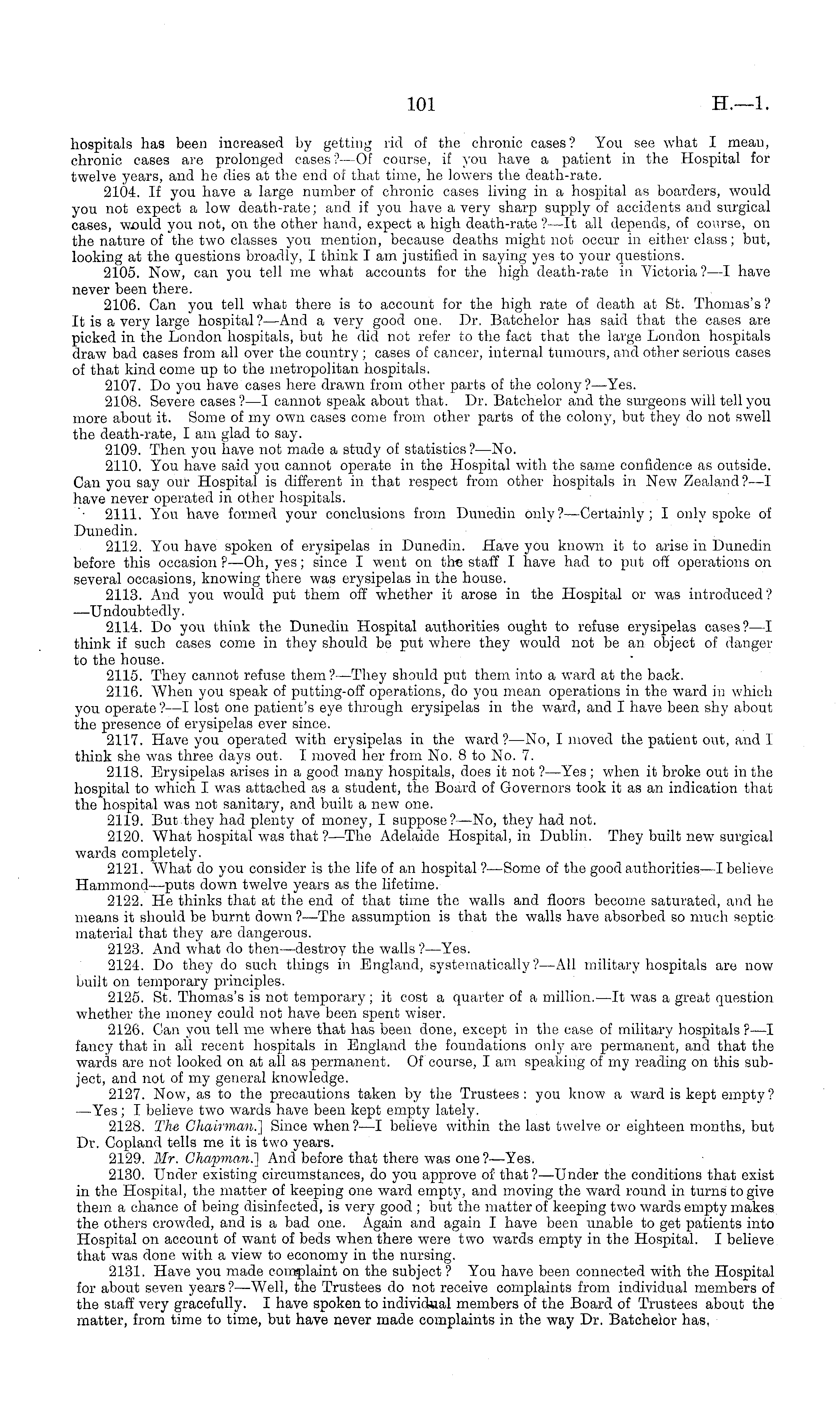 hospitals has been increased by getting rid of the chronic cases? You see, what I mean, chronic cases are prolonged cases?—Of course, if you have a patient in the Hospital for twelve years, and he dies at the end of that time, he lowers the death-rate. 2104. If you have a large number of chronic cases living in a hospital as boarders, would you not expect a low death-rate; and if you have a very sharp supply of accidents and surgical cases, -would you not, on the other hand, expect a high death-rate ?—lt all depends, of course, on the nature of the two classes you mention, because deaths might not occur in either class; but, looking at the questions broadly, I think I am justified in saying yes to your questions. 2105. Now, can you tell me what accounts for the high death-rate in Victoria ? —I have never been there. 2106. Can you tell what there is to account for the high rate of death at St. Thomas's? It is a very large hospital? —And a very good one. Dr. Batchelor has said that the cases are picked in the London hospitals, but he did not refer to the fact that the large London hospitals draw bad cases from all over the country ; cases of cancer, internal tumours, and other serious cases of that kind come up to the metropolitan hospitals. 2107. Do you have cases here drawn from other parts of the colony?— Yes. 2108. Severe cases ?—I cannot speak about that. Dr. Batchelor and the surgeons will tell you more about it. Some of my own cases come from other parts of the colony, but they do not swell the death-rate, I am glad to say. 2109. Then you have not made a study of statistics ? —No. 2110. You have said you cannot operate in the Hospital with the same confidence as outside. Can you say our Hospital is different in that respect from other hospitals in. New Zealand ?—I have never operated in other hospitals. 2111. You have formed your conclusions from Dunedin only?— Certainly; I only spoke of Dunedin. 2112. You have spoken of erysipelas in Dunedin. Have you known it to arise hi Dunedin before this occasion? —Oh, yes; since I went on the staff I have had to put off operations on several occasions, knowing there was erysipelas in the house. 2113. And you would put them off whether it arose in the Hospital or was introduced? —Undoubtedly. 2114. Do you think the Dunedin Hospital authorities ought to refuse erysipelas cases ? —I think if such cases come in they should be put where they would not be an object of danger to the house. 2115. They cannot refuse them ?—They should put them into a ward at the back. 2116. When you speak of putting-off operations, do you mean operations in the ward in which you operate? —I lost one patient's eye through erysipelas in the ward, and I have been shy about the presence of erysipelas ever since. 2117. Have you operated with erysipelas in the ward ? —No, I moved the patient out, and I think she was three days out. I moved her from No. Bto No. 7. 2118. Erysipelas arises in a good many hospitals, does it not ?—Yes; when it broke out in the hospital to which I was attached as a student, the Board of Governors took it as an indication that the hospital was not sanitary, and built a new one. 2119. But they had plenty of money, I suppose?—No, they had not. 2120. What hospital was that ? —The Adelaide Hospital, in Dublin. They built new surgical wards completely. 2121. What do you consider is the life of an hospital ?—Some of the good authorities—l believe Hammond —puts down twelve years as the lifetime. 2122. He thinks that at the end of that time the walls and floors become saturated, and he means it should be burnt down ?—The assumption is that the walls have absorbed so much septic material that they are dangerous. 2123. And what do then—destroy the walls ? —Yes. 2124. Do they do such things in England, systematically?— All military hospitals are now built on temporary principles. 2125. St. Thomas's is not temporary; it cost a quarter of a million.—lt was a great question whether the money could not have been spent wiser. 2126. Can you tell me where that has been done, except in the case of military hospitals ?—I fancy that in all recent hospitals in England the foundations only are permanent, and that the wards are not looked on at all as permanent. Of course, lam speaking of my reading on this subject, and not of my general knowledge. 2127. Now, as to the precautions taken by the Trustees: you know a ward is kept empty? —Yes; I believe two wards have been kept empty lately. 2128. The Chairman.'] Since when?—l believe within the last twelve or eighteen months, but Dr. Copland tells me it is two years. 2129. Mr. Chapman.~] And" before that there was one ? —Yes. 2130. Under existing circumstances, do you approve of that?—-Under the conditions that exist in the Hospital, the matter of keeping one ward empty, and moving the ward round in turns to give them a chance of being disinfected, is very good ; but the matter of keeping two wards empty makes the others crowded, and is a bad one. Again and again I have been unable to get patients into Hospital on account of want of beds when there were two wards empty in the Hospital. I believe that was done with a view to economy in the nursing. 2131. Have you made complaint on the subject ? You have been connected with the Hospital for about seven years?— Well, the Trustees do not receive complaints from individual members of the staff very gracefully. I have spoken to individual members of the Board of Trustees about the matter, from time to time, but have never made complaints in the way Dr. Batchelor has,