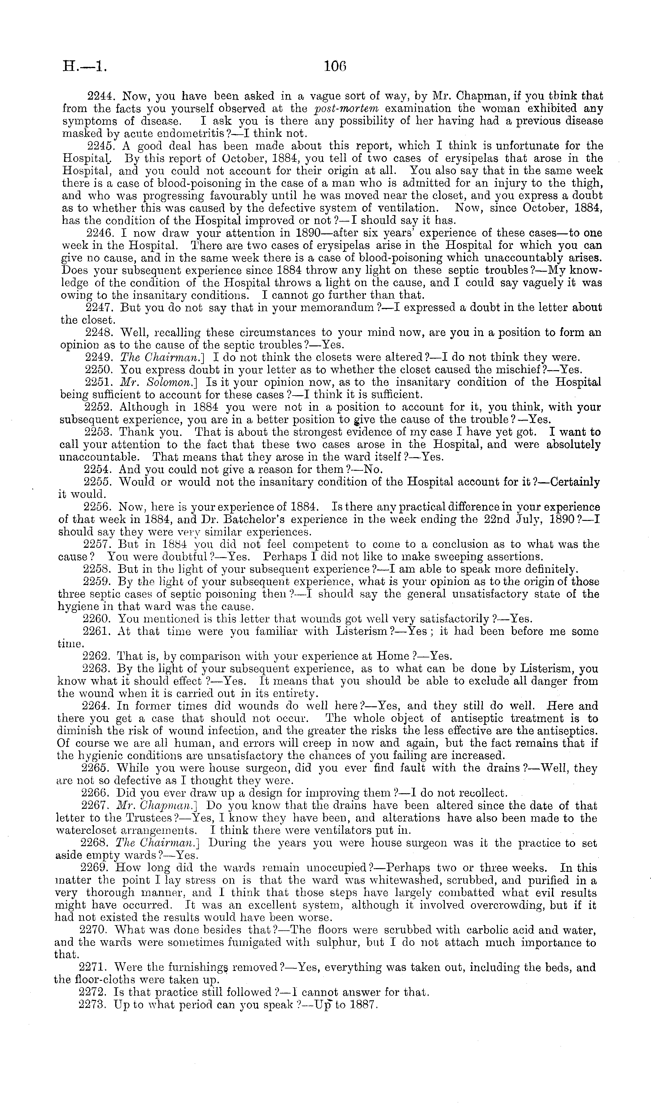 2244. Now, you have been asked in a vague sort of way, by Mr. Chapman, if you think that from the facts you yourself observed at the post-mortem examination the woman exhibited any symptoms of disease. I ask you is there any possibility of her having had a previous disease masked by acute endometritis?—l think not. 2245. A good deal has been made about this report, which I think is unfortunate for the Hospital,. By this report of October, 1884, you tell of two cases of erysipelas that arose in the Hospital, and you could not account for their origin at all. You also say that in the same week there is a case of blood-poisoning in the case of a man who is admitted for an injury to the thigh, and who was progressing favourably until he was moved near the closet, and you express a doubt as to whether this was caused by the defective system of ventilation. Now, since October, 1884, has the condition of the Hospital improved or not ? —I should say it has. 2246. I now draw your attention in 1890—after six years' experience of these cases—to one week in the Hospital. There are two cases of erysipelas arise in the Hospital for which you can give no cause, and in the same week there is a case of blood-poisoning which unaccountably arises. "Does your subsequent experience since 1884 throw any light on these septic troubles ? —My knowledge of the condition of the Hospital throws a light on the cause, and I could say vaguely it was owing to the insanitary conditions. I cannot go further than that. 2247. But you do not say that in your memorandum ?—I expressed a doubt in the letter about the closet. 2248. Well, recalling these circumstances to your mind now, are you in a position to form an opinion as to the cause of the septic troubles ?—Yes. 2249. The Chairman.] Ido not think the closets were altered?—l do not think they were. 2250. You express doubt in your letter as to whether the closet caused the mischief?— Yes. 2251. Mr. Solomon.] Is it your opinion now, as to the insanitary condition of the Hospital being sufficient to account for these cases ?—I think it is sufficient. 2252. Although in 1884 you were not in a position to account for it, you think, with your subsequent experience, you are in a better position to give the cause of the trouble?— Yes. 2253. Thank you. That is about the strongest evidence of my case I have yet got. I want to call your attention to the fact that these two cases arose in the Hospital, and were absolutely unaccountable. That means that they arose in the ward itself ?—Yes. 2254. And you could not give a reason for them? —No. 2255. Would or would not the insanitary condition of the Hospital account for it?— Certainly it would. 2256. Now, here is your experience of 1884. Is there any practical difference in your experience of that week in 1884, and Dr. Batchelor's experience in the week ending the 22nd July, 1890 ?—I should say they were very similar experiences. 2257. But in 1884 you did not feel competent to come to a conclusion as to what was the cause? You were doubtful?— Yes. Perhaps I did not like to make sweeping assertions. 2258. But in the light of your subsequent experience ?- —I am able to speak more definitely. 2259. By the light of your subsequent experience, what is your opinion as to the origin of those three septic cases of septic poisoning then ?—I should say the general unsatisfactory state of the hygiene in that ward was the cause. 2260. You mentioned is this letter that wounds got well very satisfactorily ? —Yes. 2261. At that time were you familiar with Listerism?—Yes; it had been before me some time. 2262. That is, by comparison with your experience at Home ? —Yes. 2263. By the light of your subsequent experience, as to what can be done by Listerism, you know what it should effect ?—Yes. It means that you should be able to exclude all danger from the wound when it is carried out in its entirety. 2264. In former times did wounds do well here?— Yes, and they still do well. Here and there you get a case that should not occur. The whole object of antiseptic treatment is to diminish the risk of wound infection, and the greater the risks the less effective are the antiseptics. Of course we are bAI human, and errors will creep in now and again, but the fact remains that if the hygienic conditions are unsatisfactory the chances of you failing are increased. 2265. While you were house surgeon, did you ever find fault with the drains ?—Well, they are not so defective as I thought they were. 2266. Did you ever draw up a design for improving them ?—1 do not recollect. 2267. Mr. Chapman.] Do you know that the drains have been altered since the date of that letter to the Trustees ?—Yes, I know they have been, and alterations have also been made to the watercloset arrangements. I think there were ventilators put in. 2268. The Chairman.] During the years you were house surgeon was it the practice to set aside empty wards?— Yes. 2269. How long did the wards remain unoccupied ?—Perhaps two or three weeks. In this matter the point I lay stress on is that the ward was whitewashed, scrubbed, and purified in a very thorough manner, and I think that those steps have largely combatted what evil results might have occurred. It was an excellent system, although it involved overcrowding, but if it had not existed the results would have been worse. 2270. What was done besides that ? —The floors were scrubbed with carbolic acid and water, and the wards were sometimes fumigated with sulphur, but I do not attach much importance to that. 2271. Were the furnishings removed?— Yes, everything was taken out, including the beds, and the floor-cloths were taken up. 2272. Is that practice still followed ?—I cannot answer for that. 2273. Up to what period can you speak ?—Up" to 1887.