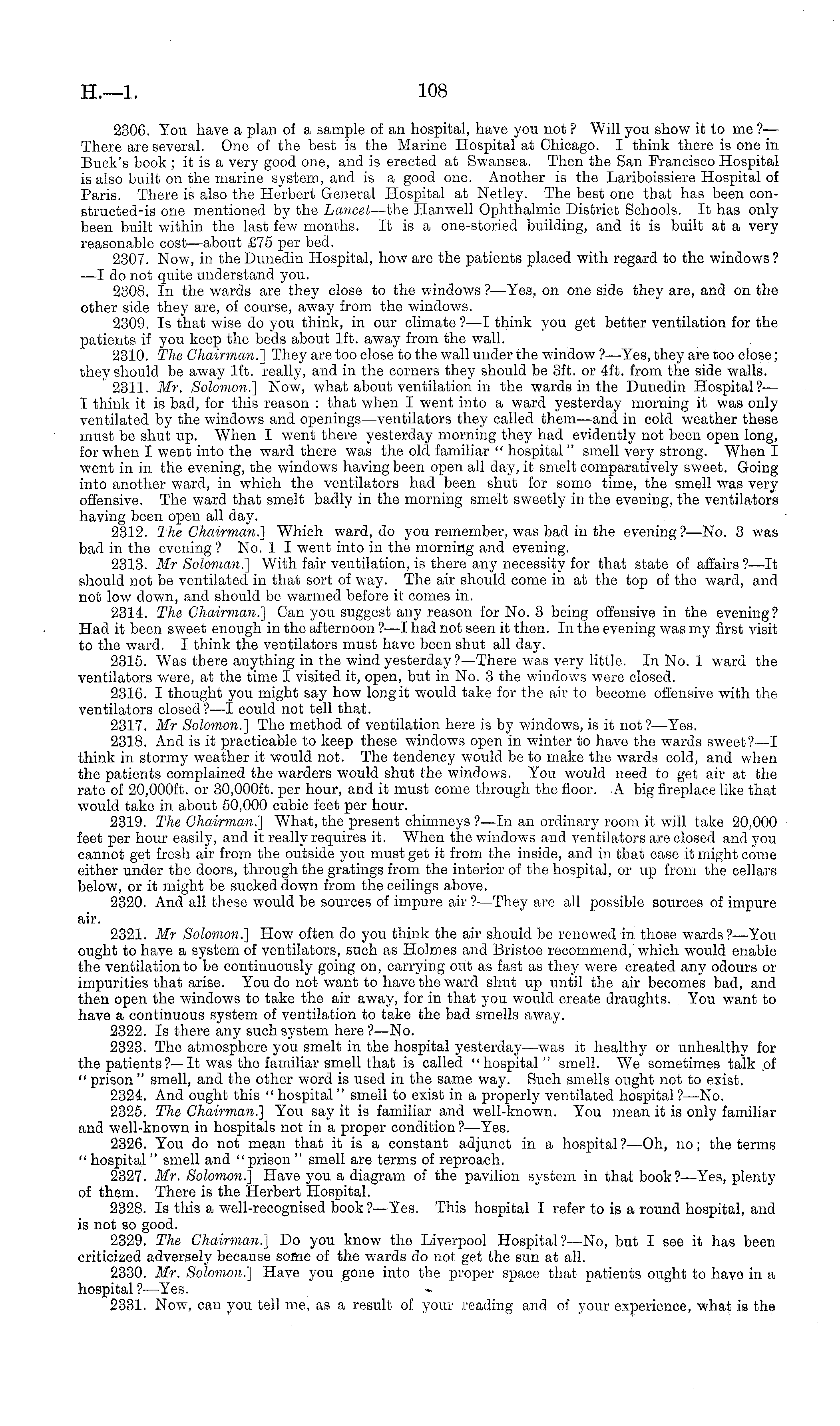 2306. You have a plan of a sample of an hospital, have you not ? "Will you show it to me ?— There are several. One of the best is the Marine Hospital at Chicago. I think there is one in Buck's book ; it is a very good one, and is erected at Swansea. Then the San Francisco Hospital is also built on the marine system, and is a good one. Another is the Lariboissiere Hospital of Paris. There is also the Herbert General Hospital at Netley. The best one that has been con-structed-is one mentioned by the Lancet —the Hanwell Ophthalmic District Schools. It has only been built within the last few months. It is a one-storied building, and it is built at a very reasonable cost —about £75 per bed. 2307. Now, in theDunedin Hospital, how are the patients placed with regard to the windows? —I do not quite understand you. 2308. In the wards are they close to the windows ?—Yes, on one side they are, and on the other side they are, of course, away from the windows. 2309. Is that wise do you think, in our climate ? —I think you get better ventilation for the patients if you keep the beds about lft. away from the wall. 2310. The Chairman.'] They are too close to the wall under the window ?—Yes, they are too close; they should be away lft. really, and in the corners they should be 3ft. or 4ft. from the side walls. 2311. Mr. Solomon.] Now, what about ventilation in the wards in the Dunedin Hospital?— I think it is bad, for this reason : that when I went into a ward yesterday morning it was only ventilated by the windows and openings—ventilators they called them —and in cold weather these must be shut up. When I went there yesterday morning they had evidently not been open long, for when I went into the ward there was the old familiar " hospital " smell very strong. When I went in in the evening, the windows having been open all day, it smelt comparatively sweet. Going into another ward, in which the ventilators had been shut for some time, the smell was very offensive. The ward that smelt badly in the morning smelt sweetly in the evening, the ventilators having been open all day. 2312. The Chairman.] Which ward, do you remember, was bad in the evening?— No. 3 was bad in the evening ? No. 1 I went into in the morning and evening. 2313. Mr Solomon.] With fair ventilation, is there any necessity for that state of affairs?—lt should not be ventilated in that sort of way. The air should come in at the top of the ward, and not low down, and should be warmed before it comes in. 2314. The Chairman.] Can you suggest any reason for No. 3 being offensive in the evening? Had it been sweet enough in the afternoon ? —I had not seen it then. In the evening was my first visit to the ward. I think the ventilators must have been shut all day. 2315. Was there anything in the wind yesterday?— There was very little. In No. 1 ward the ventilators were, at the time I visited it, open, but in No. 3 the windows were closed. 2316. I thought you might say how long it would take for the air to become offensive with the ventilators closed? —I could not tell that. 2317. Mr Solomon.] The method of ventilation here is by windows, is it not ?—Yes. 2318. And is it practicable to keep these windows open in winter to have the wards sweet? —I think in stormy weather it would not. The tendency would be to make the wards cold, and when the patients complained the warders would shut the windows. You would need to get air at the rate of 20,000 ft. or 30,000 ft. per hour, and it must come through the floor. .A big fireplace like that would take in about 50,000 cubic feet per hour. 2319. The Chairman.] What, the present chimneys ?—ln an ordinary room it will take 20,000 feet per hour easily, and it really requires it. When the windows and ventilators are closed and you cannot get fresh air from the outside you must get it from the inside, and in that ease it might come either under the doors, through the gratings from the interior of the hospital, or up from the cellars below, or it might be sucked down from the ceilings above. 2320. And all these would be sources of impure air ? —They arc all possible sources of impure air. 2321. Mr Solomon.] How often do you think the air should be renewed in those wards? —You ought to have a system of ventilators, such as Holmes and Bristoe recommend, which would enable the ventilation to be continuously going on, carrying out as fast as they were created any odours or impurities that arise. You do not want to have the ward shut up until the air becomes bad, and then open the windows to take the air away, for in that you would create draughts. You want to have a continuous system of ventilation to take the bad smells away. 2322. Is there any such system here?— No. 2323. The atmosphere you smelt in the hospital yesterday—was it healthy or unhealthy for the patients? —It was the familiar smell that is called "hospital" smell. We sometimes talk of "prison" smell, and the other word is used in the same way. Such smells ought not to exist. 2324. And ought this " hospital " smell to exist in a properly ventilated hospital ? —No. 2325. The Chairman.] You say it is familiar and well-known. You mean it is only familiar and well-known in hospitals not in a proper condition ?—Yes. 2326. You do not mean that it is a constant adjunct in a hospital ?—Oh, no; the terms " hospital " smell and " prison " smell are terms of reproach. 2327. Mr. Solomon.] Have you a diagram of the pavilion system in that book?— Yes, plenty of them. There is the Herbert Hospital. 2328. Is this a well-recognised book?— Yes. This hospital I refer to is a round hospital, and is not so good. 2329. The Chairman.] Do you know the Liverpool Hospital?—No, but I see it has been criticized adversely because some of the wards do not get the sun at all. 2330. Mr. Solomon.] Have you gone into the proper space that patients ought to have in a hospital ?—Yes. 2331. Now, can you tell me, as a result of your 
