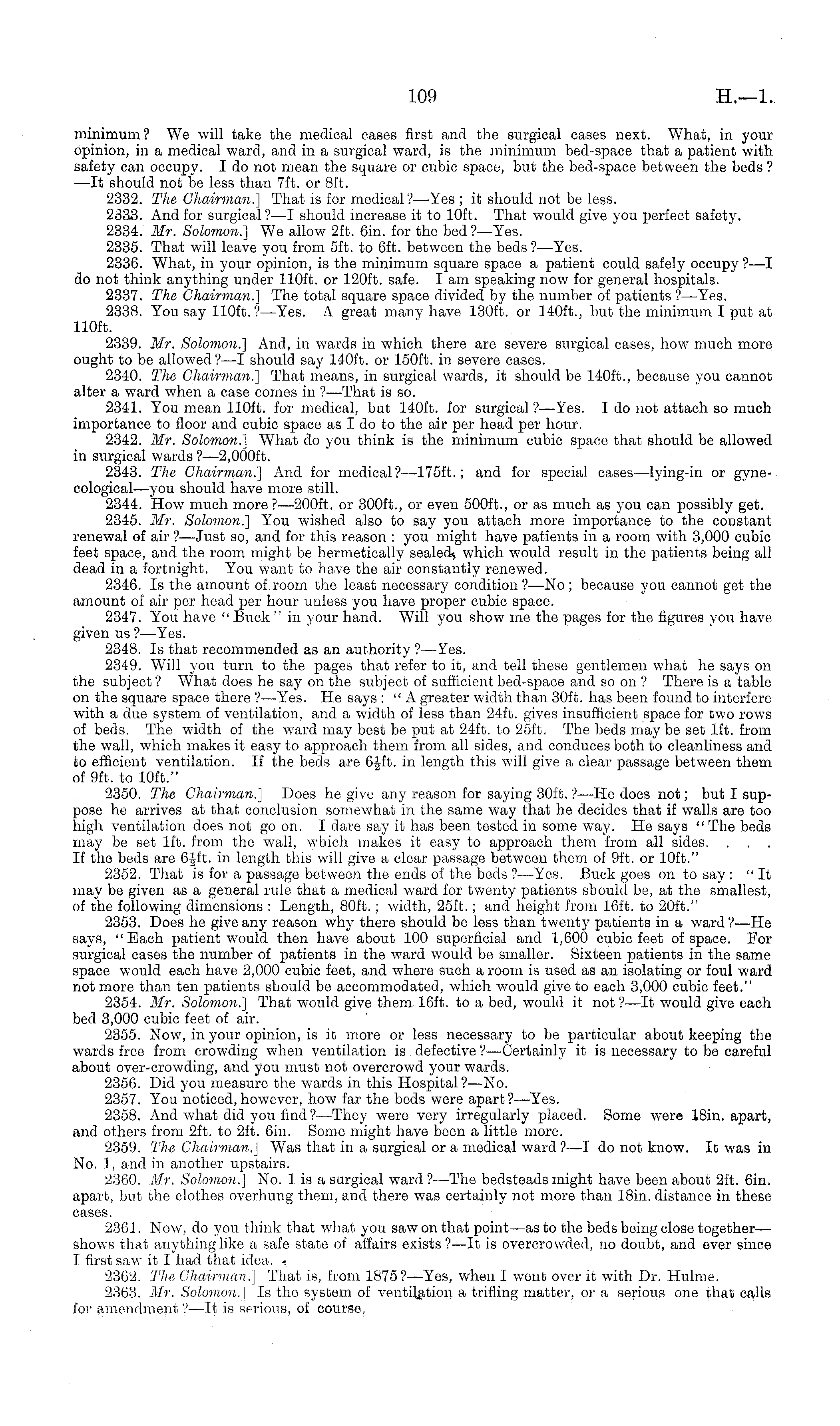 minimum? We will take the medical cases first and the surgical cases next. What, in your opinion, in a medical ward, and in a surgical ward, is the minimum bed-space that a patient with safety can occupy. Ido not mean the square or cubic space, but the bed-space between the beds ? —It should not be less than 7ft. or Bft. 2332. The Chairman.] That is for medical?— Yes ;it should not be less. 2333. And for surgical?—l should increase it to 10ft. That would give you perfect safety. 2334. Mr. Solomon.} We allow 2ft. 6in. for the bed ?—Yes. 2335. That will leave you from sft. to 6ft. between the beds?— Yes. 2336. What, in your opinion, is the minimum square space a patient could safely occupy ?—I do not think anything under 110 ft. or 120 ft. safe. lam speaking now for general hospitals. 2337. The Chairman.] The total square space divided by the number of patients ?—Yes. 2338. You say 110 ft. ?—Yes. A great many have 130 ft. or 140 ft., but the minimum I put at 110 ft. 2339. Mr. Solomon.] And, in wards in which there are severe surgical cases, how much more ought to be allowed?—l should say 140 ft. or 150 ft. in severe cases. 2340. The Chairman.} That means, in surgical wards, it should be 140 ft., because you cannot alter a ward when a case comes in ?—That is so. 2341. You mean 110 ft. for medical, but 140 ft. for surgical?— Yes. Ido not attach so much importance to floor and cubic space as I do to the air per head per hour. 2342. Mr. Solomon.} What do you think is the minimum cubic space that should be allowed in surgical wards?—2,oooft. 2343. The Chairman.] And for medical?—l7sft.; and for special cases —lying-in or gynecological—you should have more still. 2344. How much more ?—2ooft. or 300 ft., or even 500 ft., or as much as you can possibly get. 2345. Mr. Solomon.} You wished also to say you attach more importance to the constant renewal of air ?—Just so, and for this reason : you might have patients in a room with 3,000 cubic feet space, and the room might be hermetically sealed-, which would result in the patients being all dead in a fortnight. You want to have the air constantly renewed. 2346. Is the amount of room the least necessary condition ?—No ; because you cannot get the amount of air per head per hour unless you have proper cubic space. 2347. You have "Brick" in your hand. Will you show me the pages for the figures you have given us?— Yes. 2348. Is that recommended as an authority ?—Yes. 2349. Will you turn to the pages that refer to it, and tell these gentlemen what he says on the subject ? What does he say on the subject of sufficient bed-space and so on ? There is a table on the square space there ?—Yes. He says : " A greater width than 30ft. has been found to interfere with a due system of ventilation, and a width of less than 24ft. gives insufficient space for two rows of beds. The width of the ward may best be put at 24ft. to 25ft. The beds may be set lft. from the wall, which makes it easy to approach them from all sides, and conduces both to cleanliness and to efficient ventilation. If the beds are 6Jft. in length this will give a clear passage between them of 9ft. to 10ft." 2350. The Chairman.] Does he give any reason for saying 30ft.?—He does not; but I suppose he arrives at that conclusion somewhat in the same way that he decides that if walls are too high ventilation does not go on. I dare say it has been tested in some way. He says " The beds may be set lft. from the wall, which makes it easy to approach them from all sides. If the beds are 6-Jft. in length this will give a clear passage between them of Oft. or 10ft." 2352. That is for a passage between the ends of the beds ?—Yes. Buck goes on to say : " It may be given as a general rule that a medical ward for twenty patients should be, at the smallest, of the following dimensions : Length, 80ft.; width, 25ft.; and height from 16ft. to 20ft." 2353. Does he give any reason why there should be less than twenty patients in a ward ?—He says, "Each patient would then have about 100 superficial and 1,600 cubic feet of space. For surgical cases the number of patients in the ward would be smaller. Sixteen patients in the same space would each have 2,000 cubic feet, and where such a room is used as an isolating or foul ward not more than ten patients should be accommodated, which would give to each 3,000 cubic feet." 2354. Mr. Solomon.} That would give them 16ft. to a bed, would it not ? —lt would give each bed 3,000 cubic feet of air. 2355. Now, in your opinion, is it more or less necessary to be particular about keeping the wards free from crowding when ventilation is defective ?—Certainly it is necessary to be careful about over-crowding, and you must not overcrowd your wards. 2356. Did you measure the wards in this Hospital?— No. 2357. You noticed, however, how far the beds were apart? —Yes. 2358. And what did you find ?—They were very irregularly placed. Some were 18in. apart, and others from 2ft. to 2ft. 6in. Some might have been a little more. 2359. The Chairman.} Was that in a surgical or a medical ward ?-—I do not know. It was in No. 1, and in another upstairs. 2360. Mr. Solomon.} No. lis a surgical ward ?—The bedsteads might have been about 2ft. 6in. apart, but the clothes overhung them, and there was certainly not more than 18in. distance in these cases. 23G1. Now, do you think that what you saw on that pomt —as to the beds being close together— shows that anything like a safe state of affairs exists ?—lt is overcrowded, no doubt, and ever since I first saw it I had that idea. »._ 2362. The Chairman.] That is, from 1875? —Yes, when I went over it with Dr. Hulme. 2363. Mr. Solomon. | Is the system of ventilation a trifling matter, or a serious one that calls for amendment ?—lt is serious, of course.