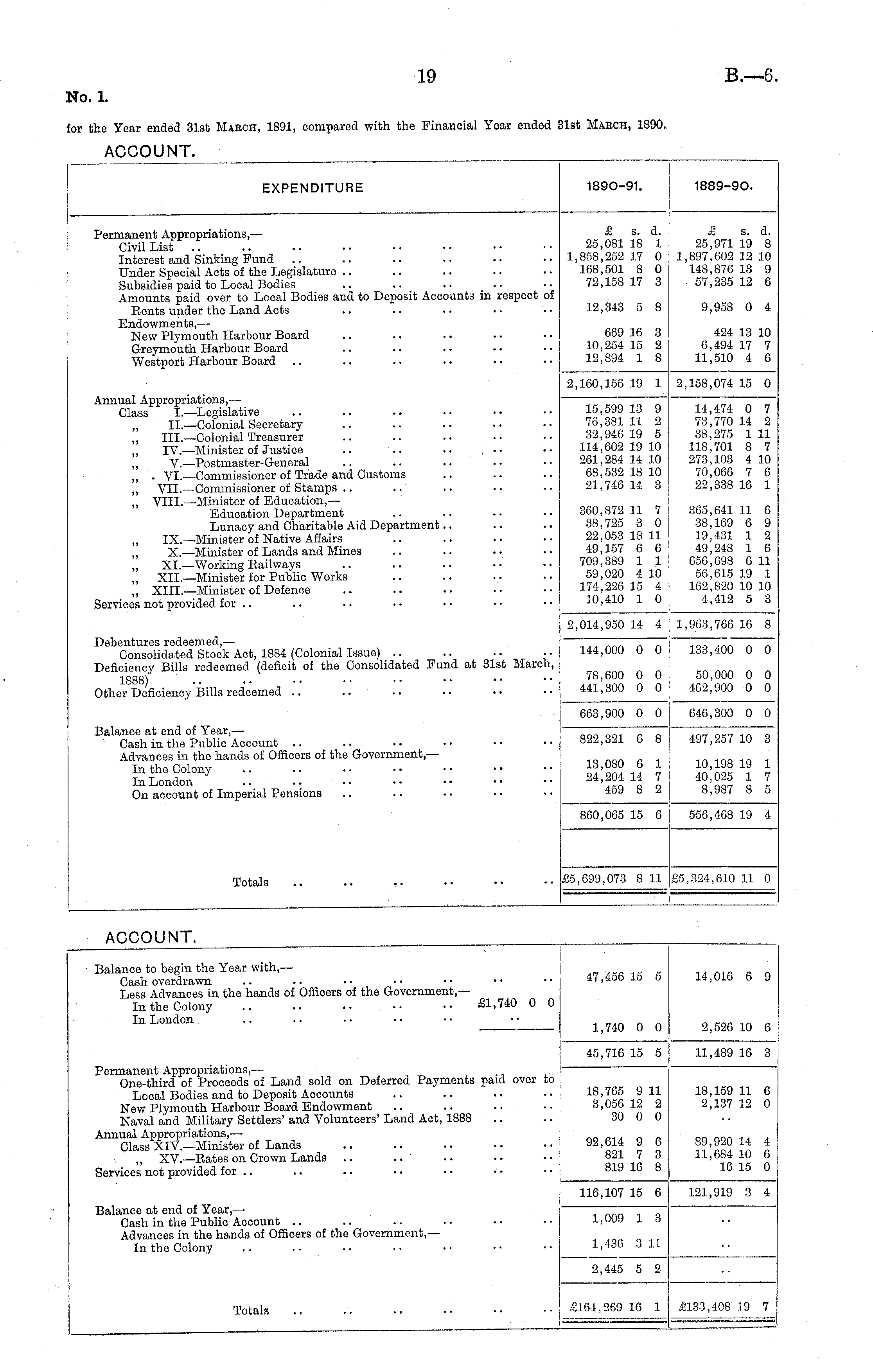 EXPENDITURE 1890-91. 1889-90. Permanent Appropriations, — Civil List Interest and Sinking Fund Under Special Acts of the Legislature Subsidies paid to Local Bodies Amounts paid over to Local Bodies and to Deposit Accounts in respect of Bents under the Land Acts Endowments, — New Plymouth Harbour Board Greymouth Harbour Board Westport Harbour Board s s. a. 25,081 18 1 1,858,252 17 0 168,501 8 0 72,158 17 3 £ s. d. 25,971 19 8 1,897,602 12 10 148,876 13 9 57,235 12 6 12,343 5 8 9,958 0 4 669 16 8 10,254 IS 2 12,894 1 8 424 13 10 6,494 17 7 11,510 4 6 2,160,156 19 1 2,158,074 15 0 Annual Appropriations, — Glass I.—Legislative „ II.—Colonial Secretary „ III.—Colonial Treasurer ,, IV. —Minister of Justice .. .. .. . • ■ „ V. —Postmaster-General ,, . VI. —Commissioner of Trade and Customs ,, VII. —Commissioner of Stamps .. ,, VIII.—Minister of Education,— Education Department Lunacy and Charitable Aid Department.. ,, IX.—Minister of Native Affairs ,, X. —Minister of Lands and Mines „ XI. —Working Railways „ XII.—Minister for Public Works „ XIII.—Minister of Defence Services not provided for 15,599 13 9 76,381 11 2 32,946 19 5 114,602 19 10 261,284 14 10 68,532 18 10 21,746 14 3 360,872 11 7 38,725 3 0 22,053 18 11 49,157 6 6 709,389 1 1 59,020 4 10 174,226 15 4 10,410 1 0 14,474 0 7 73,770 14 2 38,275 1 11 118,701 8 7 273,103 4 10 70,066 7 6 22,338 16 1 365,641 11 6 38,169 6 9 19,431 1 2 49,248 1 6 656,698 6 11 56,615 19 1 162,820 10 10 4,412 5 3 Debentures redeemed,— Consolidated Stock Act, 1884 (Colonial Issue) Deficiency Bills redeemed (deficit of the Consolidated Fund at 31st March, 1888) Other Deficiency Bills redeemed .. .. ■ 2,014,950 14 4 1,963,766 16 8 144,000 0 0 133,400 0 0 78,600 0 0 441,300 0 0 50,000 0 0 462,900 0 0 Balance at end of Year, — Cash in the Public Account Advances in the hands of Officers of the Government,— In the Colony In London .. .. On account of Imperial Pensions 663,900 0 0 646,300 0 0 822,321 6 8 497,257 10 3 13,080 6 1 24,204 14 7 459 8 2 10,198 19 1 40,025 1 7 8,987 8 5 860,065 15 6 556,468 19 i Totals £5,699,073 8 11 £5,324,610 11 0 ACCOUNT. Balance to begin the Year with, — Cash overdrawn Less Advances in the hands of Officers of the Government, — In the Colony £1.740 0 0 In London 47,456 15 5 14,016 6 9 1,740 0 0 2,526 10 6 Permanent Appropriations, — One-third of Proceeds of Land sold on Deferred Payments paid over to Local Bodies and to Deposit Accounts New Plymouth Harbour Board Endowment .. .. Naval and Military Settlers' and Volunteers' Land Act, 1888 Annual Appropriations, — Class XIV.—Minister of Lands . ,, XV.—Bates on Crown Lands .. Services not provided for 45,716 15 5 11,489 16 3 18,765 9 11 3,056 12 2 30 0 0 18,159 11 6 2,137 12 0 92,614 9 6 821 7 3 819 16 8 89,920 14 4 11,684 10 6 16 15 0 116,107 15 6 121,919 3 4 Balance at end of Year, — Cash in the Public Account Advances in the hands of Officers of the Government,— In the Colony 1,009 1 3 1,436 3 11 2,445 5 2 Totals £161,969 16 1 •■6133,408 19 7