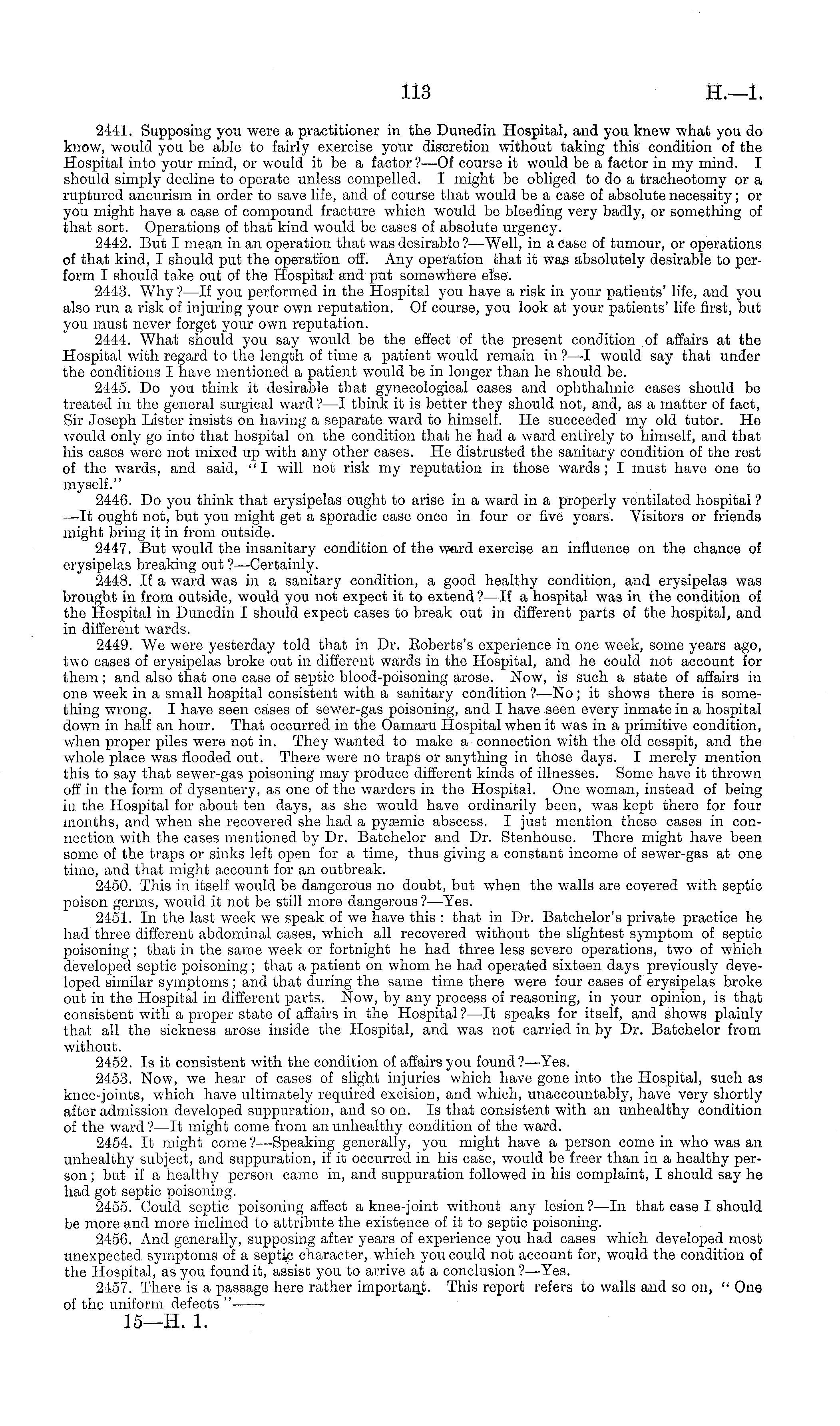 2441. Supposing you were a practitioner in the Dunedin Hospital, and you knew what you do know, would you be able to fairly exercise your discretion without taking this condition of the Hospital into your mind, or would it be a factor?—Of course it would be a factor in my mind. I should simply decline to operate unless compelled. I might be obliged to do a tracheotomy or a ruptured aneurism in order to save life, and of course that would be a case of absolute necessity ; or you might have a case of compound fracture which would be bleeding very badly, or something of that sort. Operations of that kind would be cases of absolute urgency. 2442. But I mean in an operation that was desirable ?—Well, in a case of tumour, or operations of that kind, I should put the operation off. Any operation that it was absolutely desirable to perform I should take out of the Hospital and put somewhere else. 2443. Why ? —lf you performed in the Hospital you have a risk in your patients' life, and you also run a risk of injuring your own reputation. Of course, you look at your patients' life first, but you must never forget your own reputation. 2444. What should you say would be the effect of the present condition of affairs at the Hospital with regard to the length of time a patient would remain in ?—I would say that under the conditions I have mentioned a patient would be in longer than he should be. 2445. Do you think it desirable that gynecological cases and ophthalmic eases should be treated in the general surgical ward?—l think it is better they should not, and, as a matter of fact, Sir Joseph Lister insists on having a separate ward to himself. He succeeded my old tutor. He would only go into that hospital on the condition that he had a ward entirely to himself, and that his cases were not mixed up with any other cases. He distrusted the sanitary condition of the rest of the wards, and said, " I will not risk my reputation in those wards ; I must have one to myself." 2446. Do you think that erysipelas ought to arise in a ward in a properly ventilated hospital ? —It ought not, but you might get a sporadic case once in four or five years. Visitors or friends might bring it in from outside. 2447. But would the insanitary condition of the ward exercise an influence on the chance of erysipelas breaking out ? —Certainly. 2448. If a ward was in a sanitary condition, a good healthy condition, and erysipelas was brought in from outside, would you not expect it to extend?—lf a hospital was in the condition of the Hospital in Dunedin I should expect cases to break out in different parts of the hospital, and in different wards. 2449. We were yesterday told that in Dr. Eoberts's experience in one week, some years ago, two cases of erysipelas broke out in different wards in the Hospital, and he could not account for them; and also that one case of septic blood-poisoning arose. Now, is such a state of affairs in one week in a small hospital consistent with a sanitary condition ? —No; it shows there is something wrong. I have seen cases of sewer-gas poisoning, and I have seen every inmate in a hospital down in half an hour. That occurred in the Oamaru Hospital when it was in a primitive condition, when proper piles were not in. They wanted to make a connection with the old cesspit, and the whole place was flooded out. There were no traps or anything in those days. I merely mention this to say that sewer-gas poisoning may produce different kinds of illnesses. Some have it thrown off in the form of dysentery, as one of the warders in the Hospital. One woman, instead of being in the Hospital for about ten days, as she would have ordinarily been, was kept there for four months, and when she recovered she had a pyaamic abscess. I just mention these cases in connection with the cases mentioned by Dr. Batchelor and Dr. Stenhouse. There might have been some of the traps or sinks left open for a time, thus giving a constant income of sewer-gas at one time, and that might account for an outbreak. 2450. This in itself would be dangerous no doubt, but when the walls are covered with septic poison germs, would it not be still more dangerous ?—Yes. 2451. In the last week we speak of we have this : that in Dr. Batchelor's private practice he had three different abdominal cases, which all recovered without the slightest symptom of septic poisoning; that in the same week or fortnight he had three less severe operations, two of which developed septic poisoning; that a patient on whom he had operated sixteen days previously developed similar symptoms ; and that during the same time there were four cases of erysipelas broke out in the Hospital in different parts. Now, by any process of reasoning, in your opinion, is that consistent with a proper state of affairs in the Hospital ? —lt speaks for itself, and shows plainly that all the sickness arose inside the Hospital, and was not carried in by Dr. Batchelor from without. 2452. Is it consistent with the condition of affairs you found?— Yes. 2453. Now, we hear of cases of slight injuries which have gone into the Hospital, such as knee-joints, which have ultimately required excision, and which, unaccountably, have very shortly after admission developed suppuration, and so on. Is that consistent with an unhealthy condition of the ward? —It might come from an unhealthy condition of the ward. 2454. It might come ?—Speaking generally, you might have a person come in who was an unhealthy subject, and suppuration, if it occurred in his case, would be freer than in a healthy person ; but if a healthy person came in, and suppuration followed in his complaint, I should say he had got septic poisoning. 2455. Could septic poisoning affect a knee-joint without any lesion?—ln that case I should be more and more inclined to attribute the existence of it to septic poisoning. 2456. And generally, supposing after years of experience you had cases which developed most unexpecte