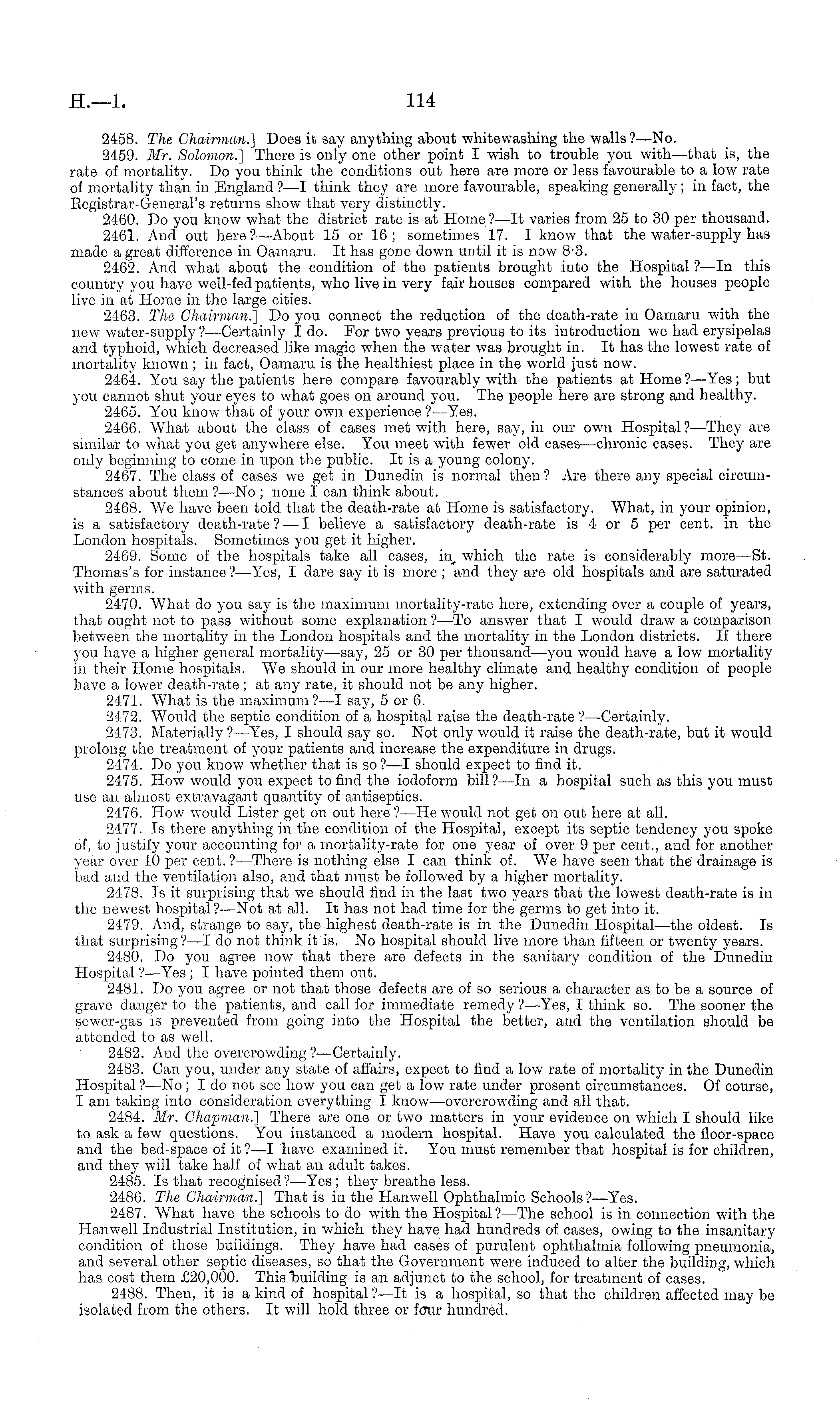 2458. The Cliairmau.] Does it say anything about whitewashing the walls?— No. 2459. Mr. Solomon.} There is only one other point I wish to trouble you with—that is, the rate of mortality. Do you think the conditions out here are more or less favourable to a low rate of mortality than in England ? —I think they are more favourable, speaking generally; in fact, the Registrar-General's returns show that very distinctly. 2460. Do you know what the district rate is at Home? —It varies from 25 to 30 per thousand. 2461. And out here? —About 15 or 16; sometimes 17. I know that the water-supply has made a great difference in Oamaru. It has gone down until it is now 8-3. 2462. And what about the condition of the patients brought into the Hospital ? —ln this country you have well-fed patients, who live in very fair houses compared with the houses people live in at Home in the large cities. 2463. The Chairman.] Do you connect the reduction of the death-rate in Oamaru with the new water-supply? —Certainly I do. For two years previous to its introduction we had erysipelas and typhoid, which decreased like magic when the water was brought in. It has the lowest rate of mortality known; in fact, Oamaru is the healthiest place in the world just now. 2464. You say the patients here compare favourably with the patients at Home? —Yes; but you cannot shut your eyes to what goes on around you. The people here are strong and healthy. 2465. You know that of your own experience ? —Yes. 2466. What about the class of cases met with here, say, in our own Hospital ?—They are similar to what you get anywhere else. You meet with fewer old cases—chronic cases. They are only beginning to come in upon the public. It is a young colony. 2467. The class of cases we get in Dunedin is normal then? Are there any special circumstances about them ?—No ; none I can think about. 2468. We have been told that the death-rate at Home is satisfactory. What, in your opinion, is a satisfactory death-rate? — I believe a satisfactory death-rate is 4 or 5 per cent, in the London hospitals. Sometimes you get it higher. 2469. Some of the hospitals take all cases, in which the rate is considerably more—St. Thomas's for instance?— Yes, I dare say it is more ; and they are old hospitals and are saturated with germs. 2470. What do you say is the maximum mortality-rate here, extending over a couple of years, that ought not to pass without some explanation ? —To answer that I would draw a comparison between the mortality in the London hospitals and the mortality in the London districts. If there you have a higher general mortality —say, 25 or 30 per thousand—you would have a low mortality in their Home hospitals. We should in our more healthy climate and healthy condition of people have a lower death-rate; at any rate, it should not be any higher. 2471. What is the maximum?—l say, sor 6. 2472. Would the septic condition of a hospital raise the death-rate ?—Certainly. 2473. Materially ?—Yes, I should say so. Not only would it raise the death-rate, but it would prolong the treatment of your patients and increase the expenditure in drugs. 2474. Do you know whether that is so ?—I should expect to find it. 2475. How would you expect to find the iodoform bill? —In a hospital such as this you must use an almost extravagant quantity of antiseptics. 2476. How would Lister get on out here ? —He would not get on out here at all. 2477. Is there anything in the condition of the Hospital, except its septic tendency you spoke of, to justify your accounting for a mortality-rate for one year of over 9 per cent., and for another year over 10 per cent. ?—There is nothing else I can think of. We have seen that the drainage is bad and the ventilation also, and that must be followed by a higher mortality. 2478. Is it surprising that we should find in the last two years that the lowest death-rate is in the newest hospital ? —Not at all. It has not had time for the germs to get into it. 2479. And, strange to say, the highest death-rate is in the Dunediu Hospital—the oldest. Is that surprising?—l do not think it is. No hospital should live more than fifteen or twenty years. 2480. Do you agree now that there are defects in the sanitary condition of the Dunedin Hospital?— Yes; I have pointed them out. 2481. Do you agree or not that those defects are of so serious a character as to be a source of grave danger to the patients, and call for immediate remedy ?—Yes, I think so. The sooner the sewer-gas is prevented from going into the Hospital the better, and the ventilation should be attended to as well. 2482. And the overcrowding ? —Certainly. 2483. Can you, under any state of affairs, expect to find a low rate of mortality in the Dunedin Hospital ?—No; Ido not see how you can get a low rate under present circumstances. Of course, I am taking into consideration everything I know —overcrowding and all that. 2484. Mr. Chapman.'] There are one or two matters in your evidence on which I should like to ask a few questions. You instanced a modern hospital. Have you calculated the floor-space and the bed-space of it?—l have examined it. You must remember that hospital is for children, and they will take half of what an adult takes. 2485. Is that recognised?— Yes; they breathe less. 2486. The Chairman.] That is in the Hanwell Ophthalmic Schools?— Yes. 2487. What have the schools to do with the Hospital?— The school is in connection with the Hanwell Industrial Institution, in which they have had hundreds of cases, owing to the insanitary condition of those buildings. They have had cases of purulent ophthalmia following pneumonia, and several other septic diseases, so that the Government were induced to alter the building, which has cost them £20,000. This "building is an adjunct to the school, for treatment of cases. 2488. Then, it is a kind of hospital ?—lt is a hospital, so that the children affected may be iso