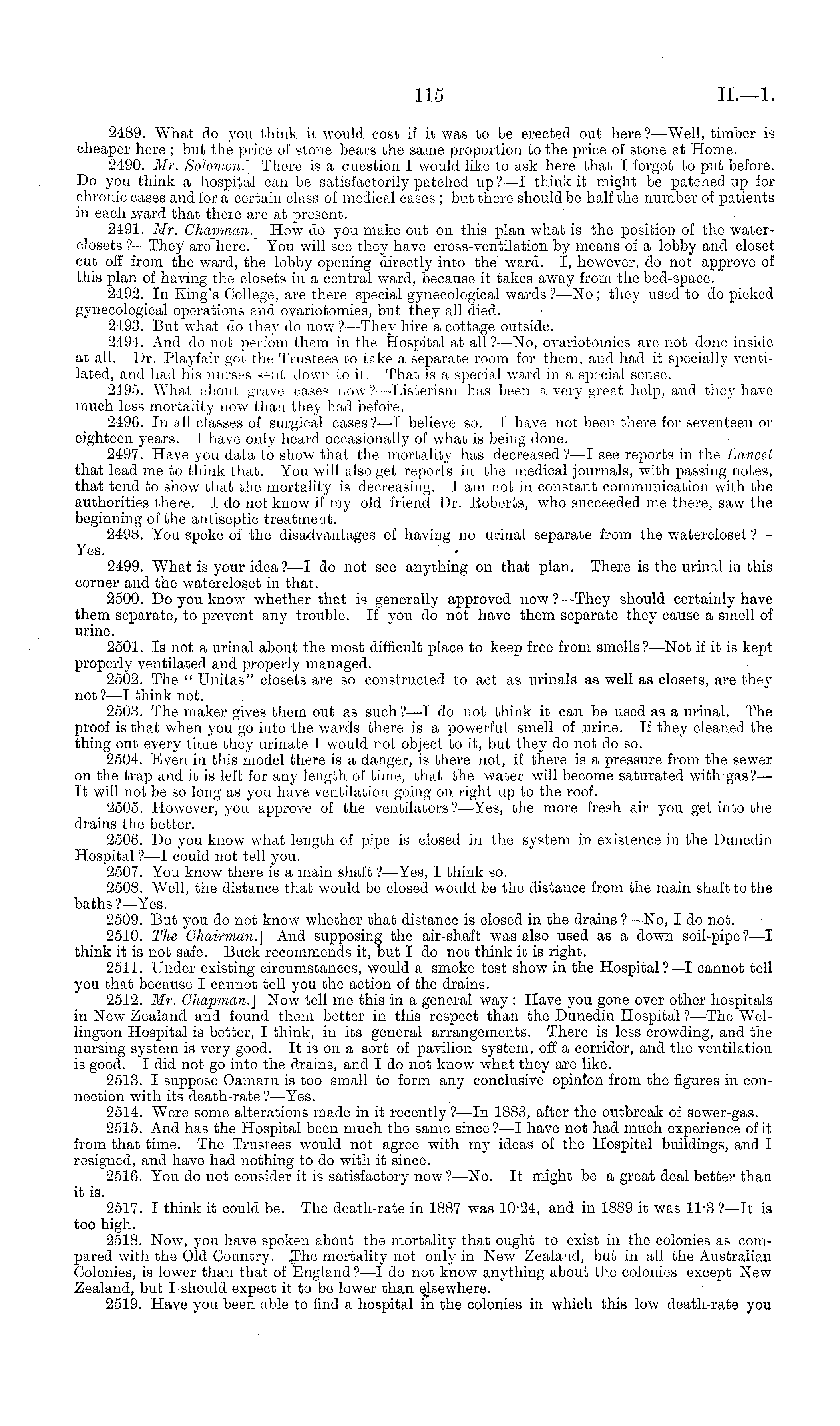2489. What do you think it would cost if it was to be erected out here ? —Well, timber is cheaper here ; but the price of stone bears the same proportion to the price of stone at Home. 2490. Mr. Solomon.] There is a question I would like to ask here that I forgot to put before. Do you think a hospital can be satisfactorily patched up ?—I think it might bo patched up for chronic cases and for a certain class of medical cases ; but there should be half the number of patients in each .ward that there are at present. 2491. Mr. Chapman.] How do you make out on this plan what is the position of the waterclosets ?—They are here. You will see they have cross-ventilation by means of a lobby and closet cut off from the ward, the lobby opening directly into the ward. I, however, do not approve of this plan of having the closets in a central ward, because it takes away from the bed-space. 2492. In King's College, are there special gynecological wards ?—No ; they used to do picked gynecological operations and ovariotomies, but they all died. 2493. But what do they do now? —They hire a cottage outside. 2494. And do not pevfom them in the Hospital at all ?—No, ovariotomies are not done inside at all. Dr. Playfair got the Trustees to take a separate room for them, and had it specially ventilated, and had his nurses sent down to it. That is a special ward in a special sense. 2490. What about grave cases now?— Listerism has been a very great help, and they have much less mortality now than they had before. 2496. In all classes of surgical cases ?—I believe so. I have not been there for seventeen or eighteen years. I have only heard occasionally of what is being done. 2497. Have you data to show that the mortality has decreased ?—I see reports in the Lancet that lead me to think that. You will also get reports in the medical journals, with passing notes, that tend to show that the mortality is decreasing. lam not in constant communication with the authorities there. Ido not know if my old friend Dr. Eoberts, who succeeded me there, saw the beginning of the antiseptic treatment. 2498. You spoke of the disadvantages of having no urinal separate from the watercloset ?— Yes. 2499. What is your idea ? —I do not see anything on that plan. There is the urinal in this corner and the watercloset in that. 2500. Do you know whether that is generally approved now ? —They should certainly have them separate, to prevent any trouble. If you do not have them separate they cause a smell of urine. 2501. Is not a urinal about the most difficult place to keep free from smells?— Not if it is kept properly ventilated and properly managed. 2502. The " Unitas" closets are so constructed to act as urinals as well as closets, are they not ?—I think not. 2503. The maker gives them out as such?—l do not think it can be used as a urinal. The proof is that when you go into the wards there is a powerful smell of urine. If they cleaned the thing out every time they urinate I would not object to it, but they do not do so. 2504. Even in this model there is a danger, is there not, if there is a pressure from the sewer on the trap and it is left for any length of time, that the water will become saturated with gas?— It will not be so long as you have ventilation going on right up to the roof. 2505. However, you approve of the ventilators? —Yes, the more fresh air you get into the drains the better. 2506. Do you know what length of pipe is closed in the system in existence in the Dunedin Hospital ? —I could not tell you. 2507. You know there is a main shaft ? —Yes, I think so. 2508. Well, the distance that would be closed would be the distance from the main shaft to the baths?— Yes. 2509. But you do not know whether that distance is closed in the drains ?—No, I do not. 2510. The Chairman.] And supposing the air-shaft was also used as a down soil-pipe ?—I think it is not safe. Buck recommends it, but I do not think it is right. 2511. Under existing circumstances, would a smoke test show in the Hospital?—l cannot tell you that because I cannot tell you the action of the drains. 2512. Mr. Chapman.] Now tell me this in a general way : Have you gone over other hospitals in New Zealand and found them better in this respect than the Dunedin Hospital ? —The Wellington Hospital is better, I think, in its general arrangements. There is less crowding, and the nursing system is very good. It is on a sort of pavilion system, off a corridor, and the ventilation is good. I did not go into the drains, and Ido not know what they are like. 2513. I suppose Oamaru is too small to form any conclusive opinion from the figures in connection with its death-rate?— Yes. 2514. Were some alterations made in it recently ?—ln 1883, after the outbreak of sewer-gas. 2515. And has the Hospital been much the same since?—l have not had much experience of it from that time. The Trustees would not agree with my ideas of the Hospital buildings, and I resigned, and have had nothing to do with it since. 2516. You do not consider it is satisfactory now ?—No. It might be a great deal better than it is. 2517. I think it could be. The death-rate in 1887 was 10-24, and in 1889 it was 11-3 ?—lt is too high. 2518. Now, you have spoken about the mortality that ought to exist in the colonies as compared with the Old Country. The mortality not only in New Zealand, but in all the Australian Colonies, is lower than that of England ?—I do not know anything about the colonies except New Zealand, but I should expect it to be lower than elsewhere. 2519. Have you been able to find a hospital in the colonies in which this low death-rate you