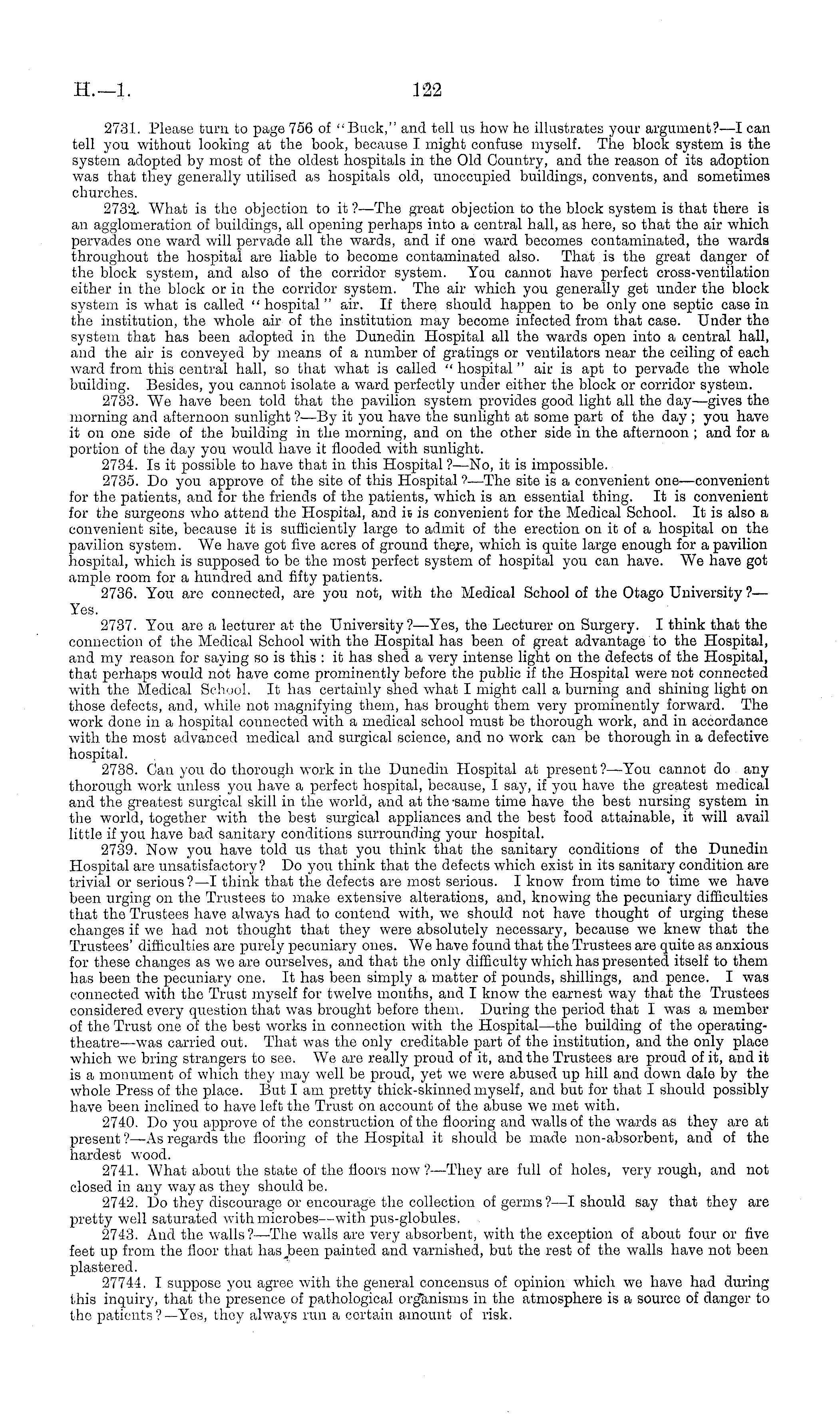 2731. Please turn to page 756 of "Buck," and tell us how he illustrates your argument?—l can tell you without looking at the book, because I might confuse myself. The block system is the system adopted by most of the oldest hospitals in the Old Country, and the reason of its adoption was that they generally utilised as hospitals old, unoccupied buildings, convents, and sometimes churches. 2733.- What is the objection to it ?—The great objection to the block system is that there is an agglomeration of buildings, all opening perhaps into a central hall, as here, so that the air which pervades one ward will pervade all the wards, and if one ward becomes contaminated, the wards throughout the hospital are liable to become contaminated also. That is the great danger of the block system, and also of the corridor system. You cannot have perfect cross-ventilation either in the block or in the corridor system. The air which you generally get under the block system is what is called " hospital " air. If there should happen to be only one septic case in the institution, the whole air of the institution may become infected from that case. Under the system that has been adopted in the Dunedin Hospital all the wards open into a central hall, and the air is conveyed by means of a number of gratings or ventilators near the ceiling of each ward from this central hall, so that what is called " hospital " air is apt to pervade the whole building. Besides, you cannot isolate a ward perfectly under either the block or corridor system. 2733. We have been told that the pavilion system provides good light all the day—gives the morning and afternoon sunlight ?—By it you have the sunlight at some part of the day ; you have it on one side of the building in the morning, and on the other side in the afternoon ; and for a portion of the day you would have it flooded with sunlight. 2734. Is it possible to have that in this Hospital ?—No, it is impossible. 2735. Do you approve of the site of this Hospital ?—The site is a convenient one—convenient for the patients, and for the friends of the patients, which is an essential thing. It is convenient for the surgeons who attend the Hospital, and his convenient for the Medical School. It is also a convenient site, because it is sufficiently large to admit of the erection on it of a hospital on the pavilion system. We have got five acres of ground theje, which is quite large enough for a pavilion hospital, which is supposed to be the most perfect system of hospital you can have. We have got ample room for a hundred and fifty patients. 2736. You are connected, are you not, with the Medical School of the Otago University ?— Yes. 2737. You are a lecturer at the University?— Yes, the Lecturer on Surgery. I think that the connection of the Medical School with the Hospital has been of great advantage to the Hospital, and my reason for saving so is this : it has shed a very intense light on the defects of the Hospital, that perhaps would not have come prominently before the public if the Hospital were not connected with the Medical School. It has certainly shed what I might call a burning and shining light on those defects, and, while not magnifying them, has brought them very prominently forward. The work done in a hospital connected with a medical school must be thorough work, and in accordance with the most advanced medical and surgical science, and no work can be thorough in a defective hospital. 2738. Can you do thorough work in the Dunedin Hospital at present ?—You cannot do any thorough work unless you have a perfect hospital, because, I say, if you have the greatest medical and the greatest surgical skill in the world, and at the -same time have the best nursing system in the world, together with the best surgical appliances and the best food attainable, it will avail little if you have bad sanitary conditions surrounding your hospital. 2739. Now you have told us that you think that the sanitary conditions of the Dunedin Hospital are unsatisfactory? Do you think that the defects which exist in its sanitary condition are trivial or serious?—l think that the defects are most serious. I know from time to time we have been urging on the Trustees to make extensive alterations, and, knowing the pecuniary difficulties that the Trustees have always had to contend with, we should not have thought of urging these changes if we had not thought that they were absolutely necessary, because we knew that the Trustees' difficulties are purely pecuniary ones. We have found that the Trustees are quite as anxious for these changes as we are ourselves, and that the only difficulty which has presented itself to them has been the pecuniary one. It has been simply a matter of pounds, shillings, and pence. I was connected with the Trust myself for twelve mouths, and I know the earnest way that the Trustees considered every question that was brought before them. During the period that I was a member of the Trust one of the best works in connection with the Hospital —the building of the operatingtheatre—was carried out. That was the only creditable part of the institution, and the only place which we bring strangers to see. We are really proud of it, and the Trustees are proud of it, and it is a monument of which they may well be proud, yet we were abused up hill and down dale by the whole Press of the place. But lam pretty thick-skinned myself, and but for that I should possibly have been inclined to have left the Trust on account of the abuse we met with. 2740. Do you approve of the construction of the flooring and walls of the wards as they are at present ?—As regards the flooring of the Hospital it should be made non-absorbent, and of the hardest wood. 2741. What about the state of the floors now ?—They are full of holes, very rough, and not closed in any way as they should be. 2742. Do they discourage or encourage the collection of germs?—l should say that they a