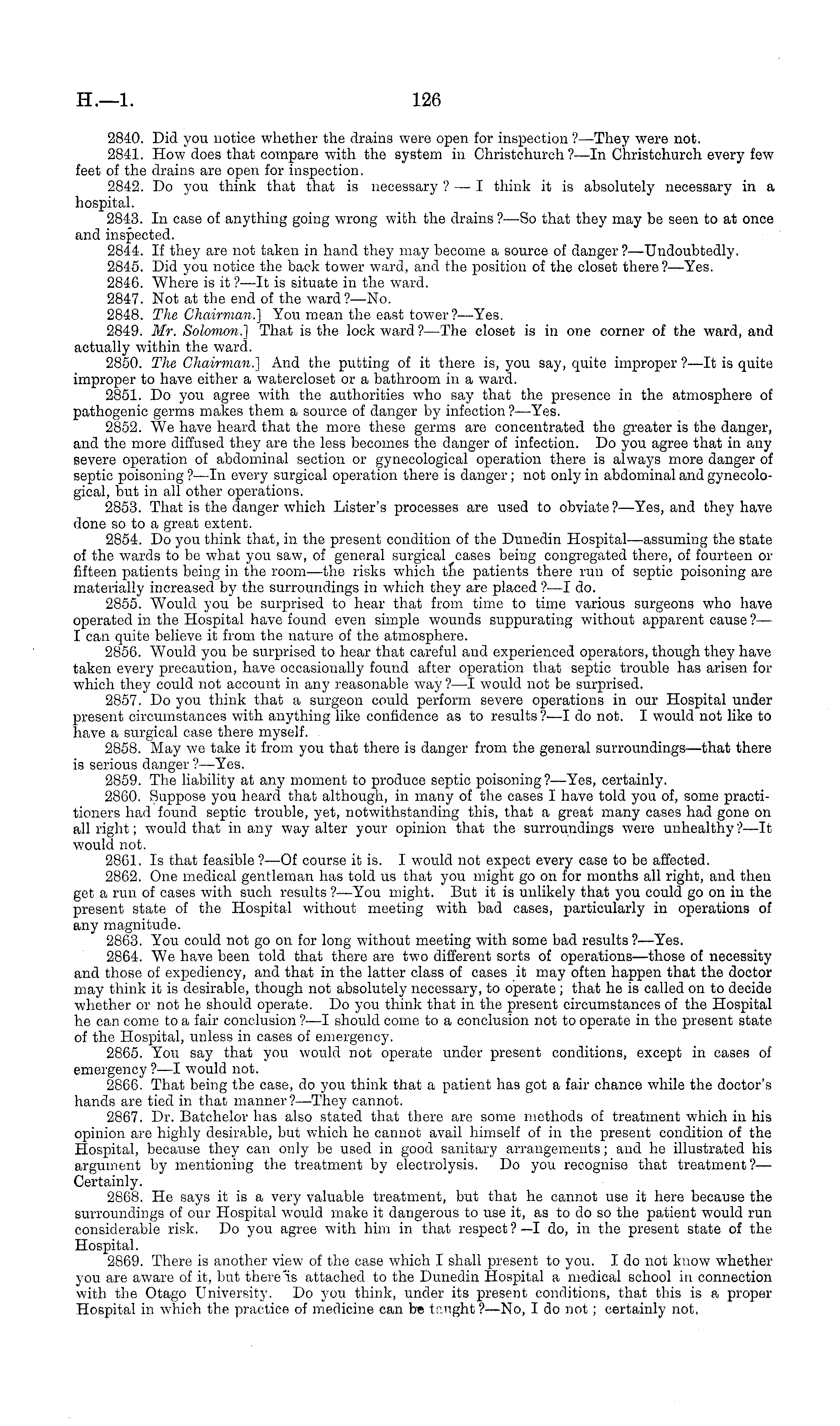 2840. Did you notice whether the drains were open for inspection ?—They were not. 2841. How does that compare with the system in Christchurch ?—ln Christchurch every few feet of the drains are open for inspection. 2842. Do you think that that is necessary ?— I think it is absolutely necessary in a hospital. 2843. In case of anything going wrong with the drains ?—So that they may be seen to at once and inspected. 2844. If they are not taken in hand they may become a source of danger ?—Undoubtedly. 2845. Did you notice the back tower ward, and the position of the closet there ?—Yes. 2846. Where is it ?—lt is situate in the ward. 2847. Not at the end of the ward?— No. 2848. The Chairman.] You mean the east tower ? —Yes. 2849. Mr. Solomon.] That is the lock ward?— The closet is in one corner of the ward, and actually within the ward. 2850. The Chairman.] And the putting of it there is, you say, quite improper ?—lt is quite improper to have either a watercloset or a bathroom in a ward. 2851. Do you agree with the authorities who say that the presence in the atmosphere of pathogenic germs makes them a source of danger by infection ? —Yes. 2852. We have heard that the more these germs are concentrated the greater is the danger, and the more diffused they are the less becomes the danger of infection. Do you agree that in any severe operation of abdominal section or gynecological operation there is always more danger of septic poisoning ? —ln every surgical operation there is danger; not only in abdominal and gynecological, but in all other operations. 2853. That is the danger which Lister's processes are used to obviate ? —Yes, and they have done so to a great extent. 2854. Do you think that, in the present condition of the Dunedin Hospital—assuming the state of the wards to be what you saw, of general surgical cases being congregated there, of fourteen or fifteen patients being in the room—the risks which the patients there run of septic poisoning are materially increased by the surroundings in which they are placed ?—I do. 2855. Would you be surprised to hear that from time to time various surgeons who have operated in the Hospital have found even simple wounds suppurating without apparent cause ? — I can quite believe it from the nature of the atmosphere. 2856. Would you be surprised to hear that careful and experienced operators, though they have taken every precaution, have occasionally found after operation that septic trouble has arisen for which they could not account in any reasonable way ?—I would not be surprised. 2857. Do you think that a surgeon could perform severe operations in our Hospital under present circumstances with anything like confidence as to results?—l do not. I would not like to have a surgical case there myself. 2858. May we take it from you that there is danger from the general surroundings—that there is serious danger ?—Yes. 2859. The liability at any moment to produce septic poisoning?— Yes, certainly. 2860. Suppose you heard that although, in many of the cases I have told you of, some practitioners had found septic trouble, yet, notwithstanding this, that a great many cases had gone on all right; would that in any way alter your opinion that the surroundings were unhealthy?—lt would not. 2861. Is that feasible ? —Of course it is. I would not expect every case to be affected. 2862. One medical gentleman has told us that you might go on for months all right, and then get a run of cases with such results?— You might. But it is unlikely that you could go on in the present state of the Hospital without meeting with bad cases, particularly in operations of any magnitude. 2863. You could not go on for long without meeting with some bad results ?—Yes. 2864. We have been told that there are two different sorts of operations—those of necessity and those of expediency, and that in the latter class of cases it may often happen that the doctor may think it is desirable, though not absolutely necessary, to operate; that he is called on to decide whether or not he should operate. Do you think that in the present circumstances of the Hospital he can come to a fair conclusion ?—I should come to a conclusion not to operate in the present state of the Hospital, unless in cases of emergency. 2865. You say that you would not operate under present conditions, except in cases of emergency ?—I would not. 2866. That being the case, do you think that a patient has got a fair chance while the doctor's hands are tied in that manner?— They cannot. 2867. Dr. Batchelor has also stated that there are some methods of treatment which in his opinion are highly desirable, but which he cannot avail himself of in the present condition of the Hospital, because they can only be used in good sanitary arrangements; and he illustrated his argument by mentioning the treatment by electrolysis. Do you recognise that treatment?— Certainly. 2868. He says it is a very valuable treatment, but that he cannot use it here because the surroundings of our Hospital would make it dangerous to use it, as to do so the patient would run considerable risk. Do you agree with him in that respect ?—I do, in the present state of the Hospital. 2869. There is another view of the ease which I shall present to you. Ido not know whether you are aware of it, but there'is attached to the Dunedin Hospital a medical school in connection with the Otago University. Do you think, under its present conditions, that this is a proper Hospital in which the practice of medicine can be tr.nght ?—No, I do not ; certainly not,